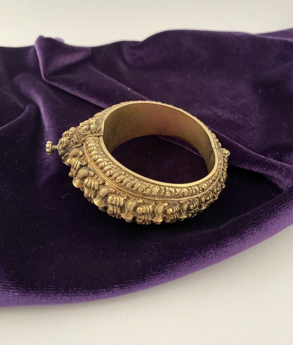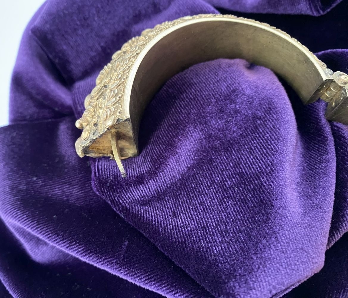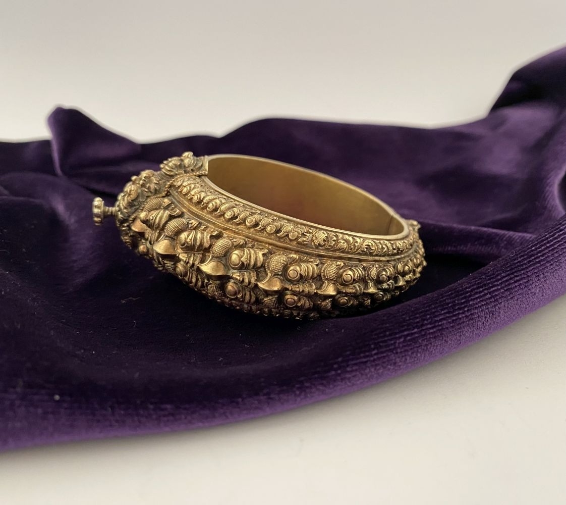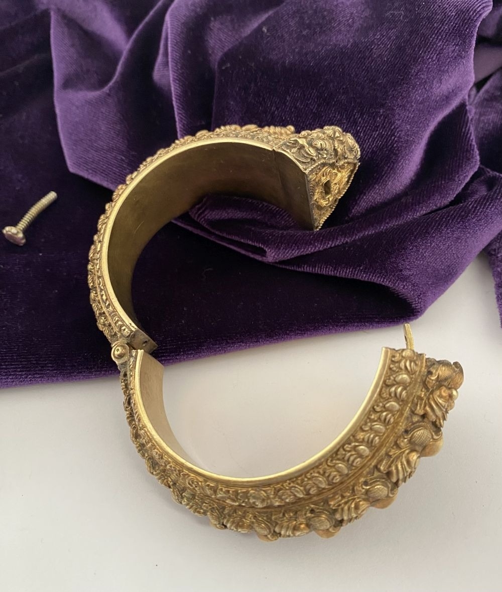 AN INTRICATE SOUTHERN INDIAN BANGLE BRACELET, intricate sculptural piece depicting heads of makara (mythical sea creatures). Similar in form and design to Southern Indian bangle c.1850 in the Royal Collection trust. No visible makers marks possibly gilt silver.