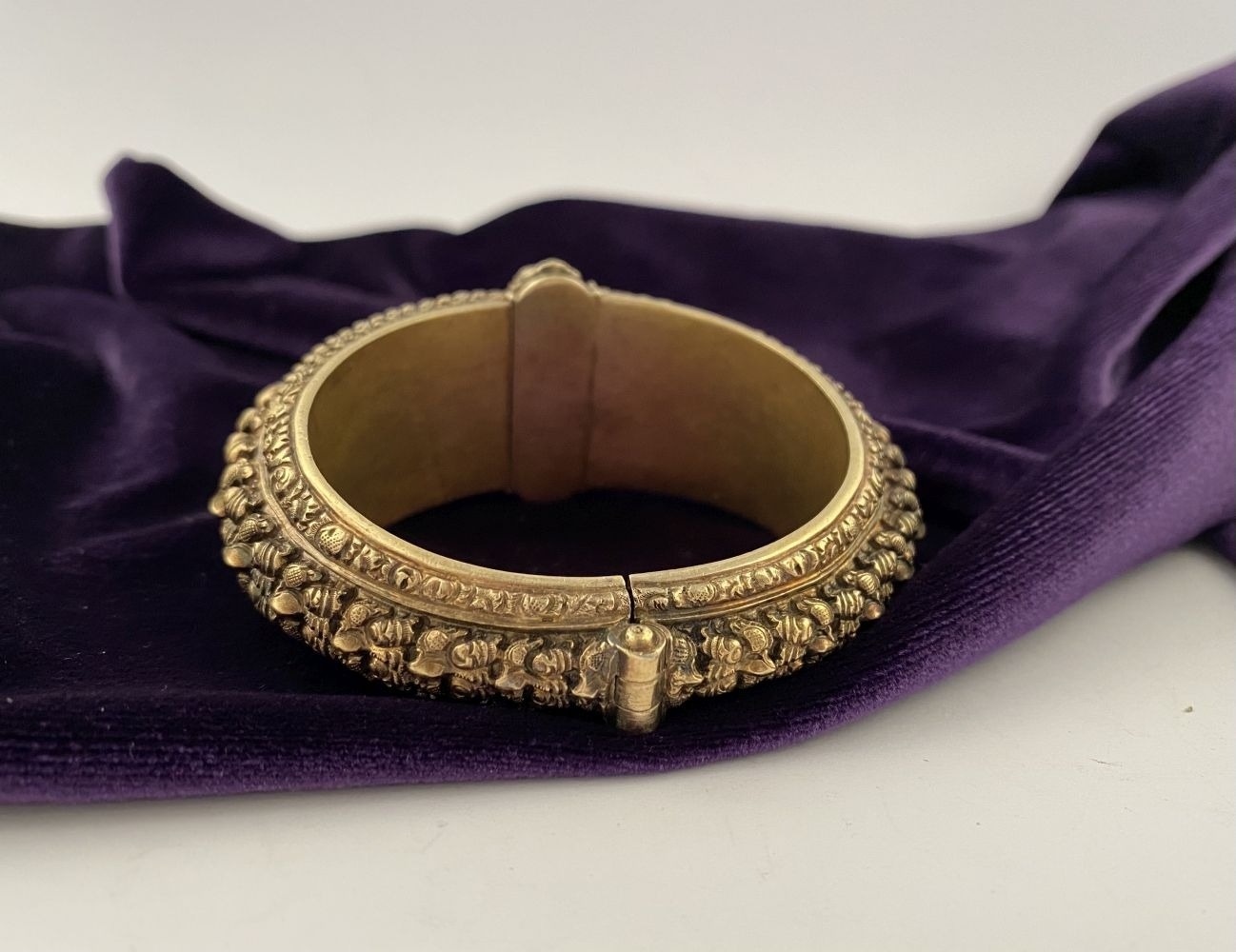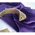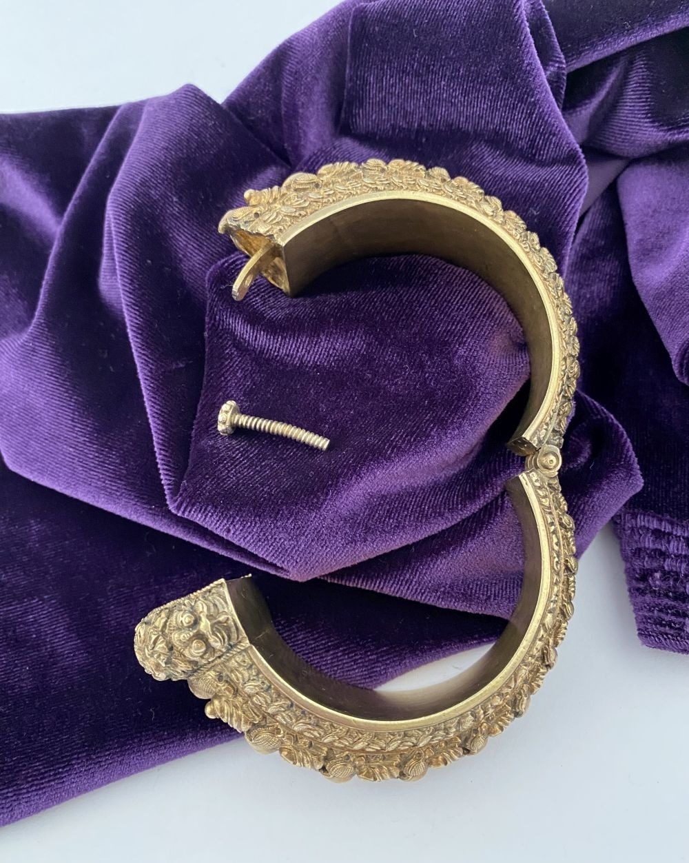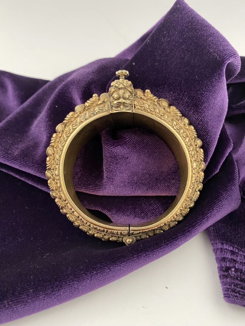 AN INTRICATE SOUTHERN INDIAN BANGLE BRACELET, intricate sculptural piece depicting heads of makara (mythical sea creatures). Similar in form and design to Southern Indian bangle c.1850 in the Royal Collection trust. No visible makers marks possibly gilt silver.