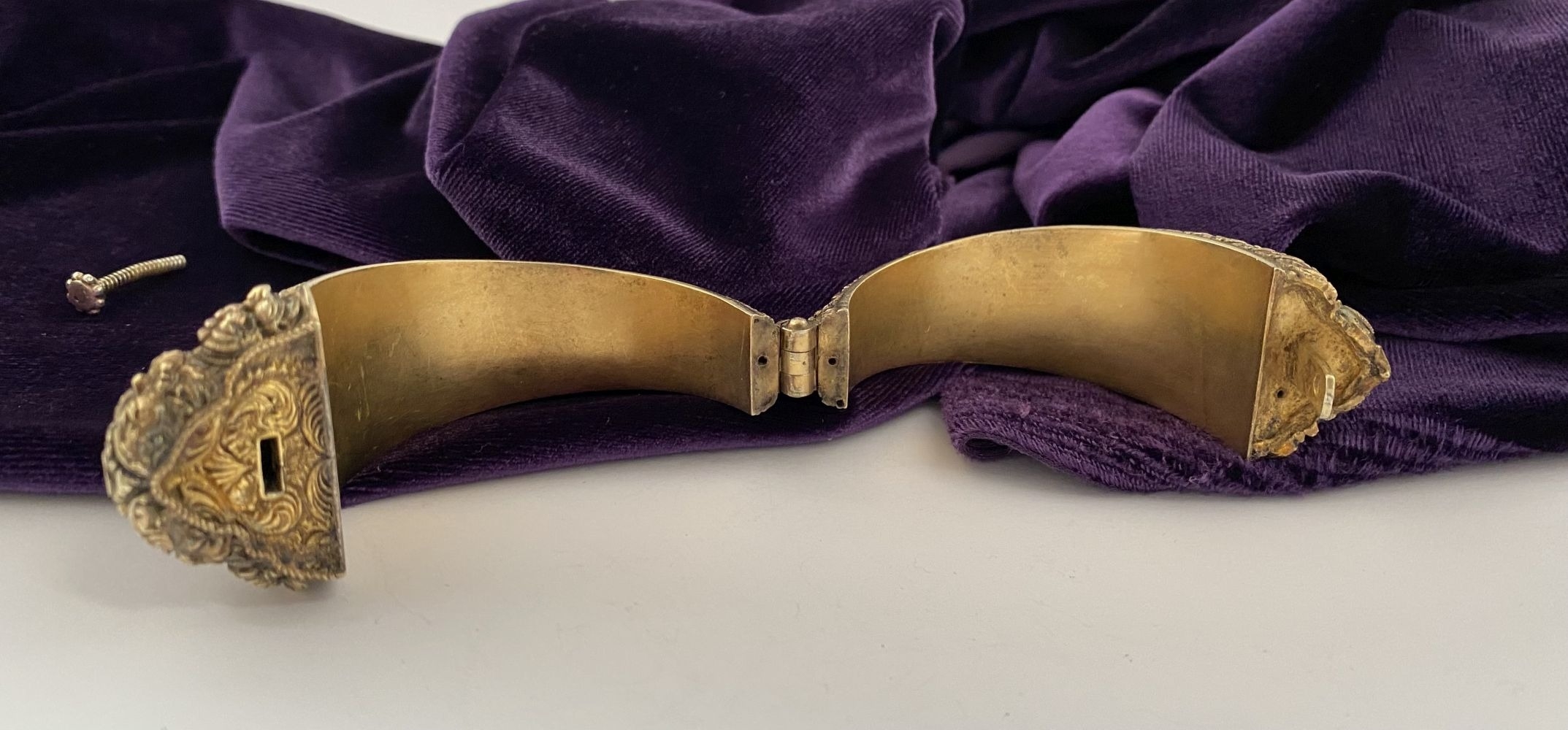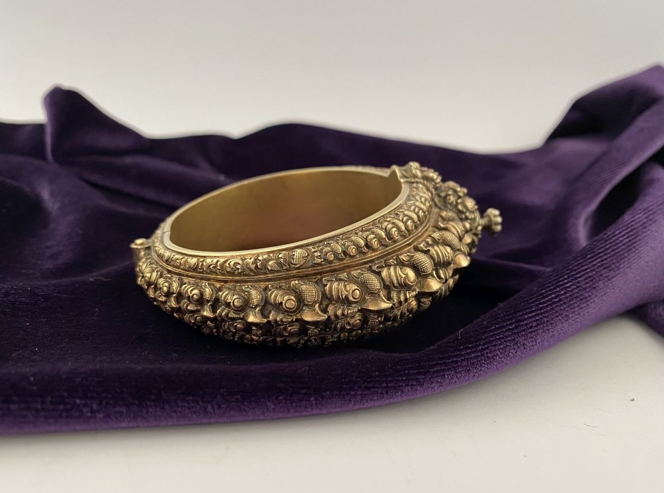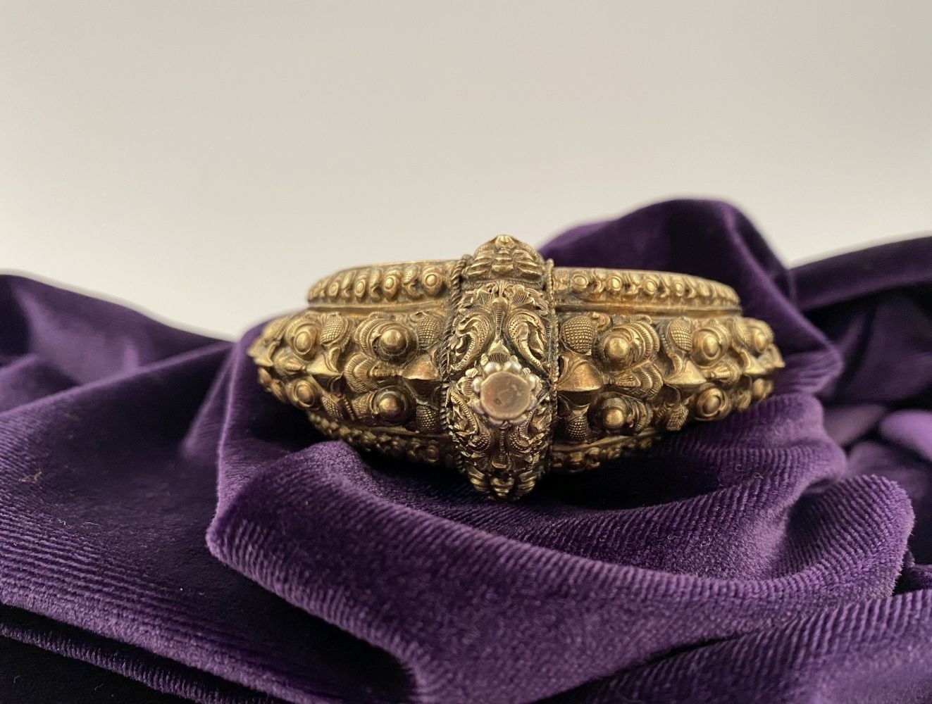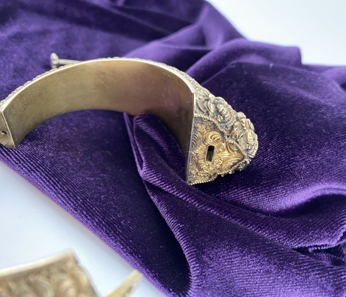 AN INTRICATE SOUTHERN INDIAN BANGLE BRACELET, intricate sculptural piece depicting heads of makara (mythical sea creatures). Similar in form and design to Southern Indian bangle c.1850 in the Royal Collection trust. No visible makers marks possibly gilt silver.