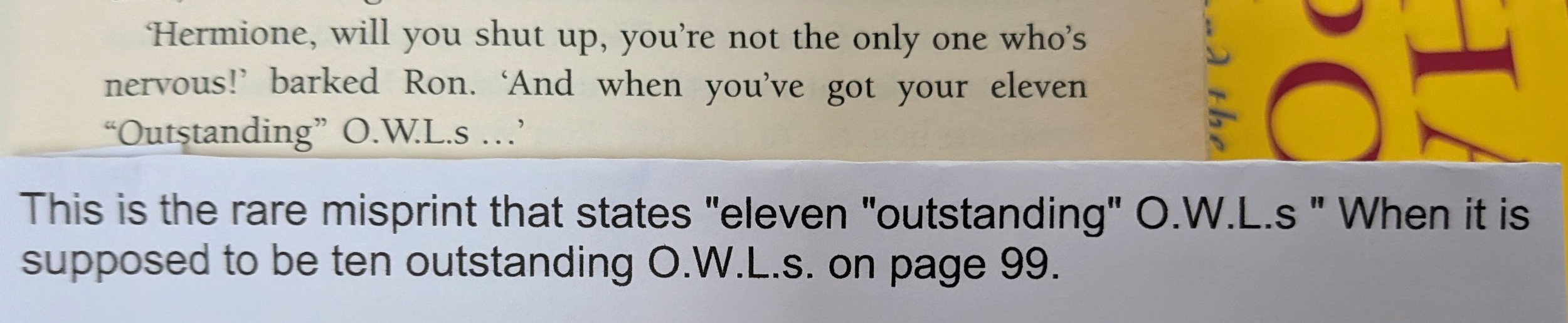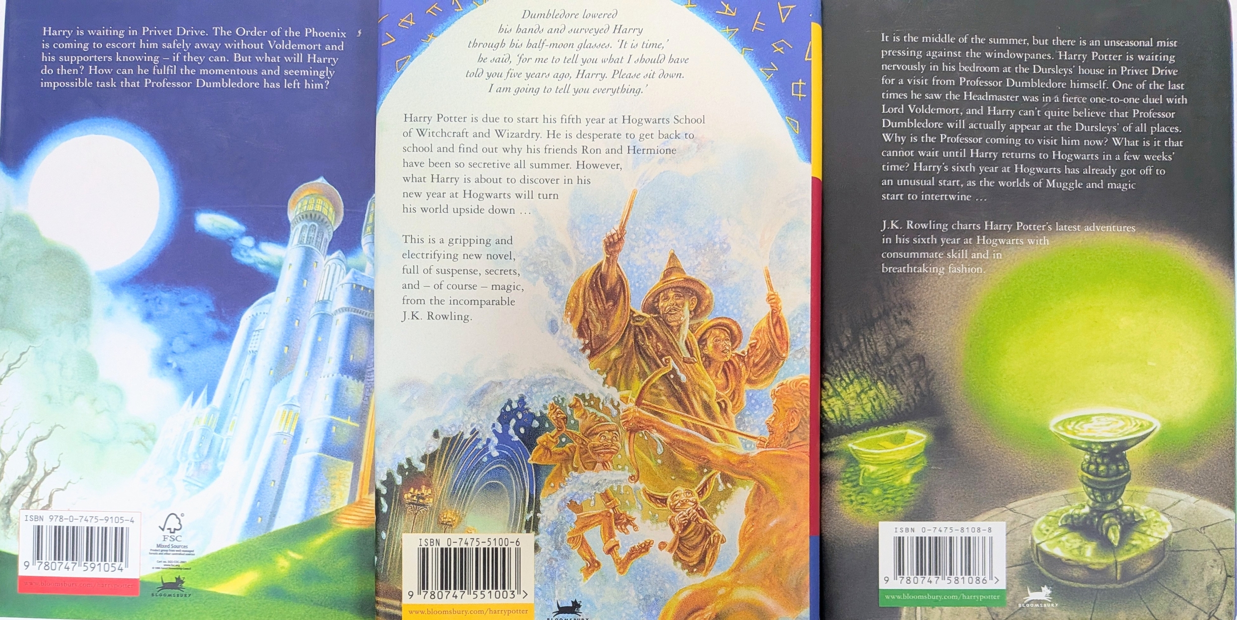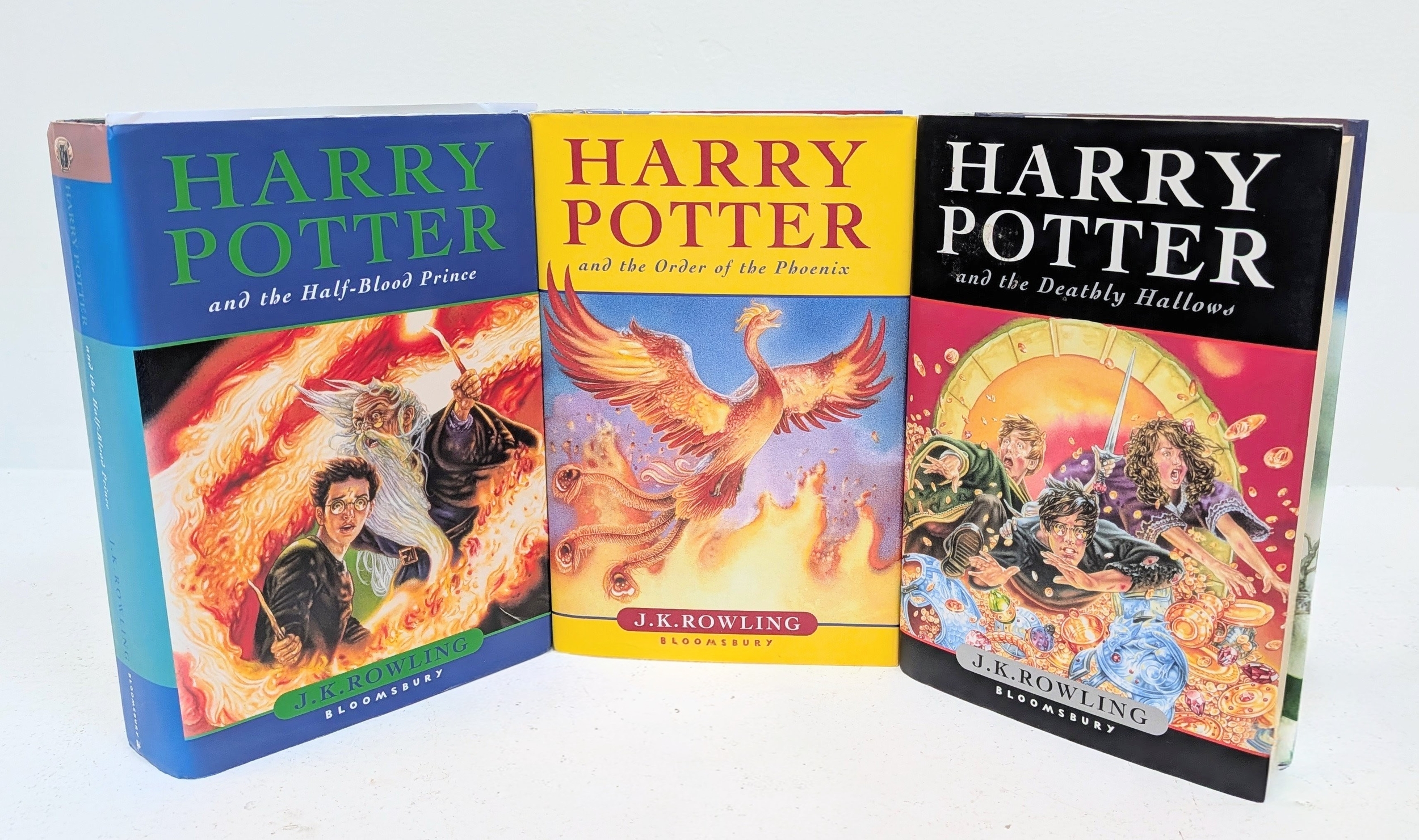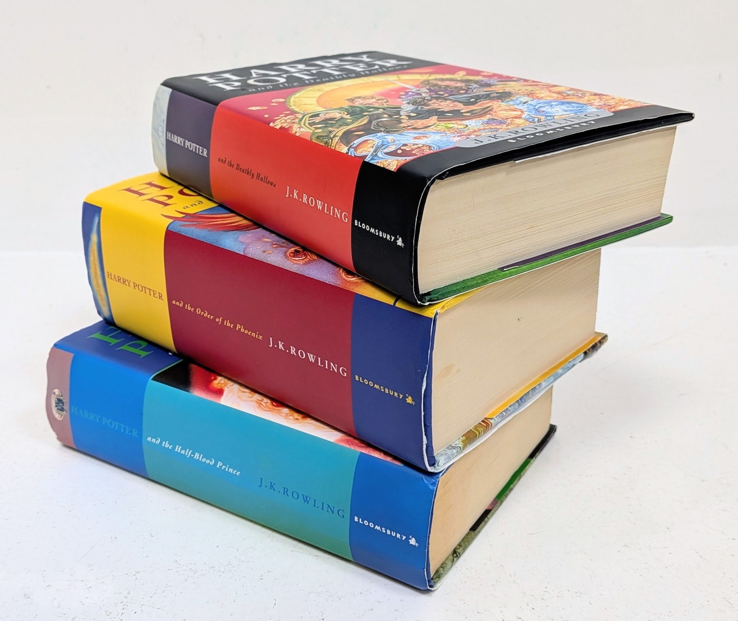 Three First Edition Harry Potter Hardback Books Including the Misprint Version of Harry Potter and the Half Blood Prince with the Typo on page 99 Stating Eleven Outstanding Owls when it should read Ten. The two other first editions are Harry Potter and The Order of the Phoenix & Harry Potter and the Deathly Hallows