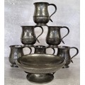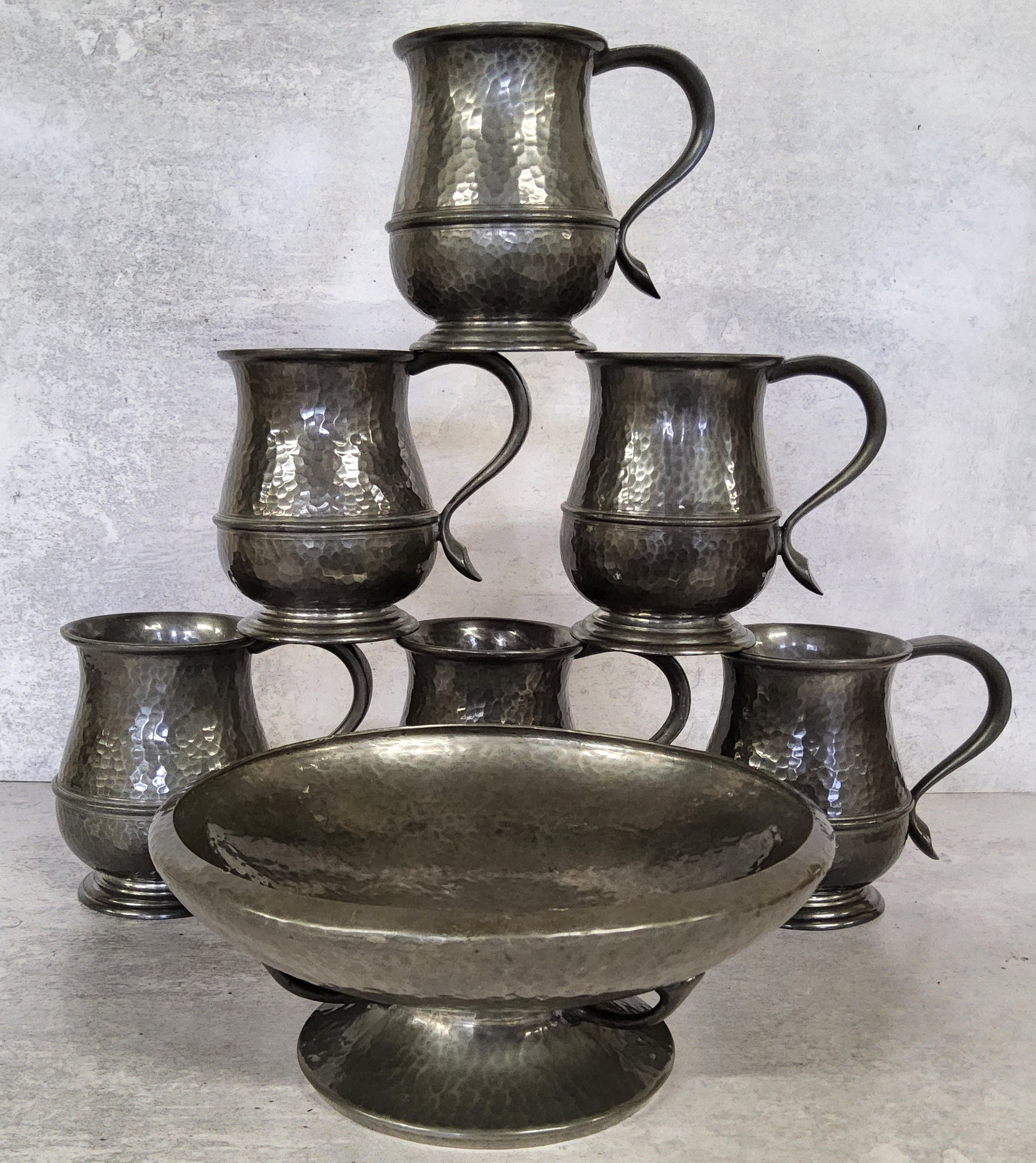 A Tudric Pewter pedestal bowl with sinuous supports, hammered finish, stamped and numbered 01349, 20cms dia. x 8.5cms h; six Tudric Pewter tankard, ribbed waist, swan handle, hammered finish, stamped and numbered 01376;