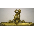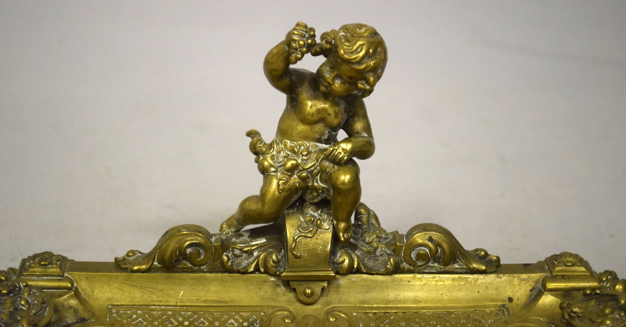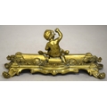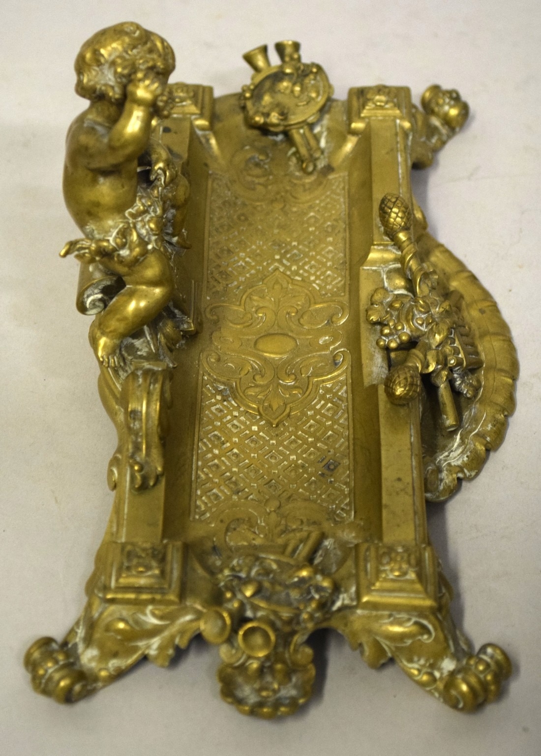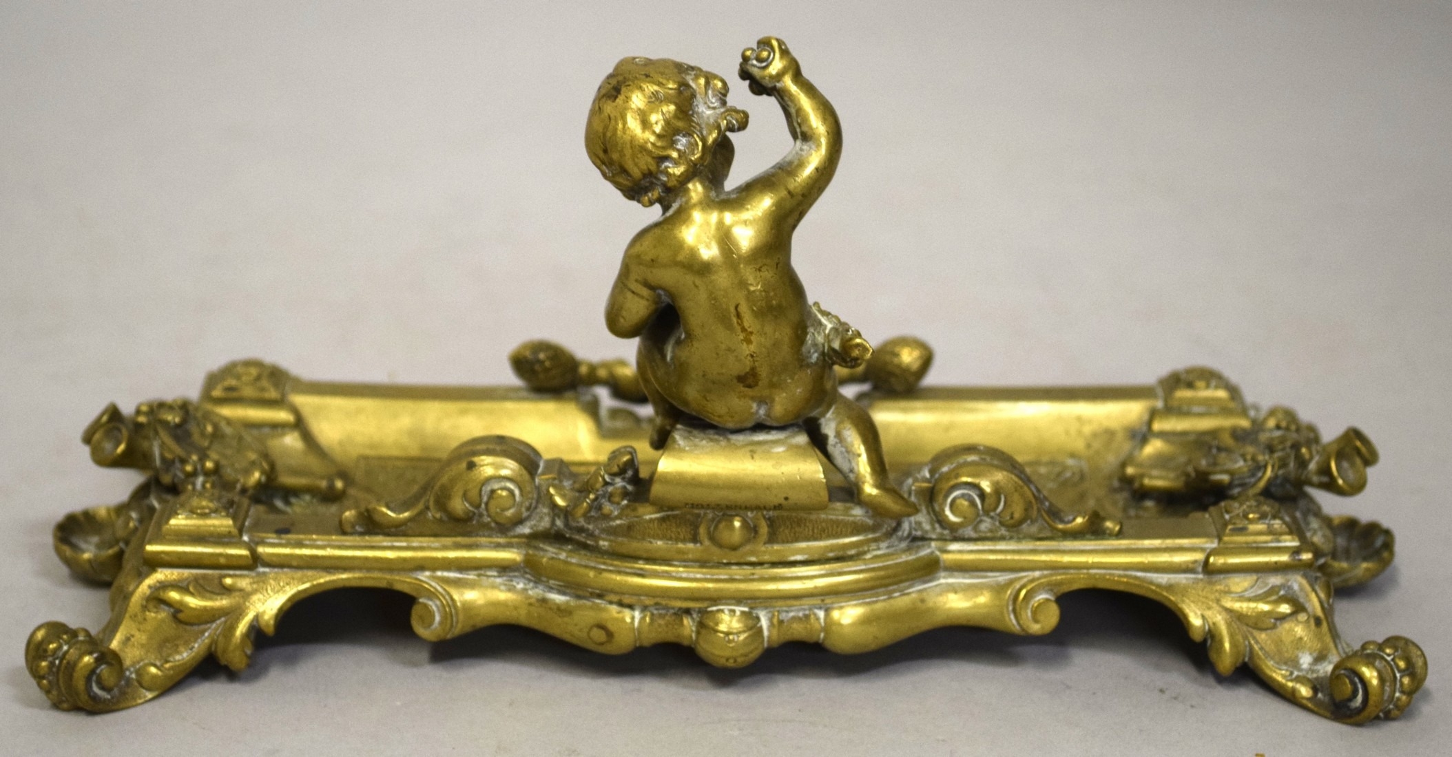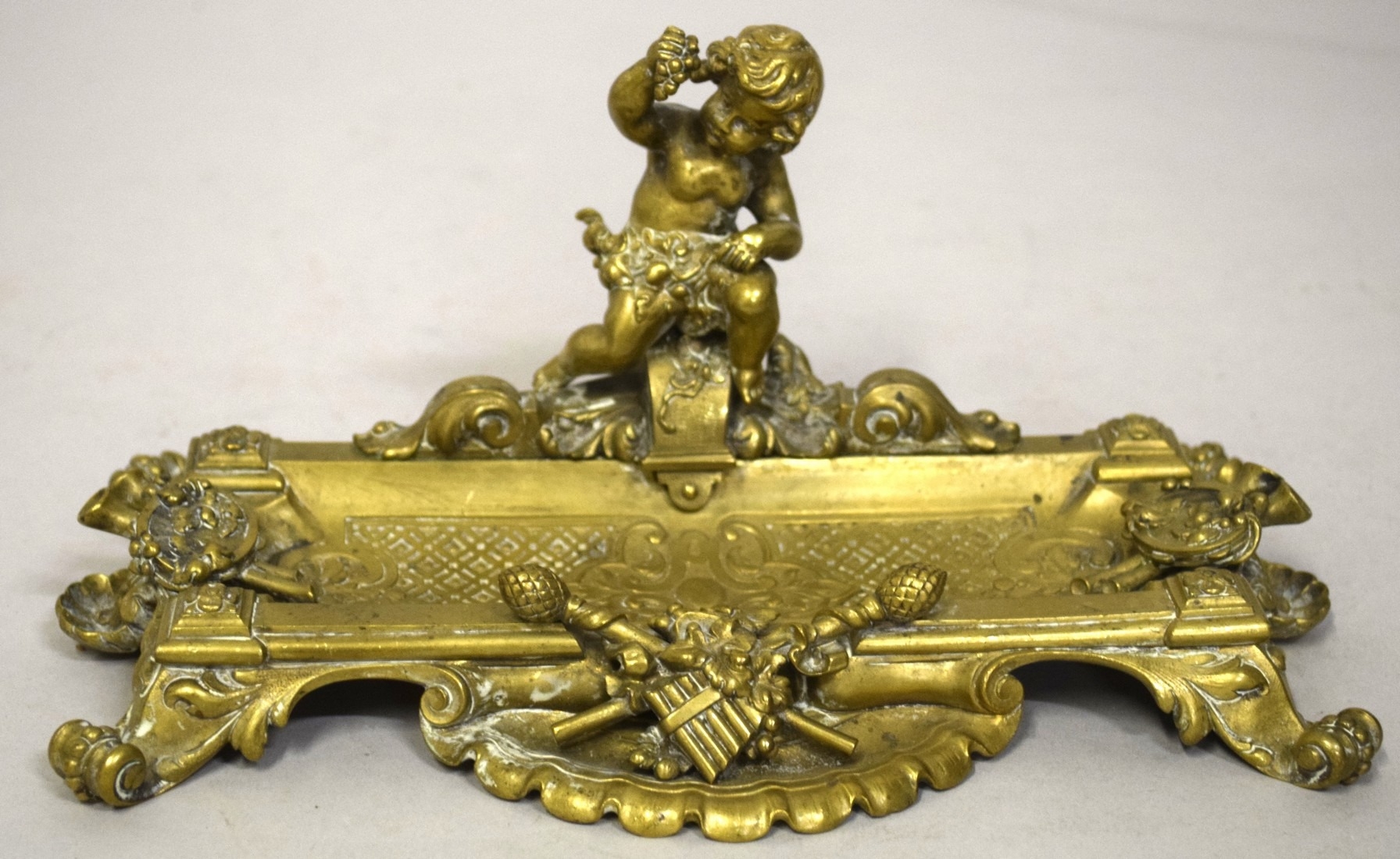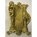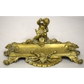 A GOOD BRASS PEN TRAY with cupid and trophies, on four curving feet. 9ins long.