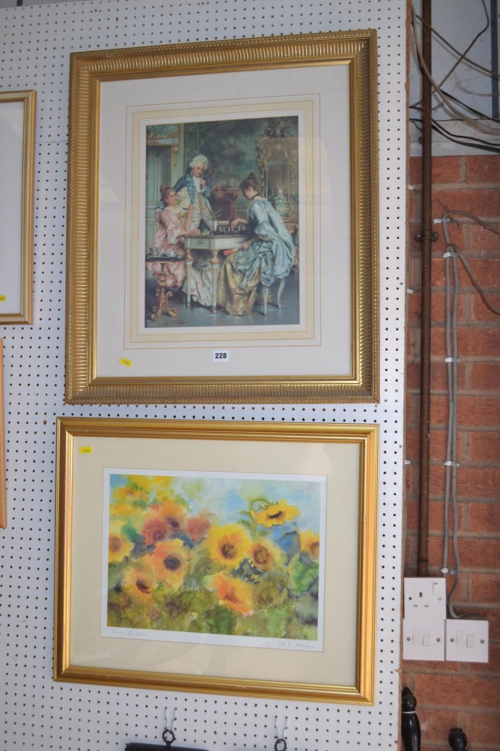 COLOURED PRINT "CHECK MATE" IN GILT FRAME AND COLOURED PRINT "FROHES LEUCHTEN" AFTER HERTENS