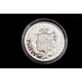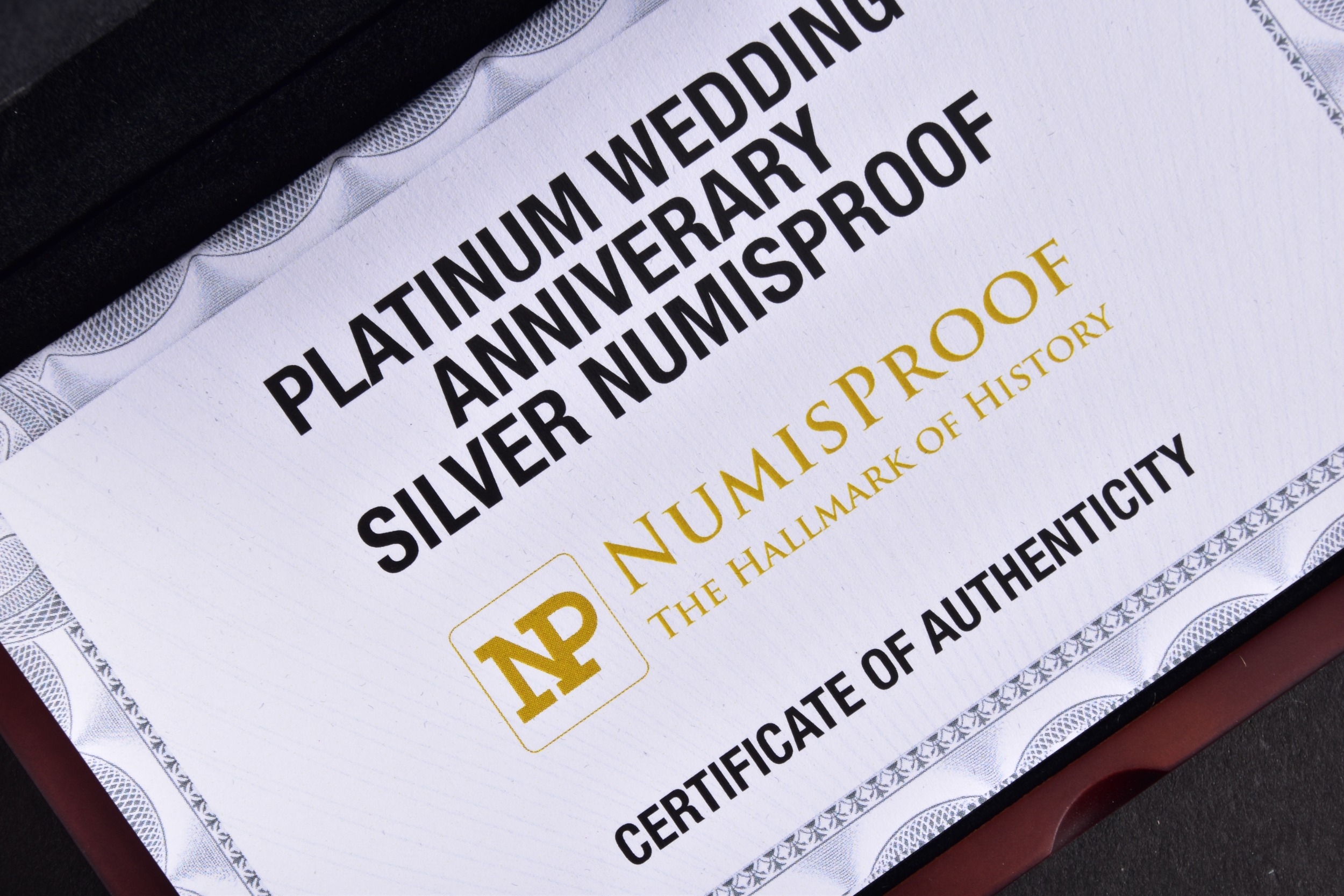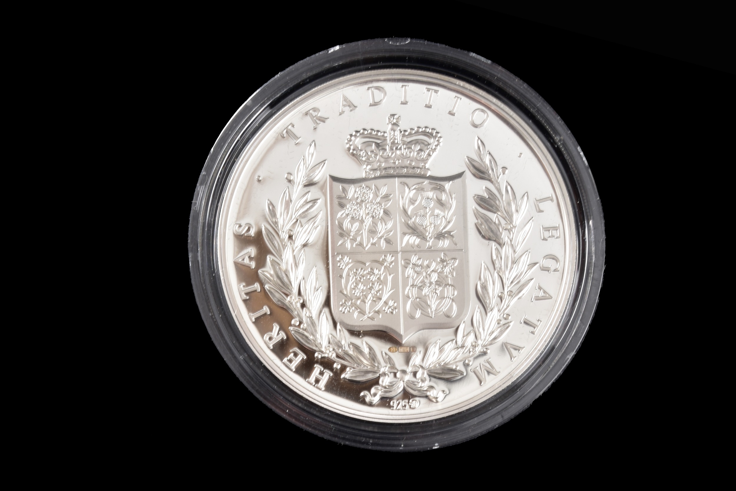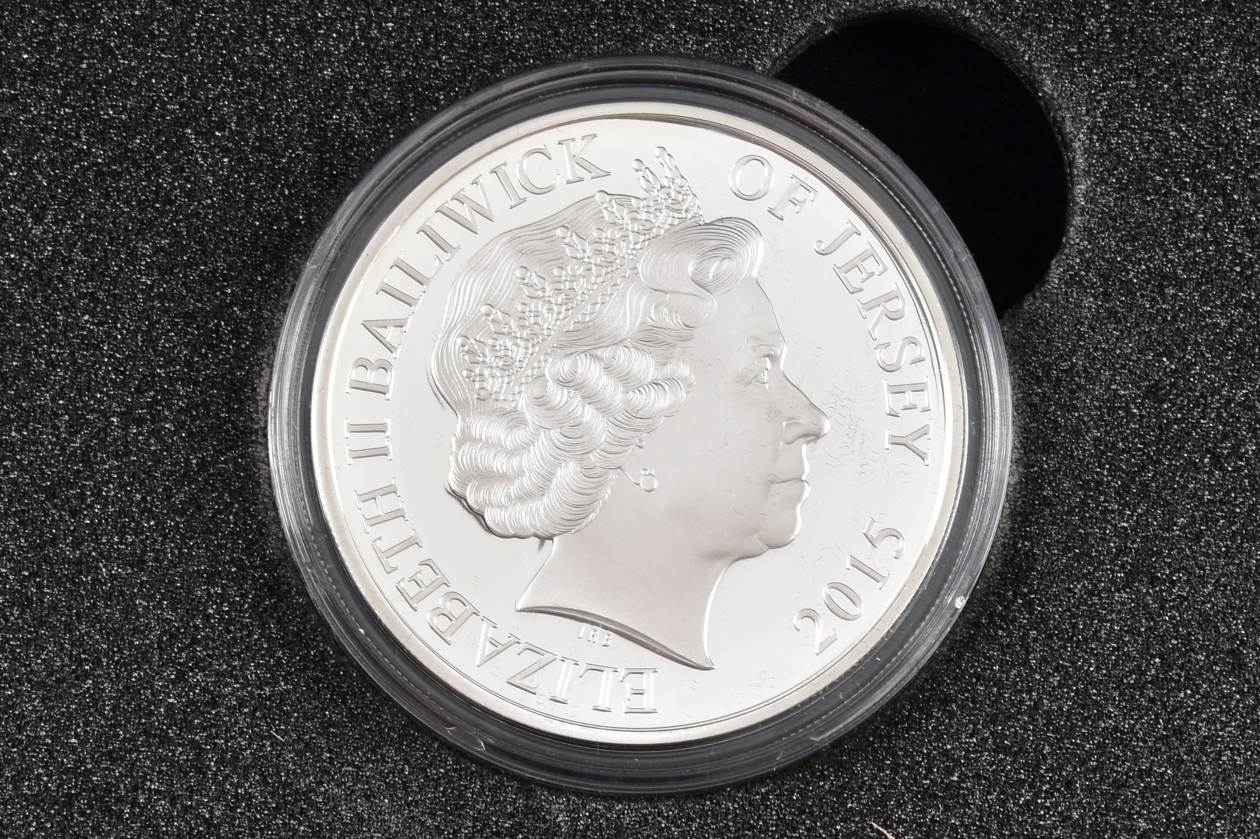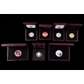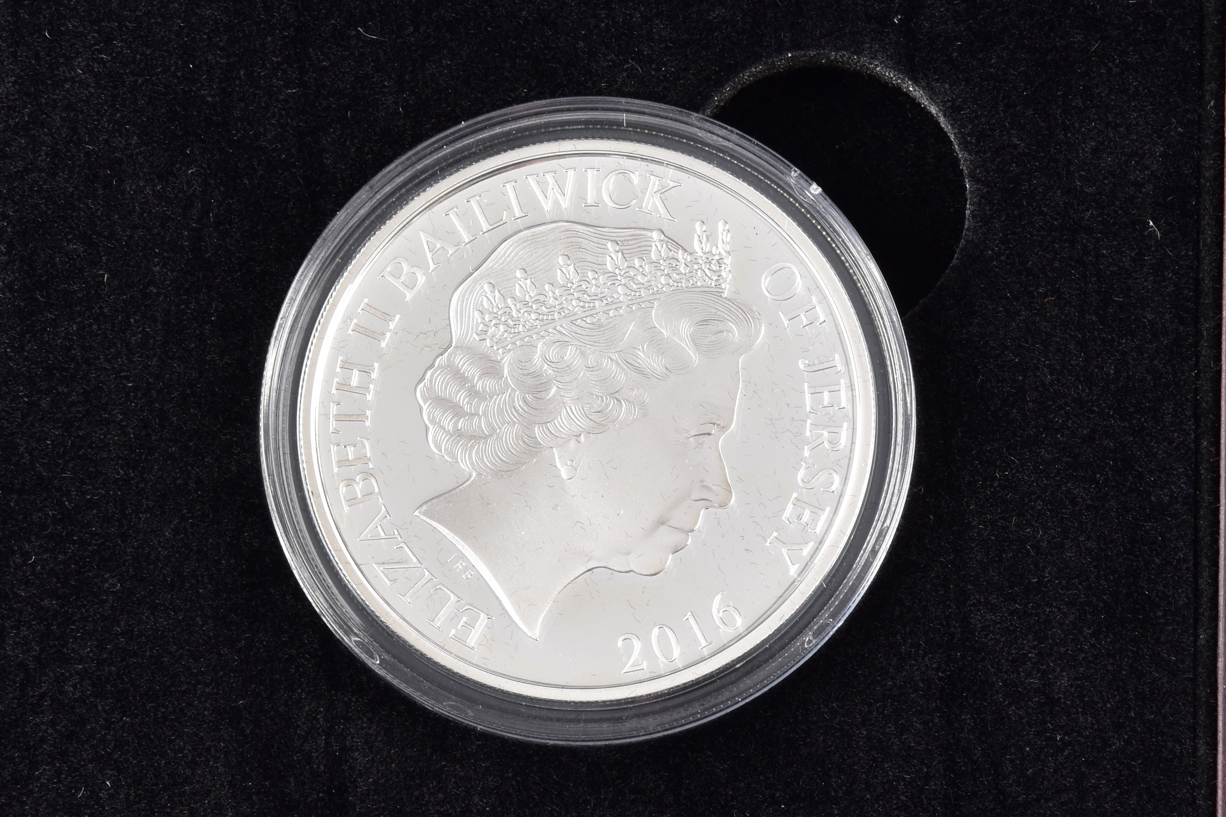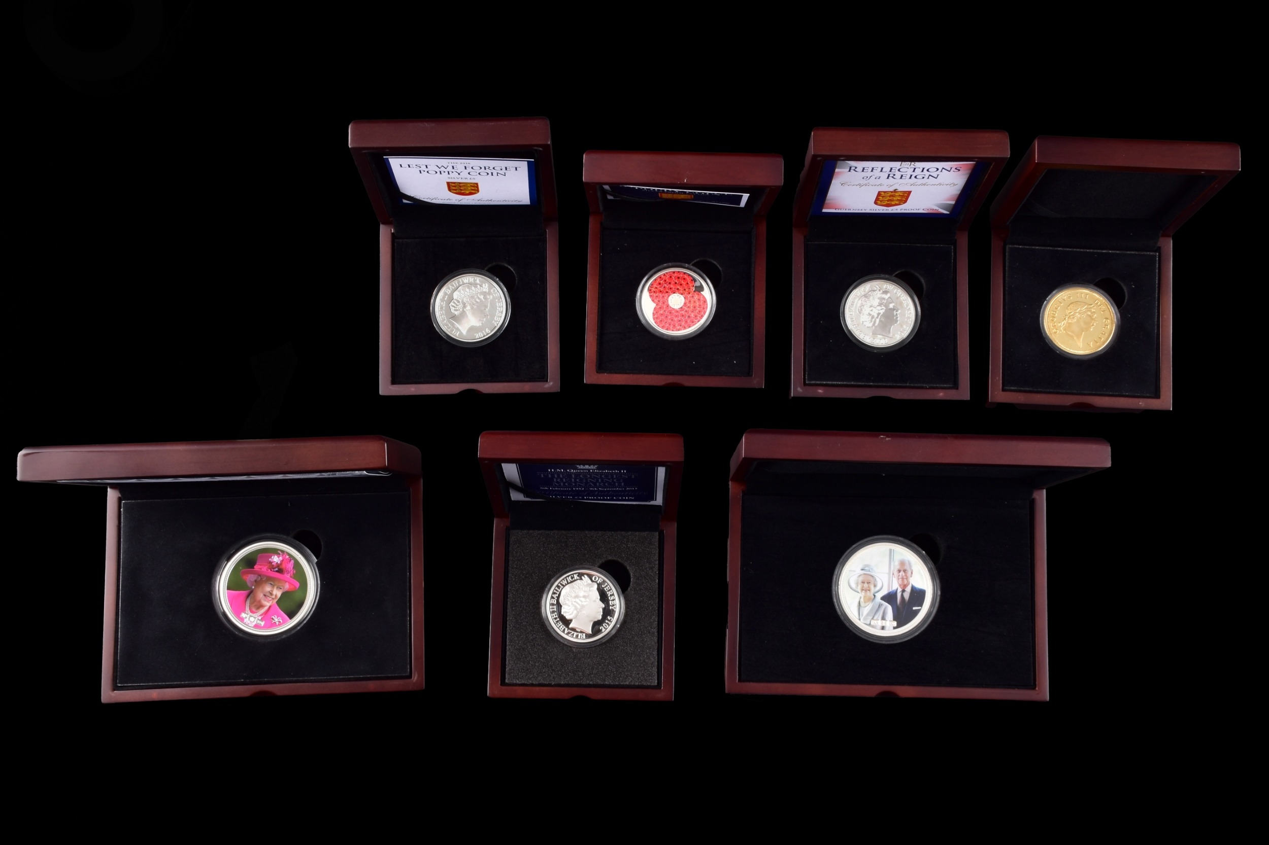 A collection of silver coins including H.M. Queen Elizabeth II 'the longest reigning monarch' silver £5 proof coin, a 2016 'Lest we forget' poppy silver £5 coin, a 2018 Remembrance poppy silver £5 coin, a 'Reflections of a Reign' Guernsey silver £5 coin, a platinum wedding anniversary silver numisproof coin, a 'The Queens 90th Birthday silver and diamond numisproof' coin, along with a gold plated replica of the 1813 British Military Guinea, all in presentation boxes (7)