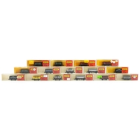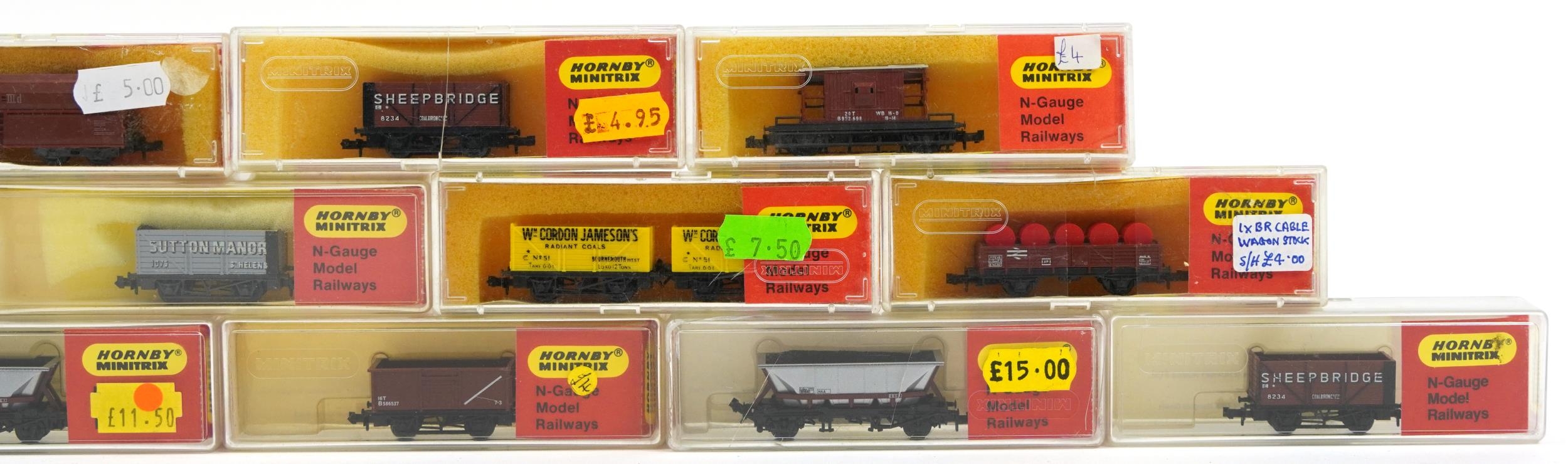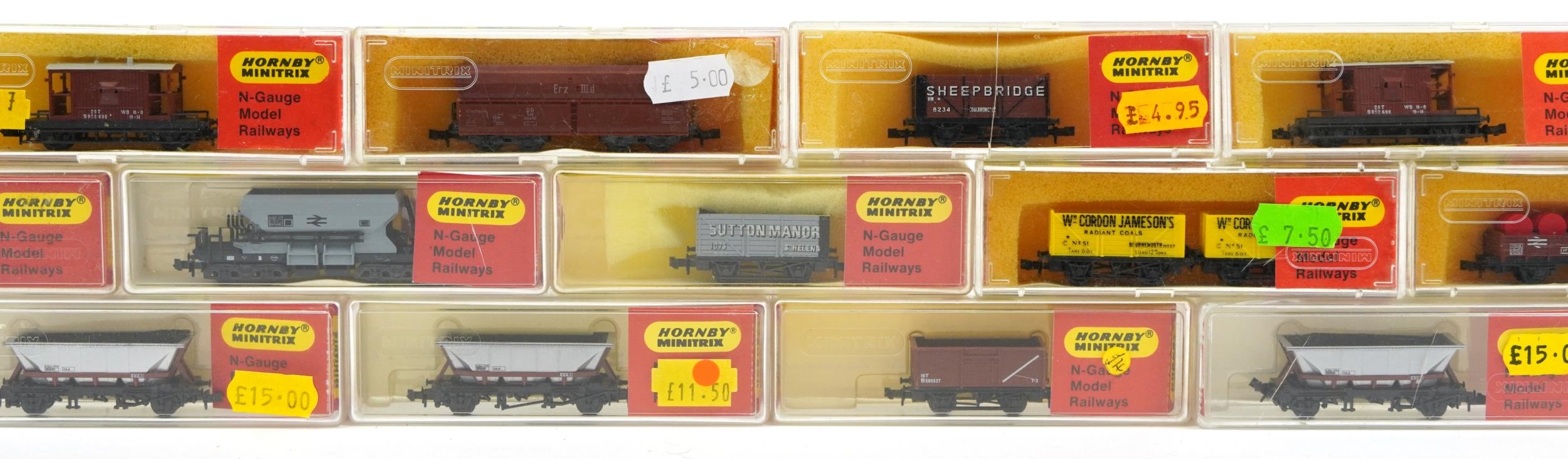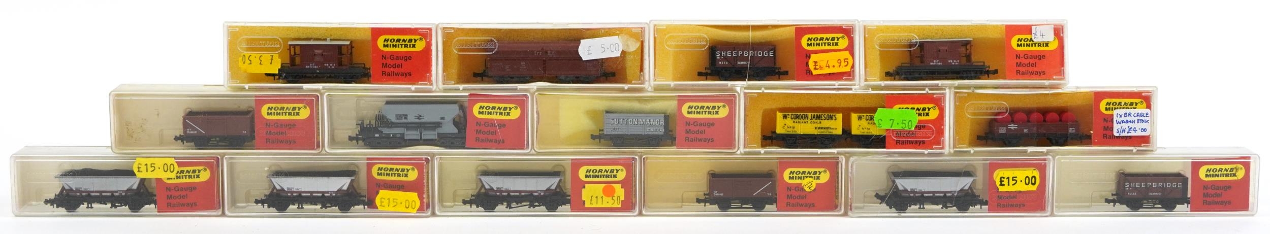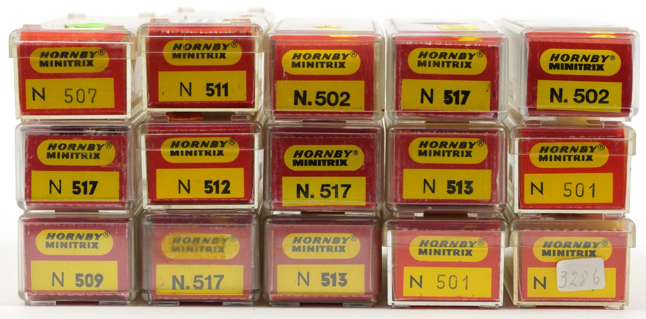 Fifteen Hornby Minitrix N gauge model railway wagons with cases