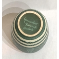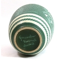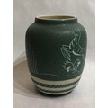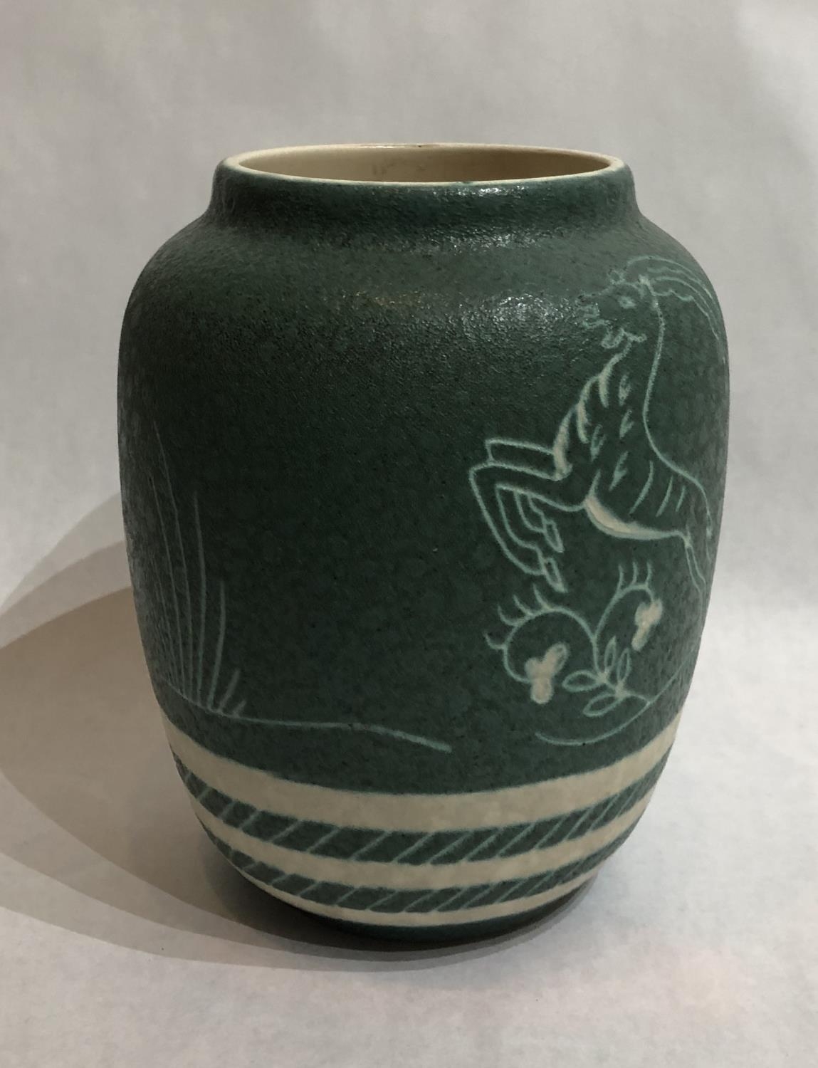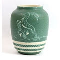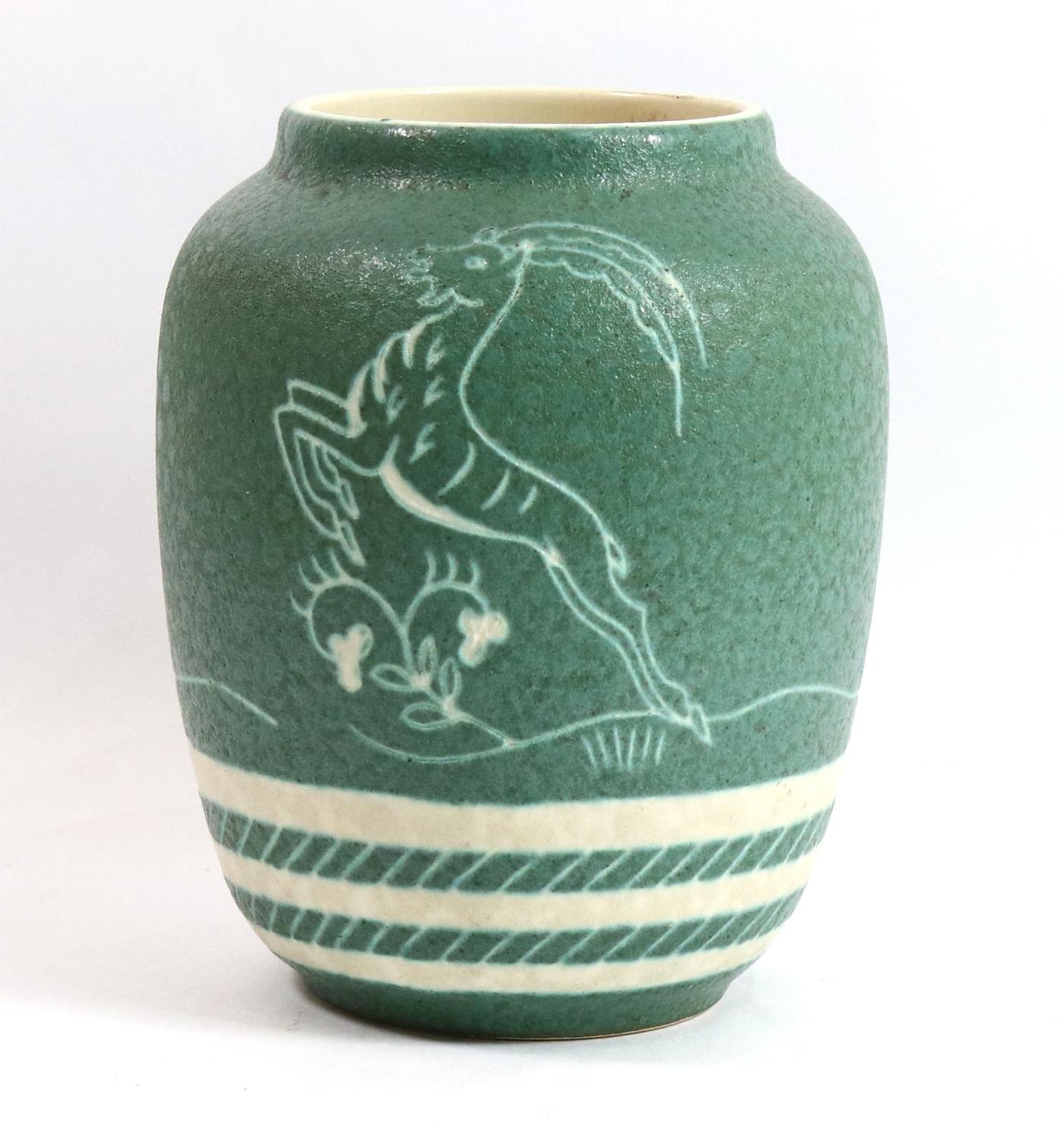 Sgrafitto decorated with leaping gazelles amidst foliage and fauna, in simplistic style, against a matt sage green ground with cream banding to foot, hand engraved factory marks to underside.