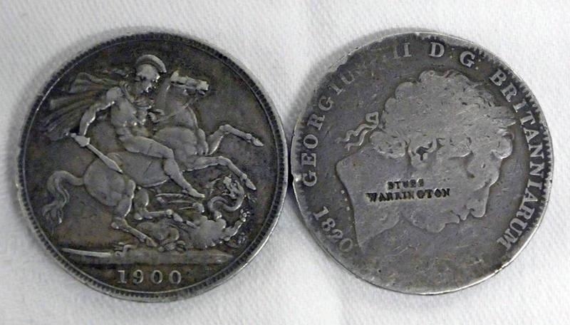 1820 GEORGE III CROWN, STAMPED & 1900 VICTORIA CROWN