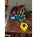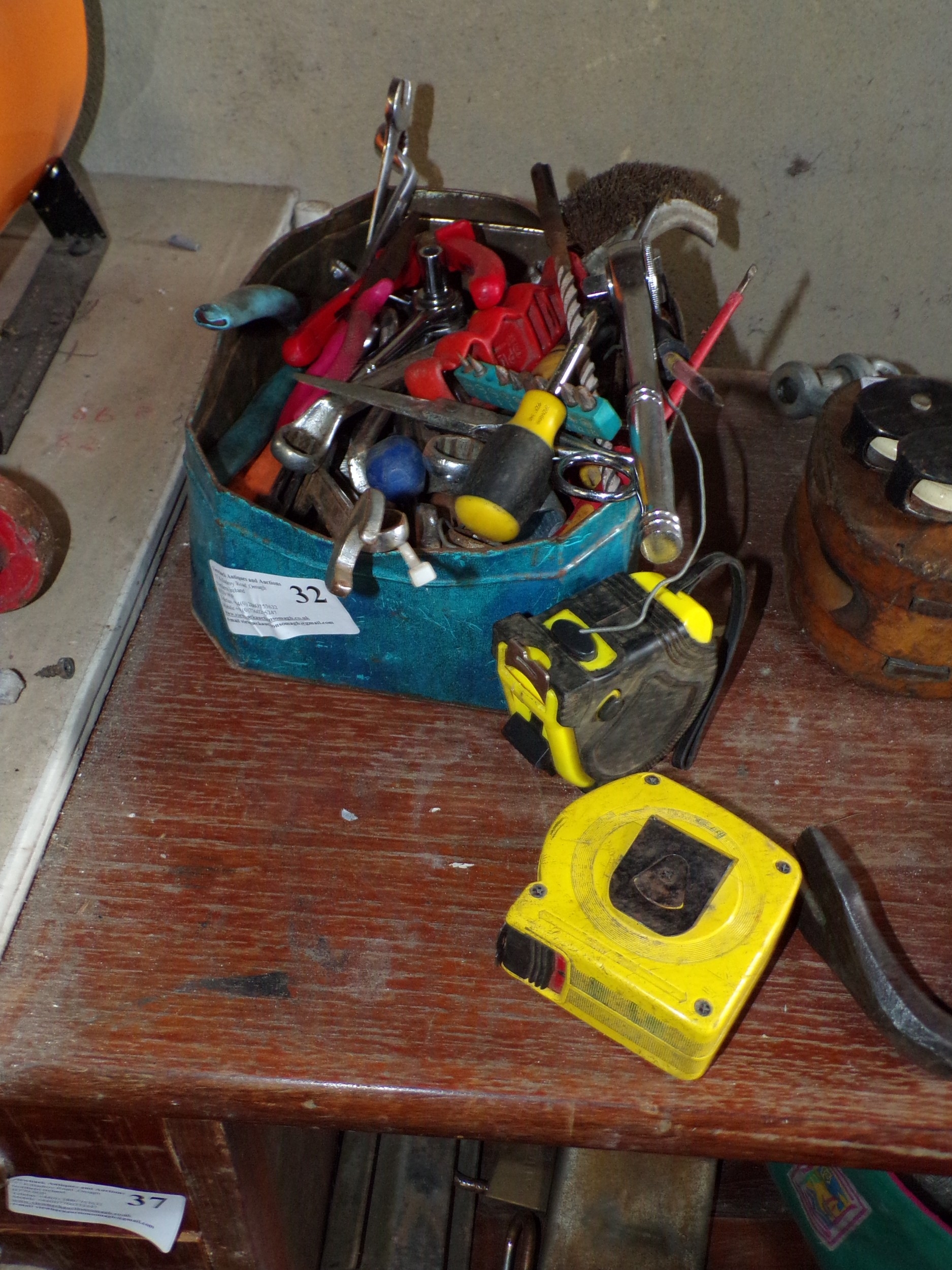 BOX - TOOLS, MEASURING TAPES, HAMMER ETC.