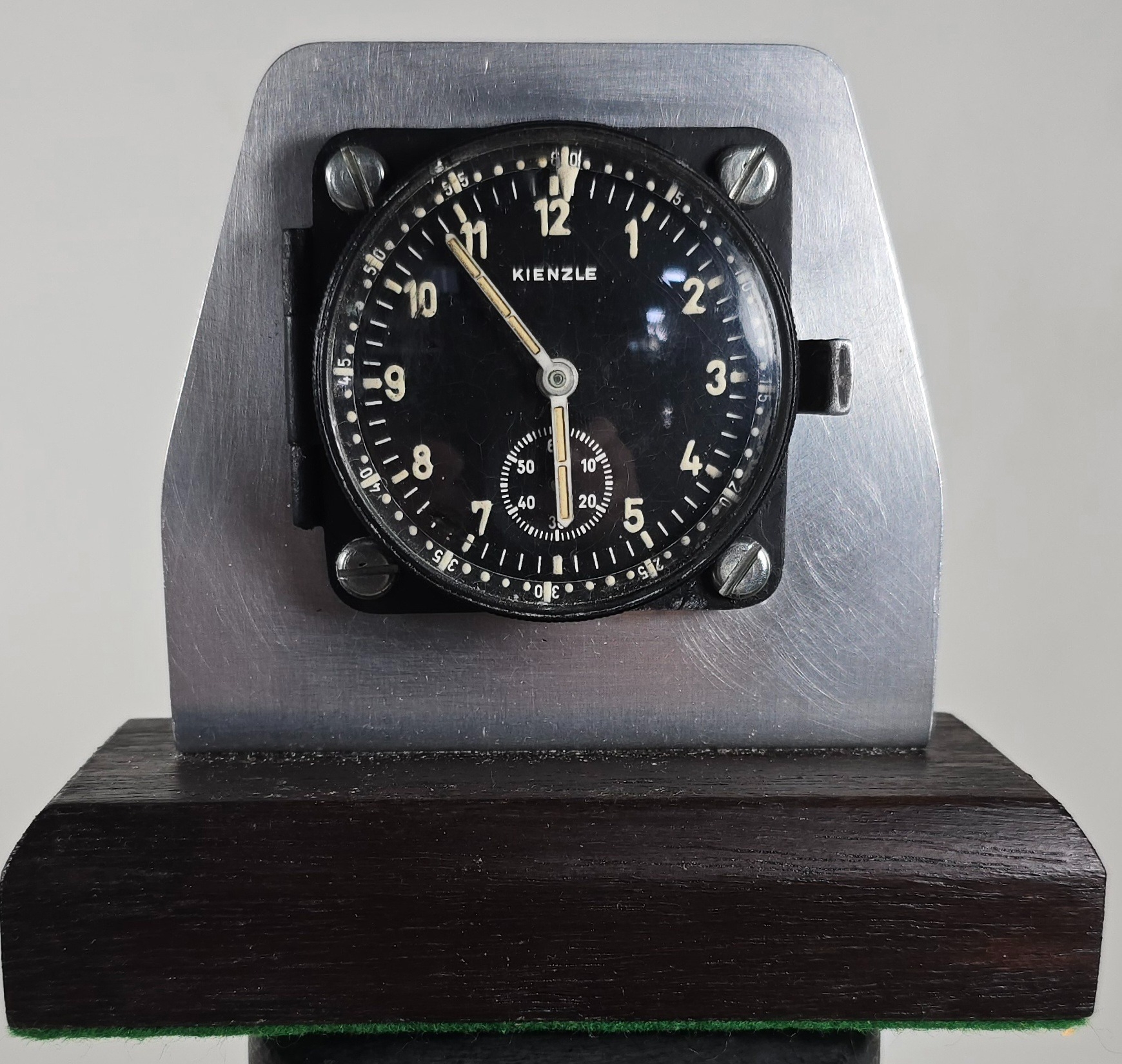 A scarce Third Reich Luftwaffe 8 day Aircraft Cockpit Clock, by Kienzle, movement swings out for winding. GC, movement AF mounted on a stand for display.