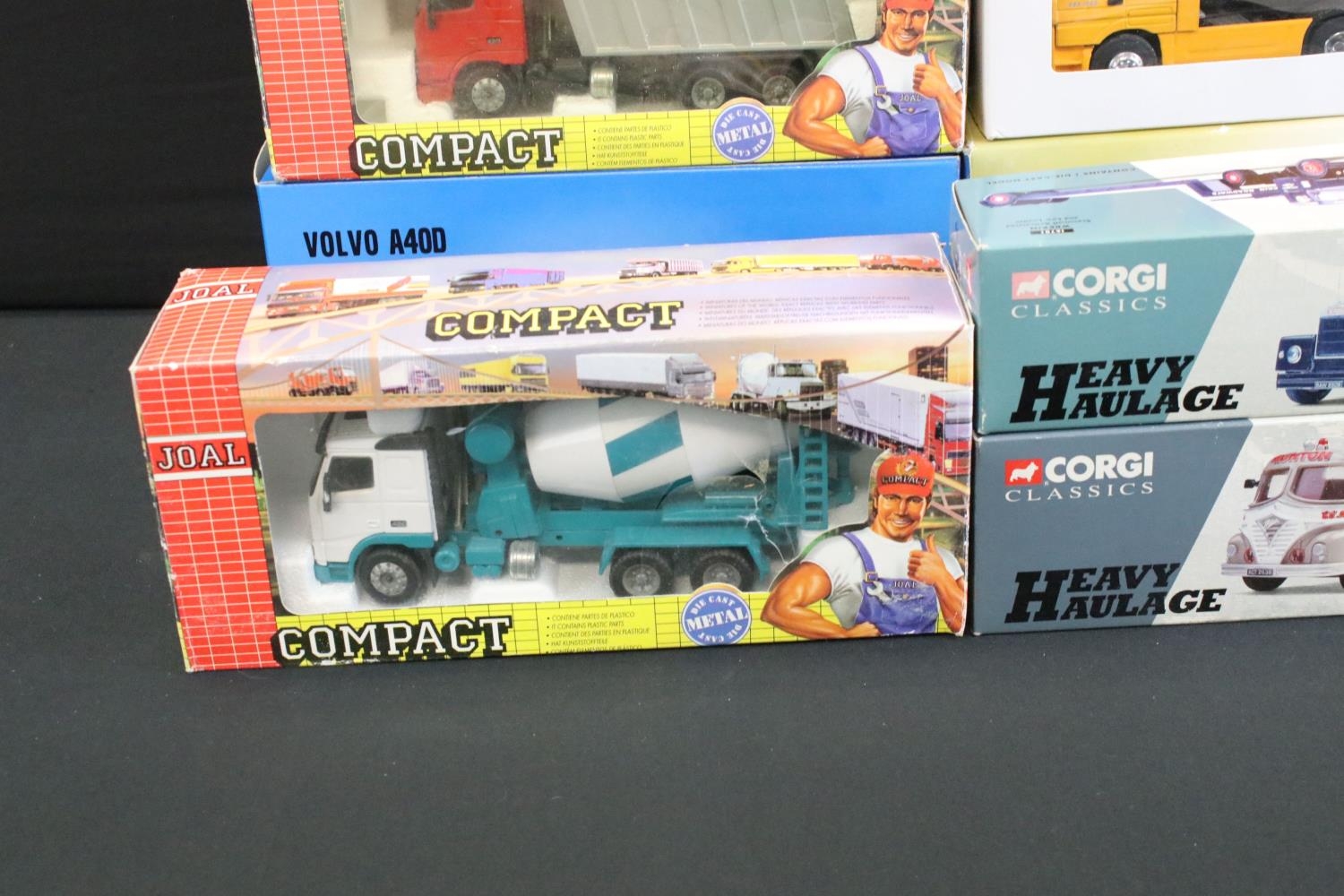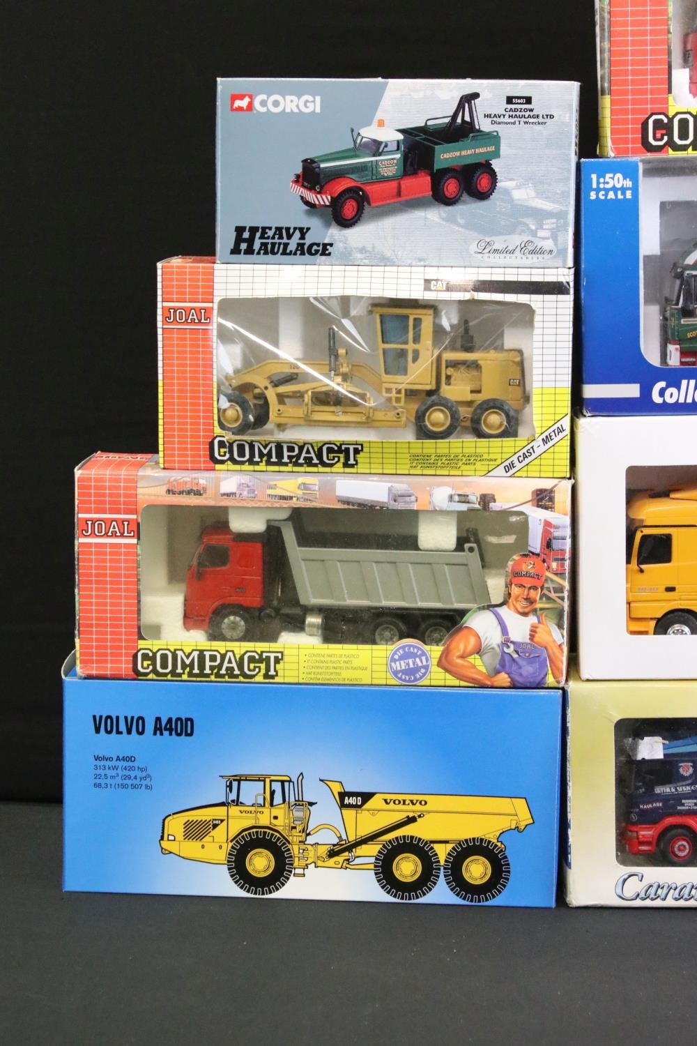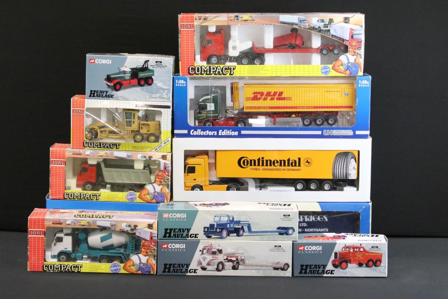 12 Boxed Haulage and Construction diecast models to include Volvo A40D, 4 x Corgi Heavy Haulage, 4 x Joal Compact, Universal Hobbies DHL Container, Eligor Continental and Cararama 569014 Arthur Spriggs, diecast ex, boxes mainly vg
