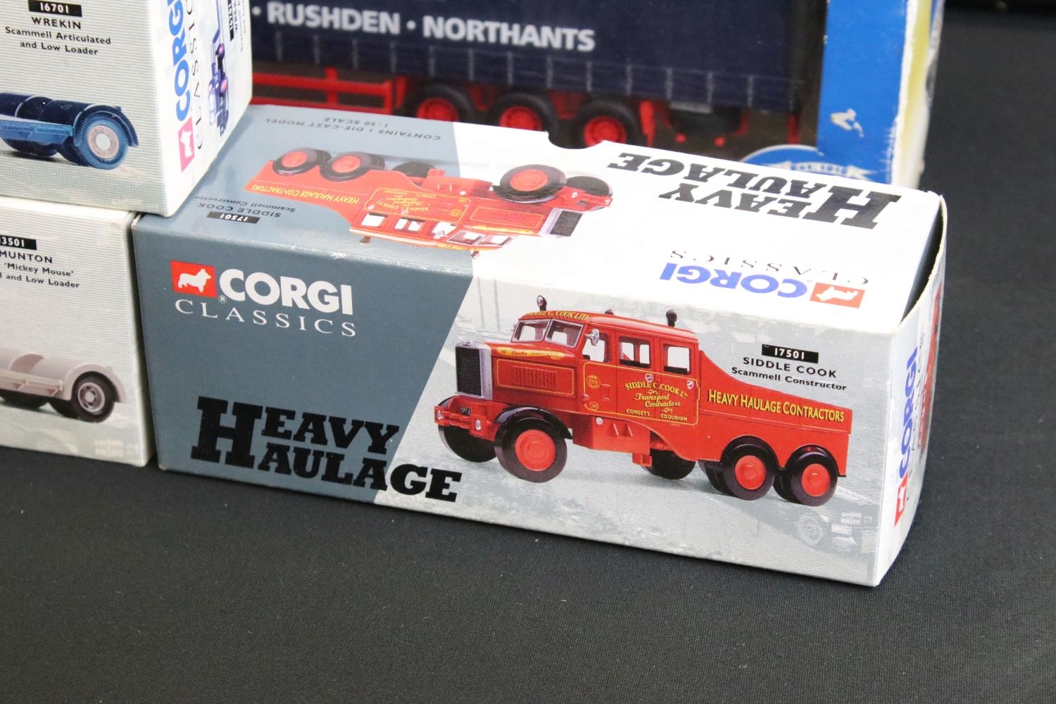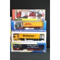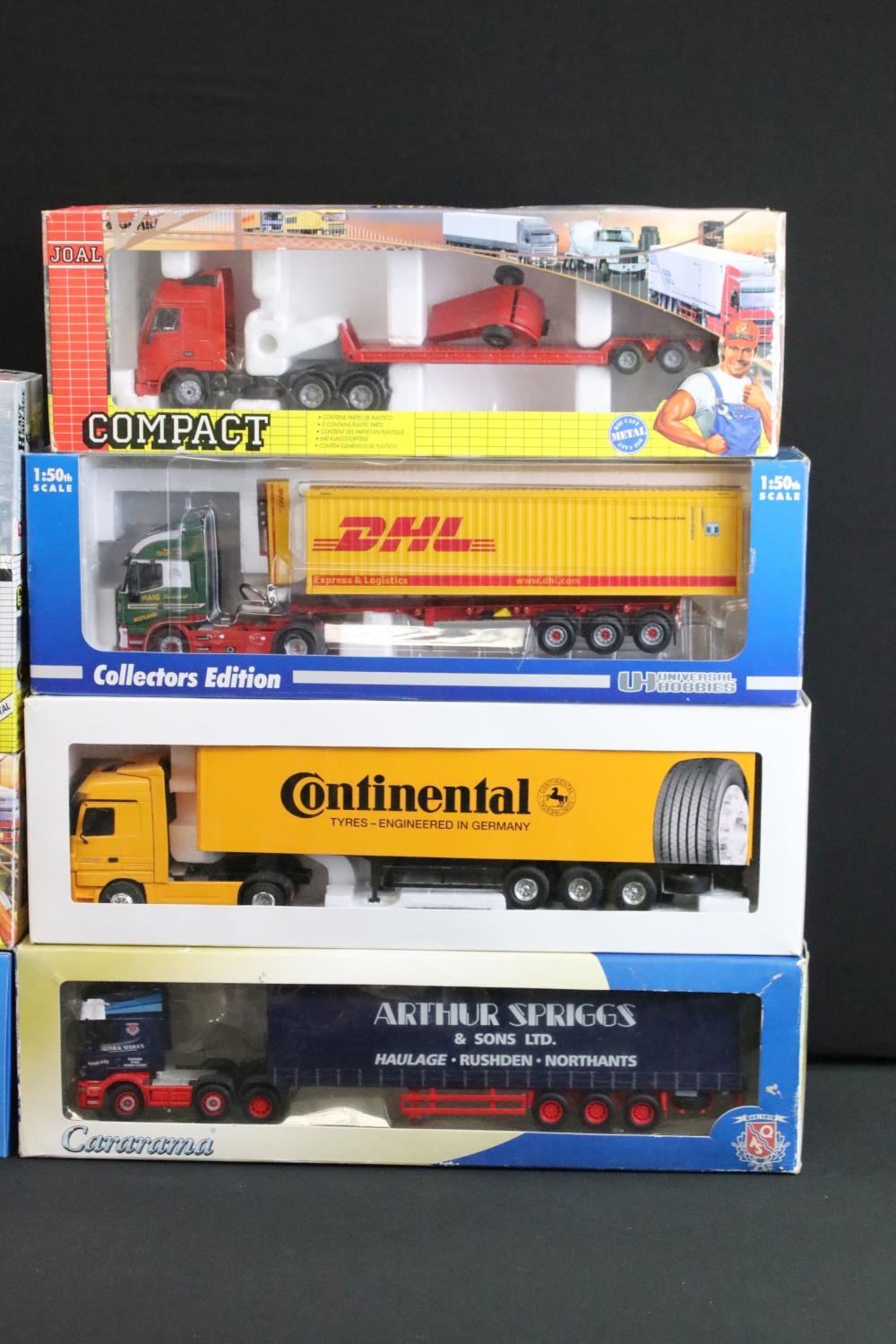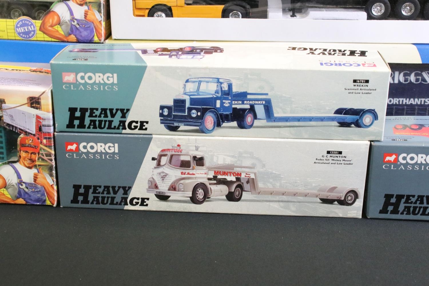 12 Boxed Haulage and Construction diecast models to include Volvo A40D, 4 x Corgi Heavy Haulage, 4 x Joal Compact, Universal Hobbies DHL Container, Eligor Continental and Cararama 569014 Arthur Spriggs, diecast ex, boxes mainly vg