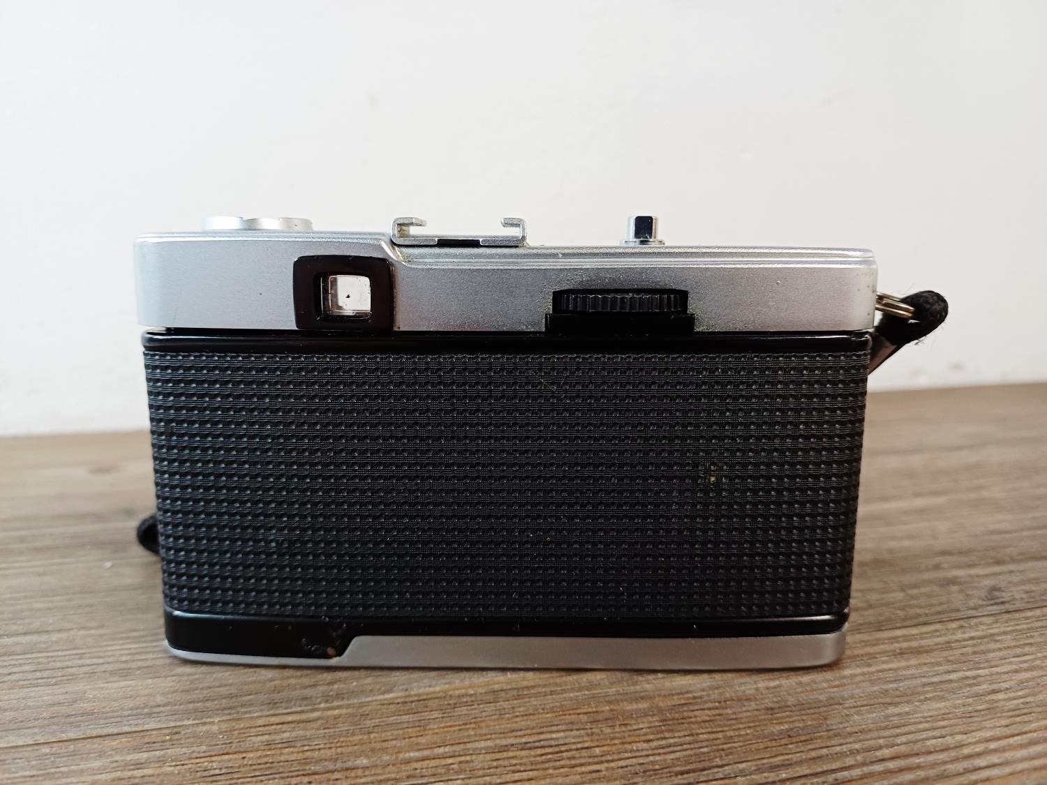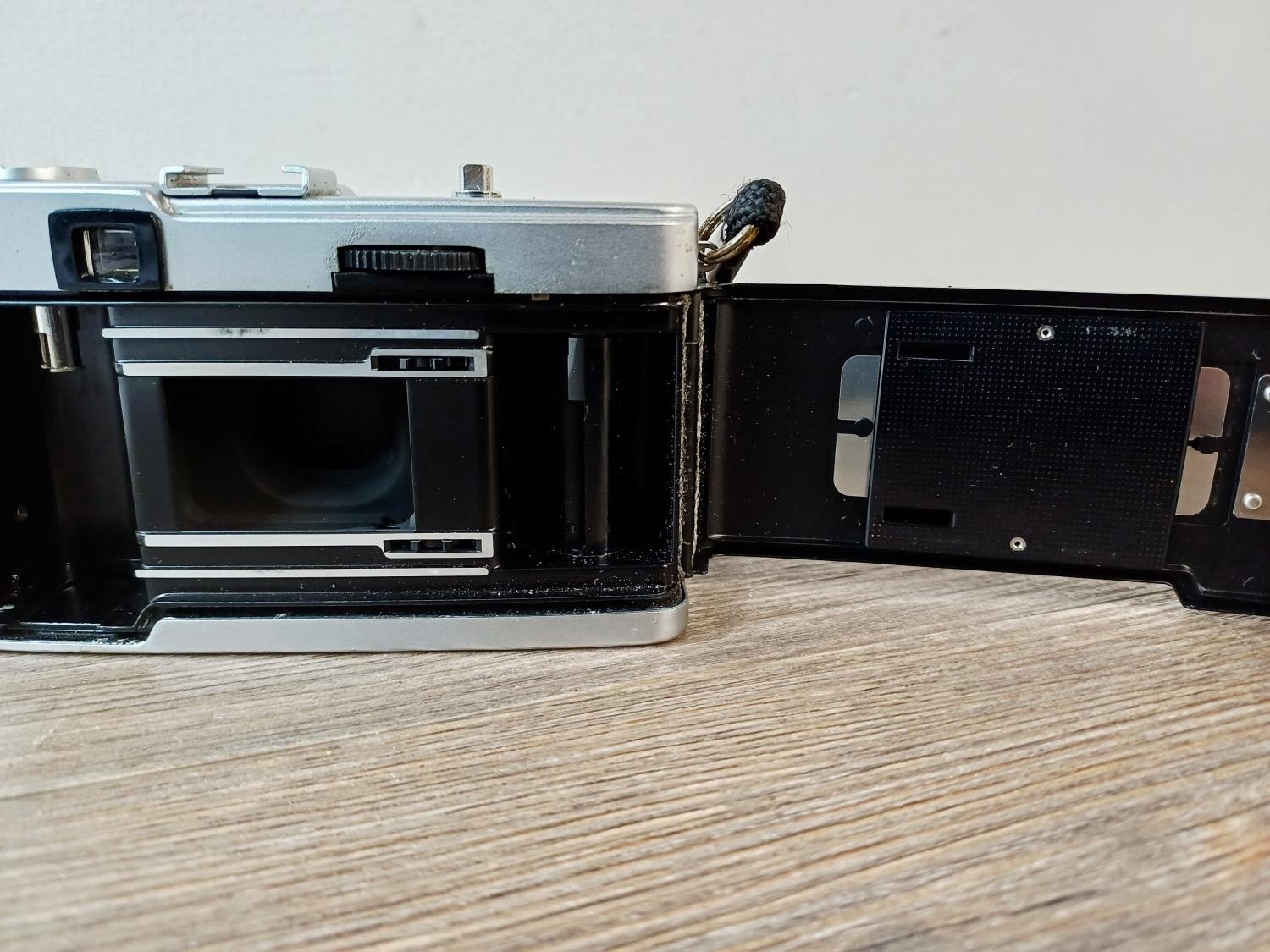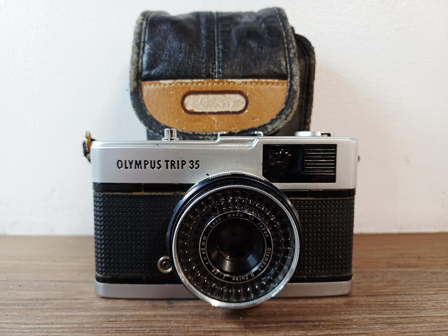 A cased Olympus Trip 35 fully-automatic compact 35mm camera with wrist strap