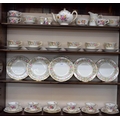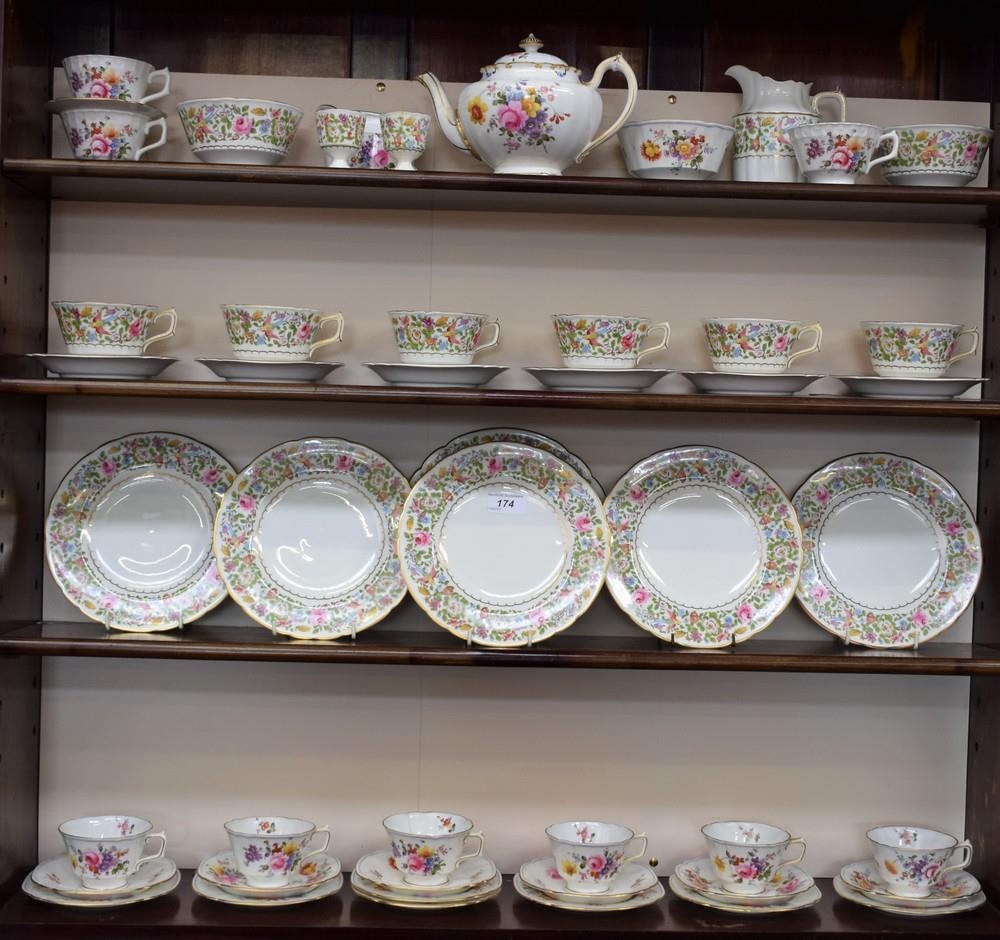 A Royal Crown Derby Blue Line Posies pattern tea service, for six, comprising cups, saucers, side plates, tea pot, milk jug and sugar bowl; another, part tea service, with English flowers, comprising cups, saucers, side plates, milk jug and sugar bowl, green mark; etc