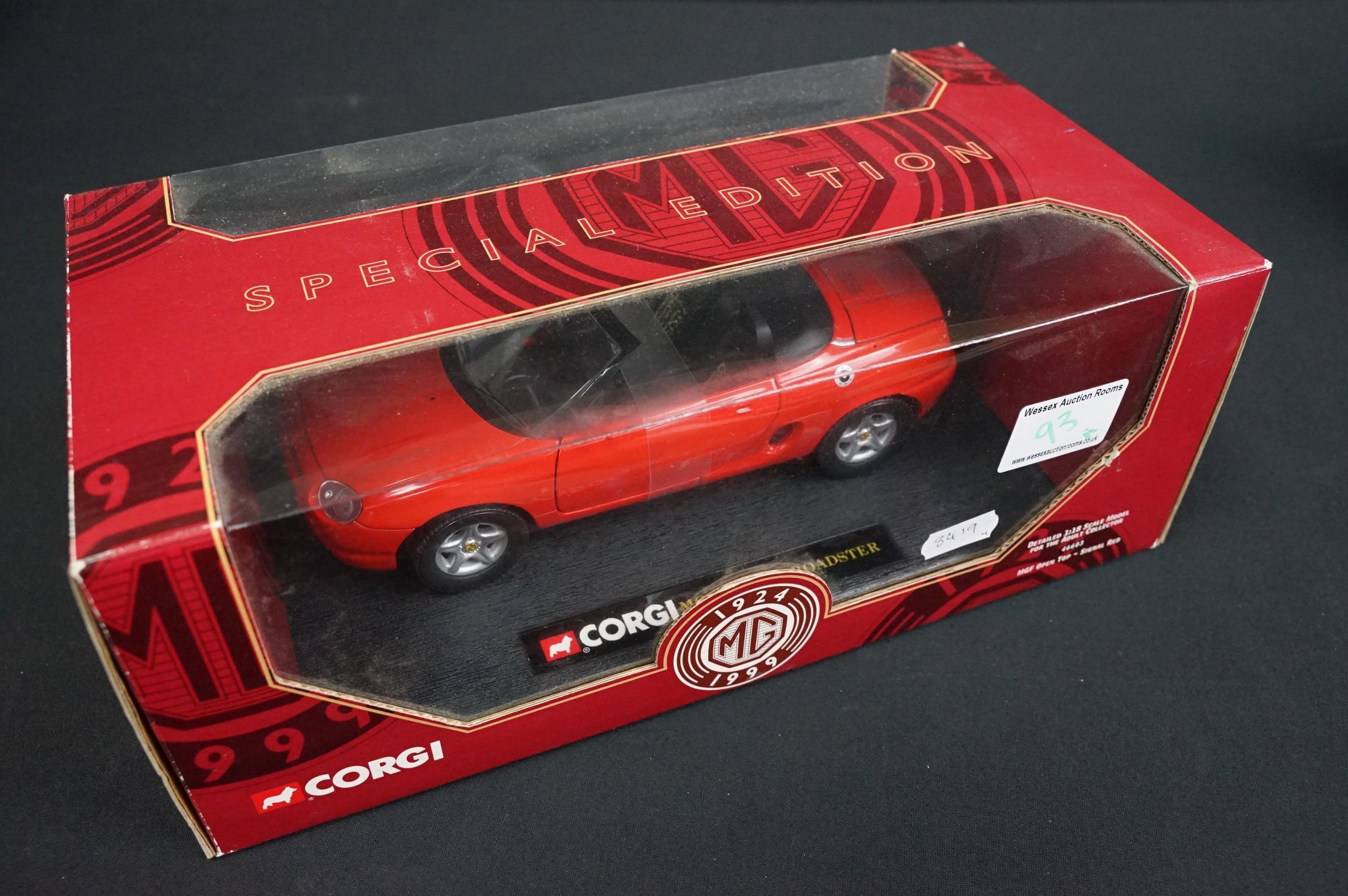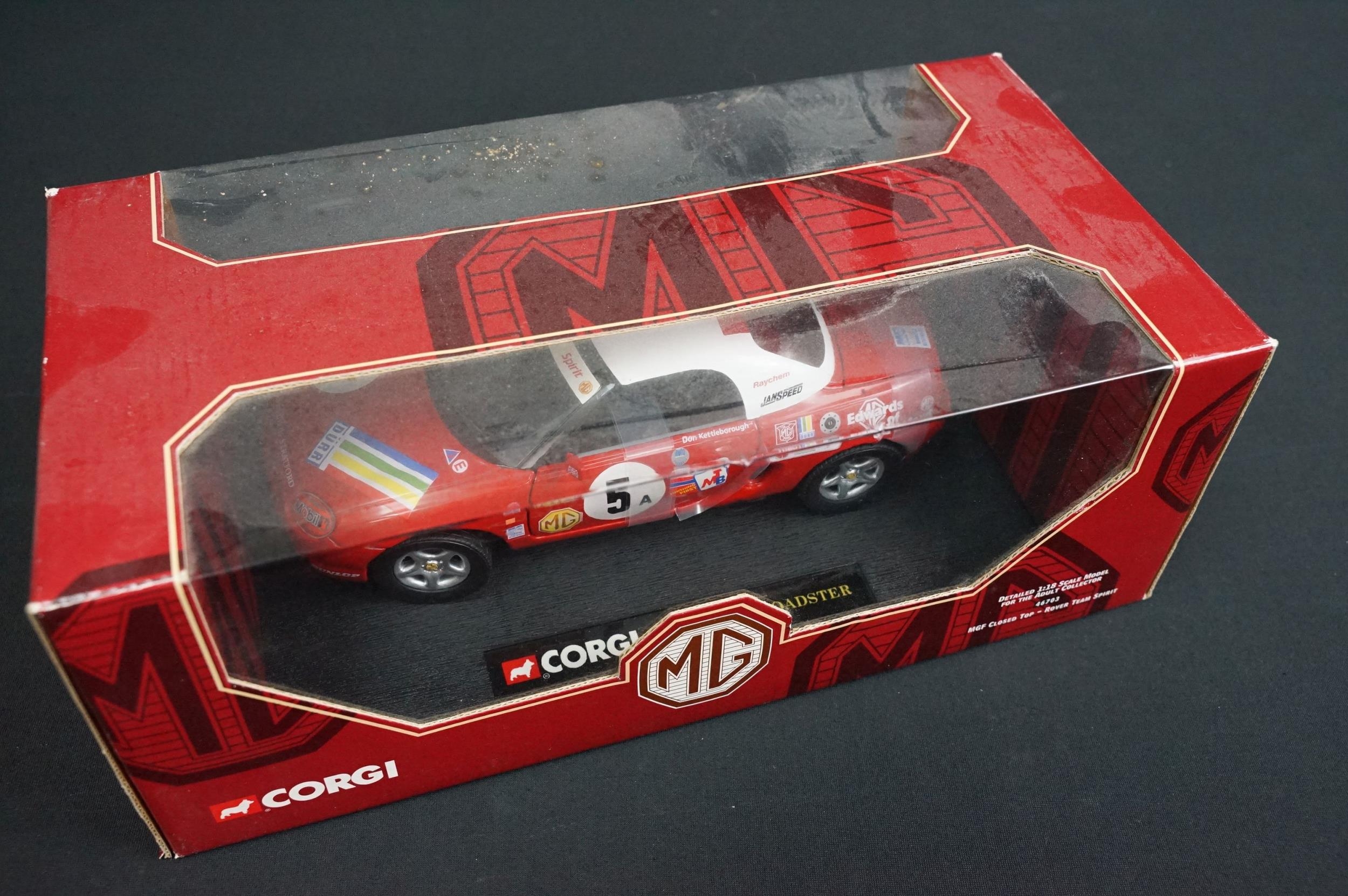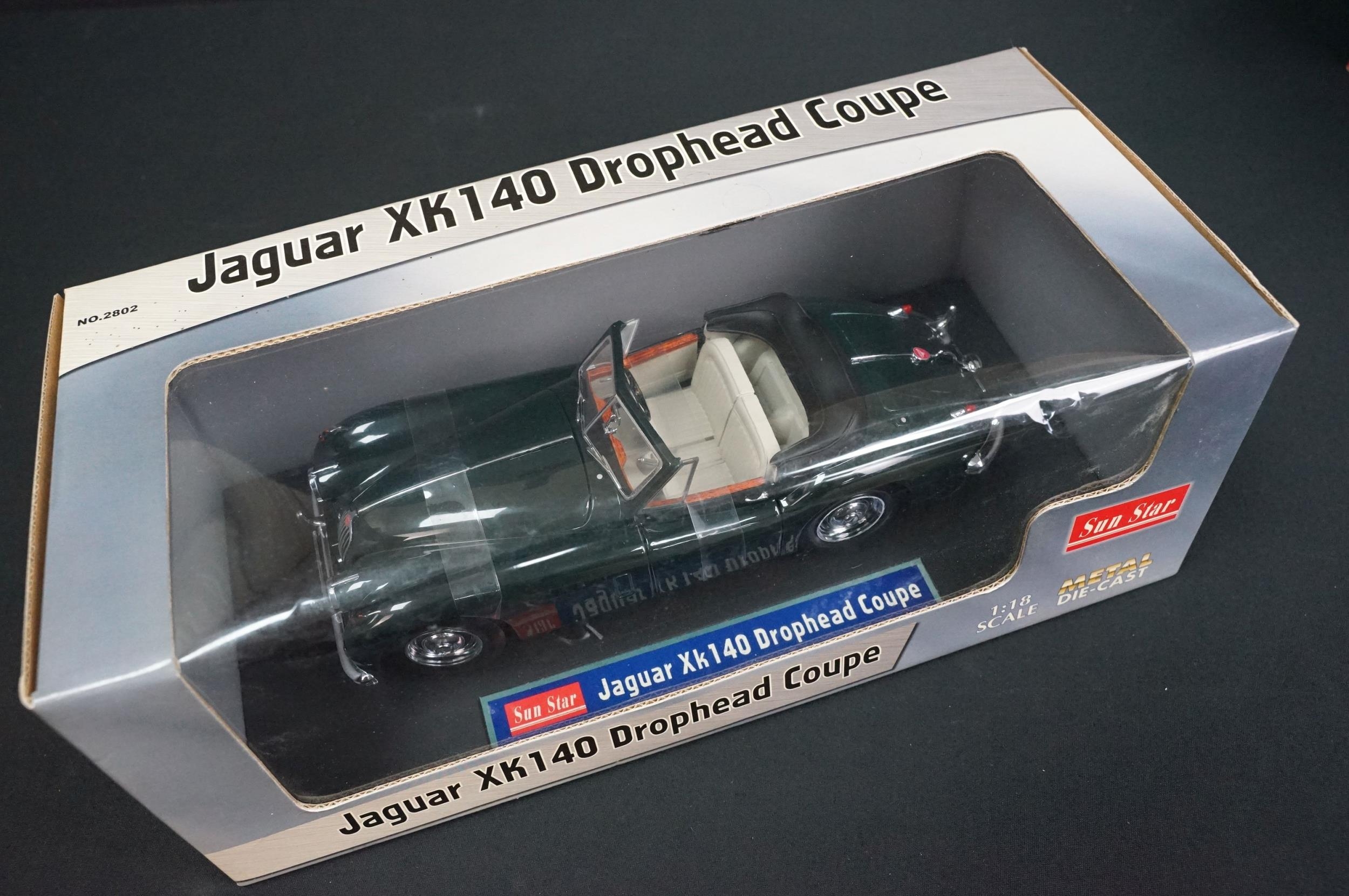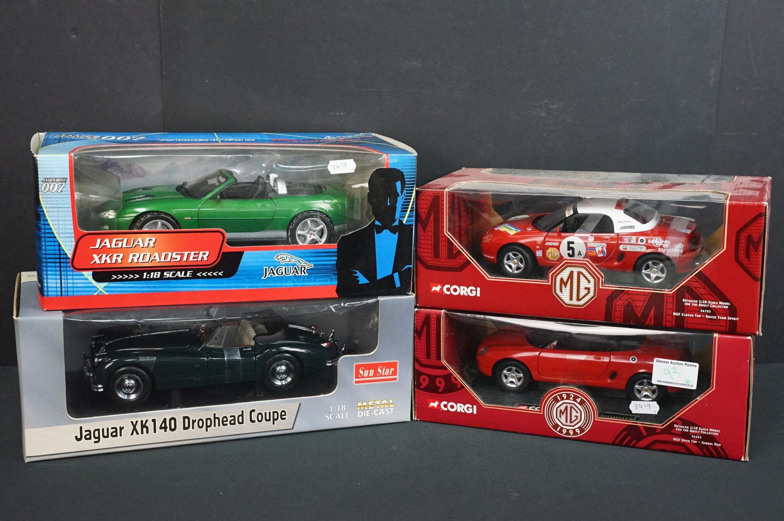 Four boxed 1/18 diecast models to include Beanstalk Group James Bond 007 Jaguar XKR Roadster, Sun Star Jaguar XK140 Drophead Coupe and 2 x Corgi MG (46703 & 46603) diecast ex, boxes vg
