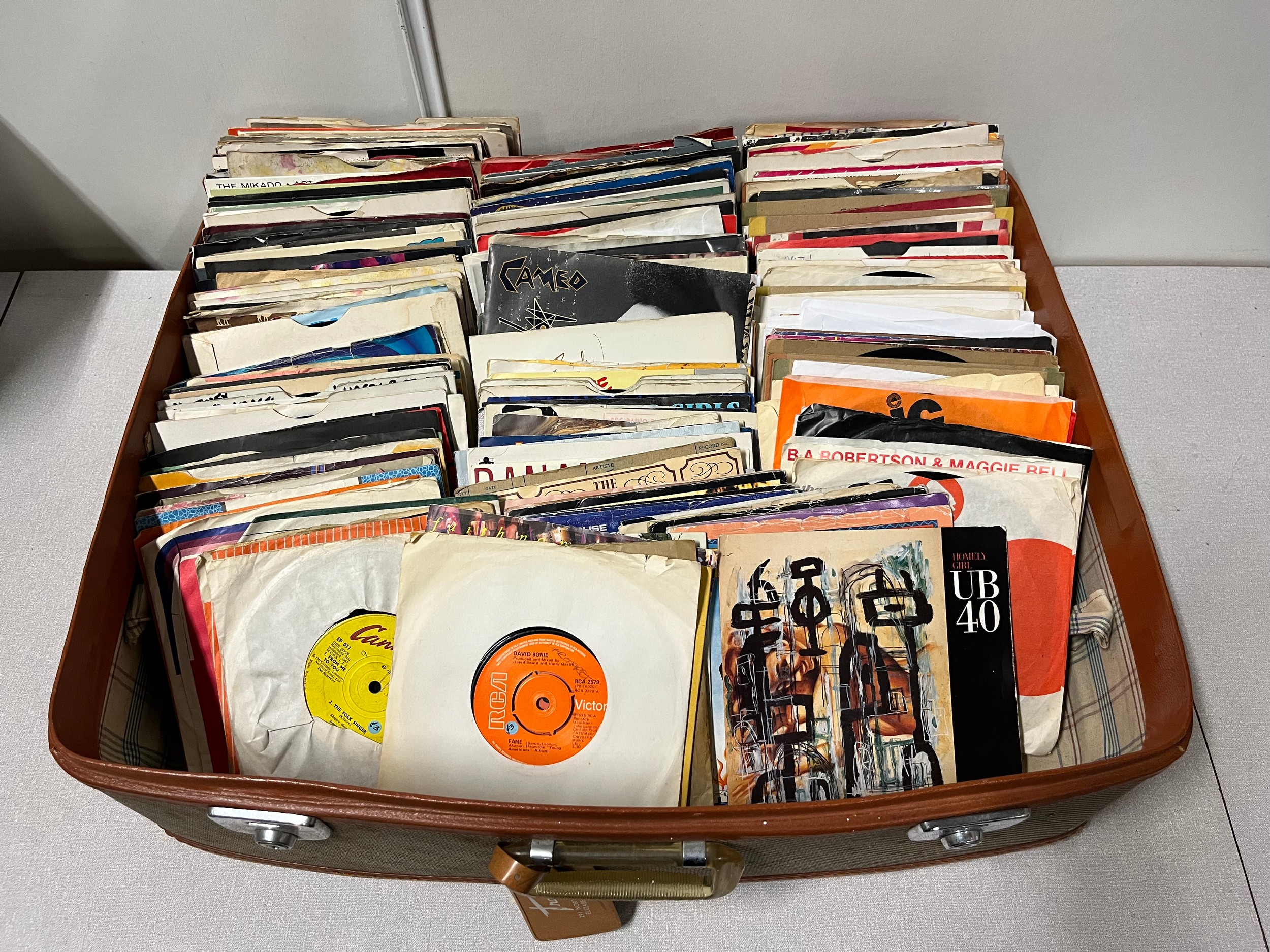 case of 45rpm singles to include david bowie , ub40 etc