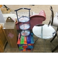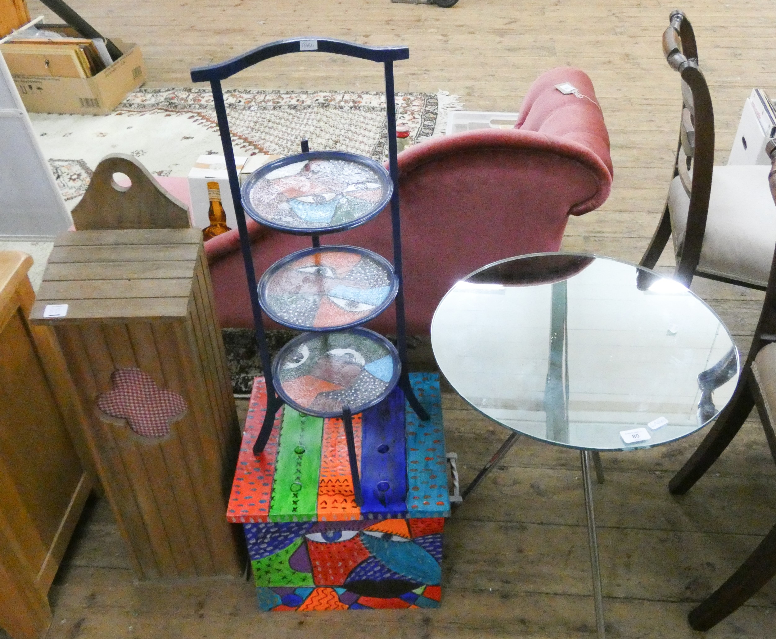 A mirror topped coffee table, a three tier cake stand, a painted box and a baguette box