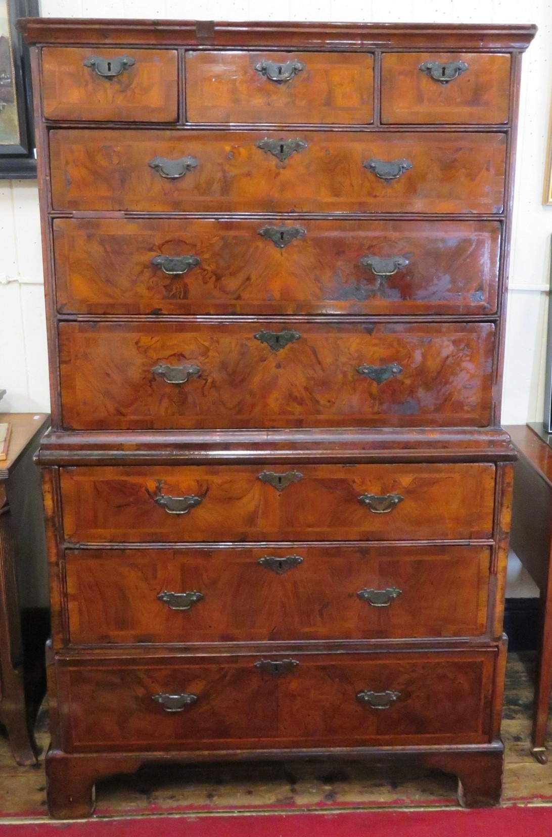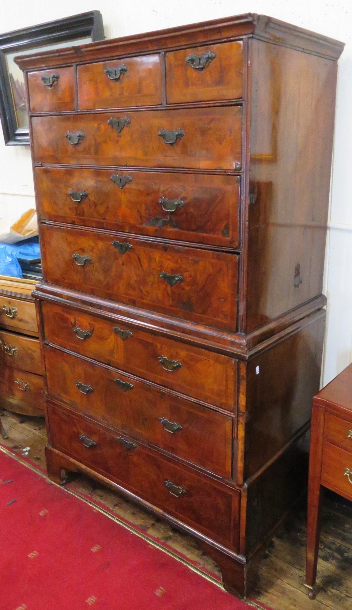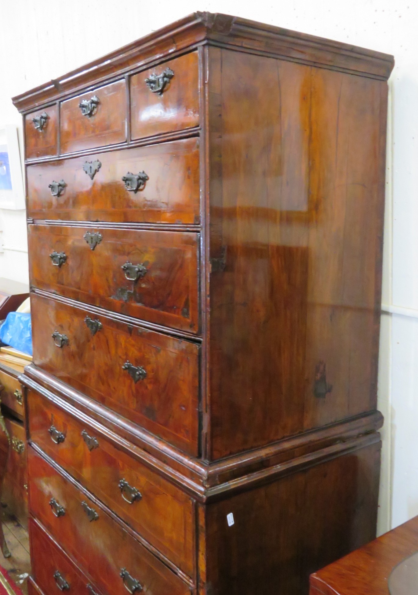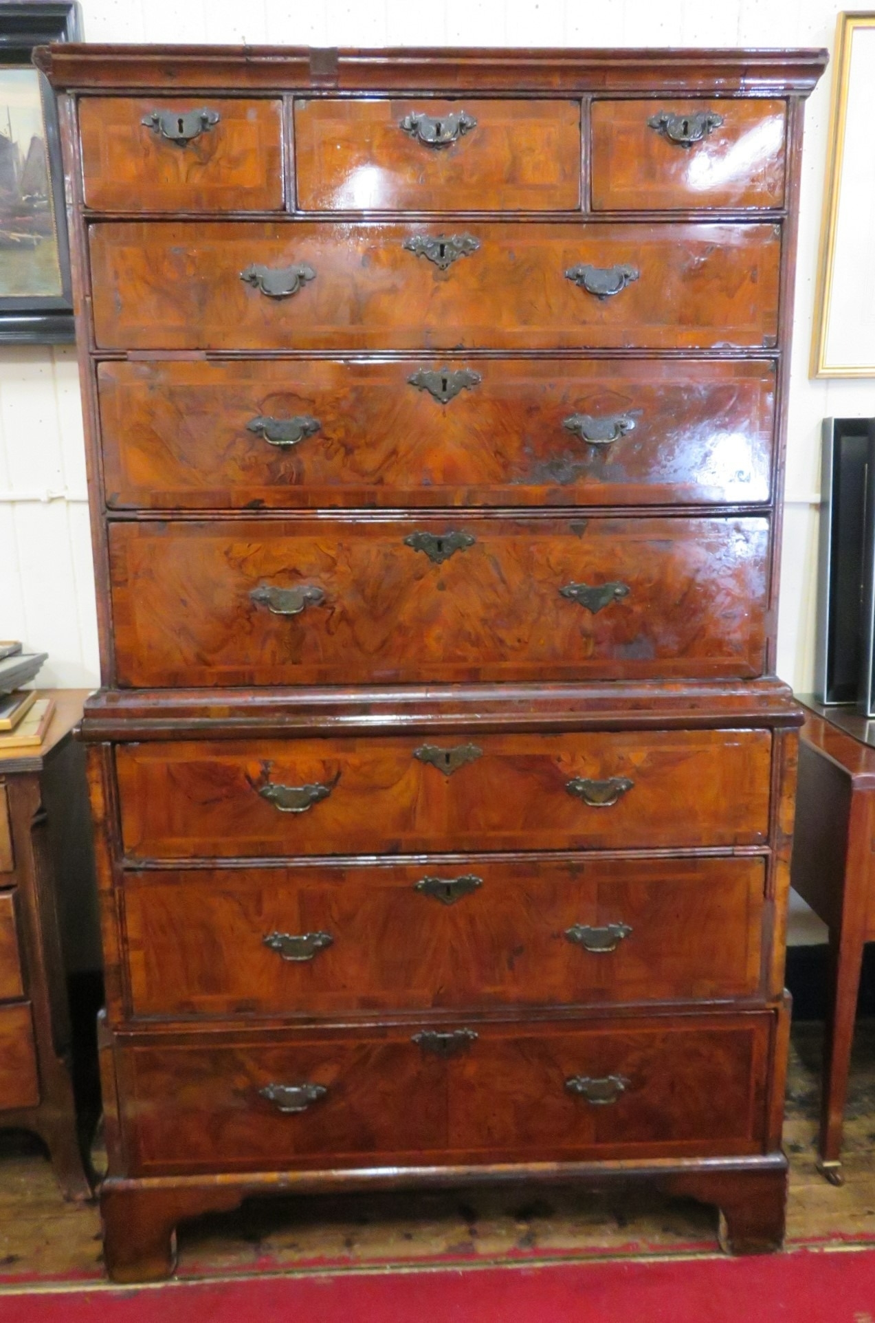 Queen Anne inlaid crossbanded mahogany & walnut chest on chest with crossbanded & herring bone inlaid drawers, top with 3 short & 3 graduated drawers, 3 graduated drawers under, with ornate handles & escutcheons, on bracket feet