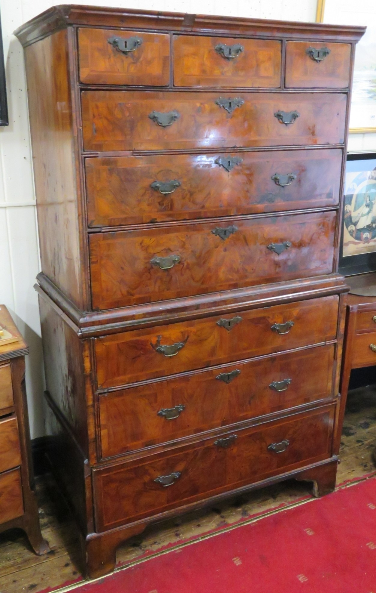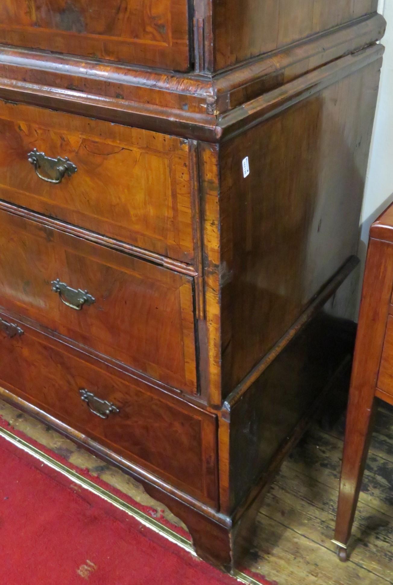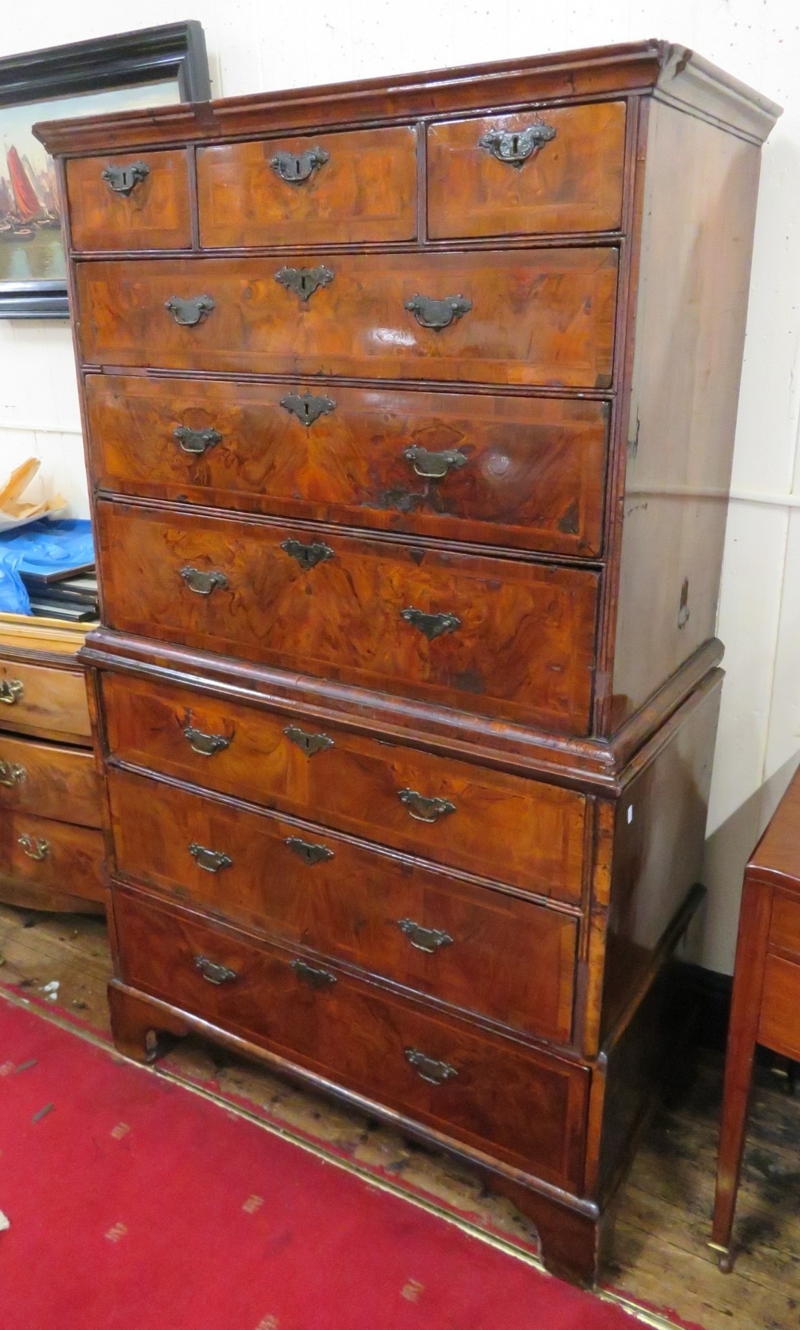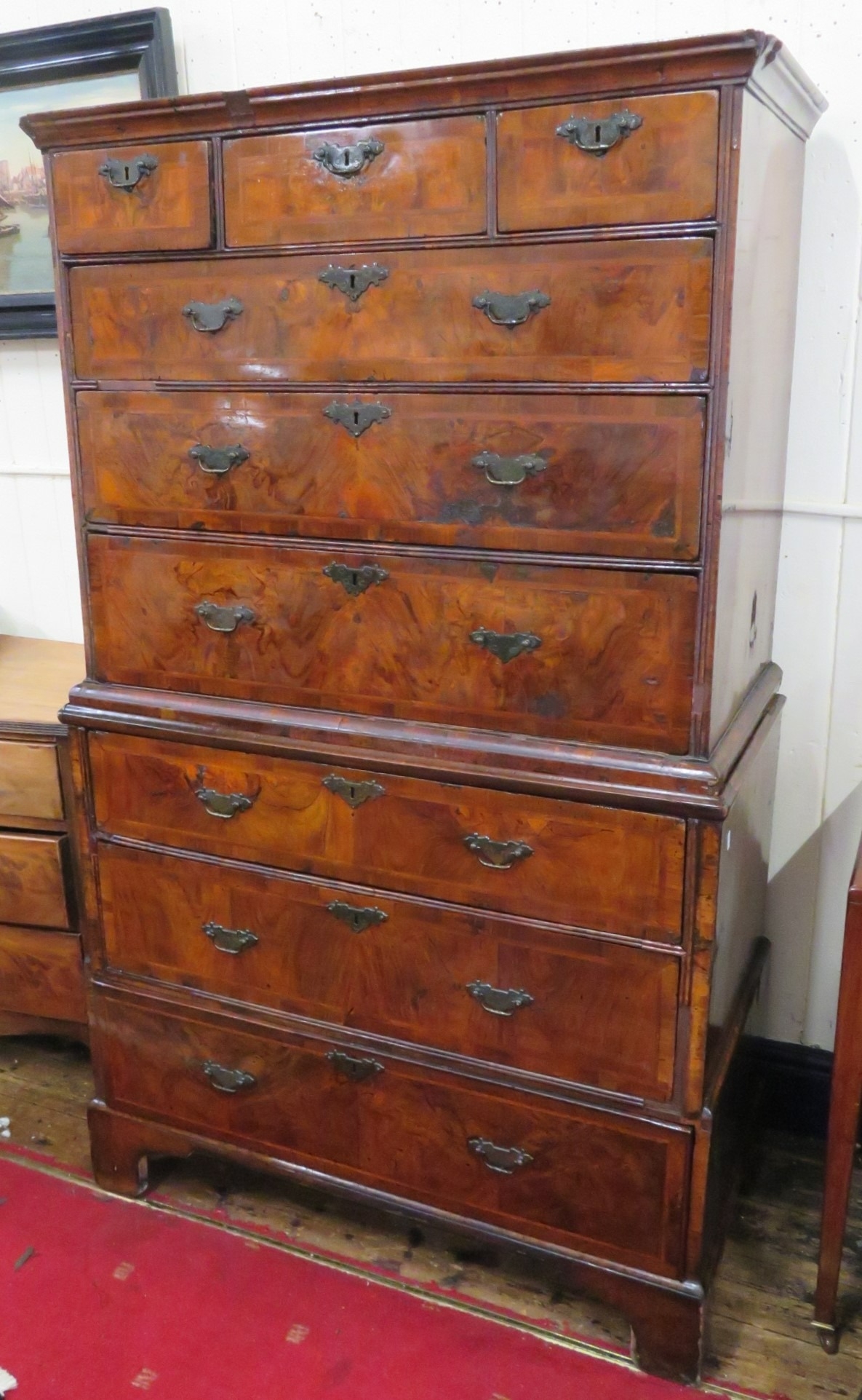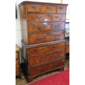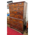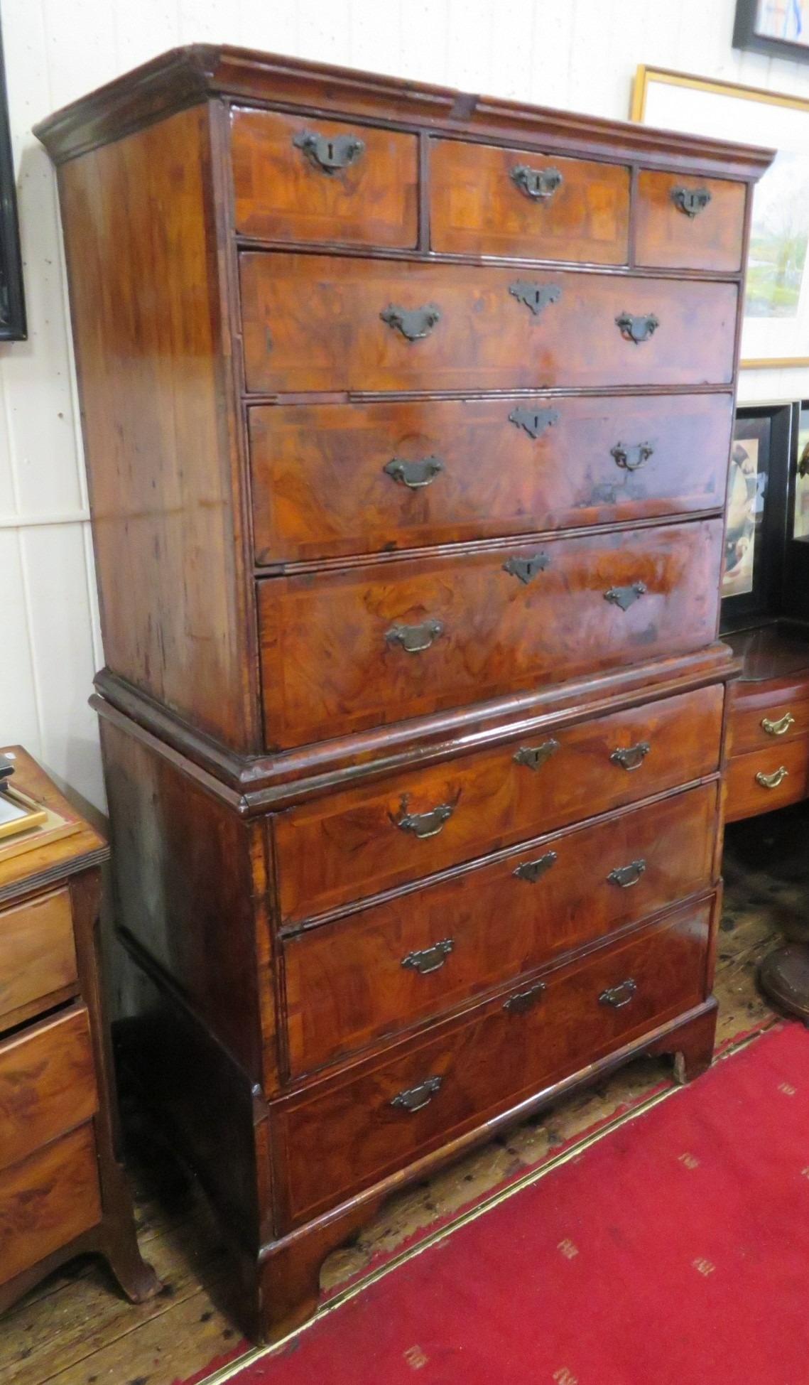 Queen Anne inlaid crossbanded mahogany & walnut chest on chest with crossbanded & herring bone inlaid drawers, top with 3 short & 3 graduated drawers, 3 graduated drawers under, with ornate handles & escutcheons, on bracket feet