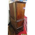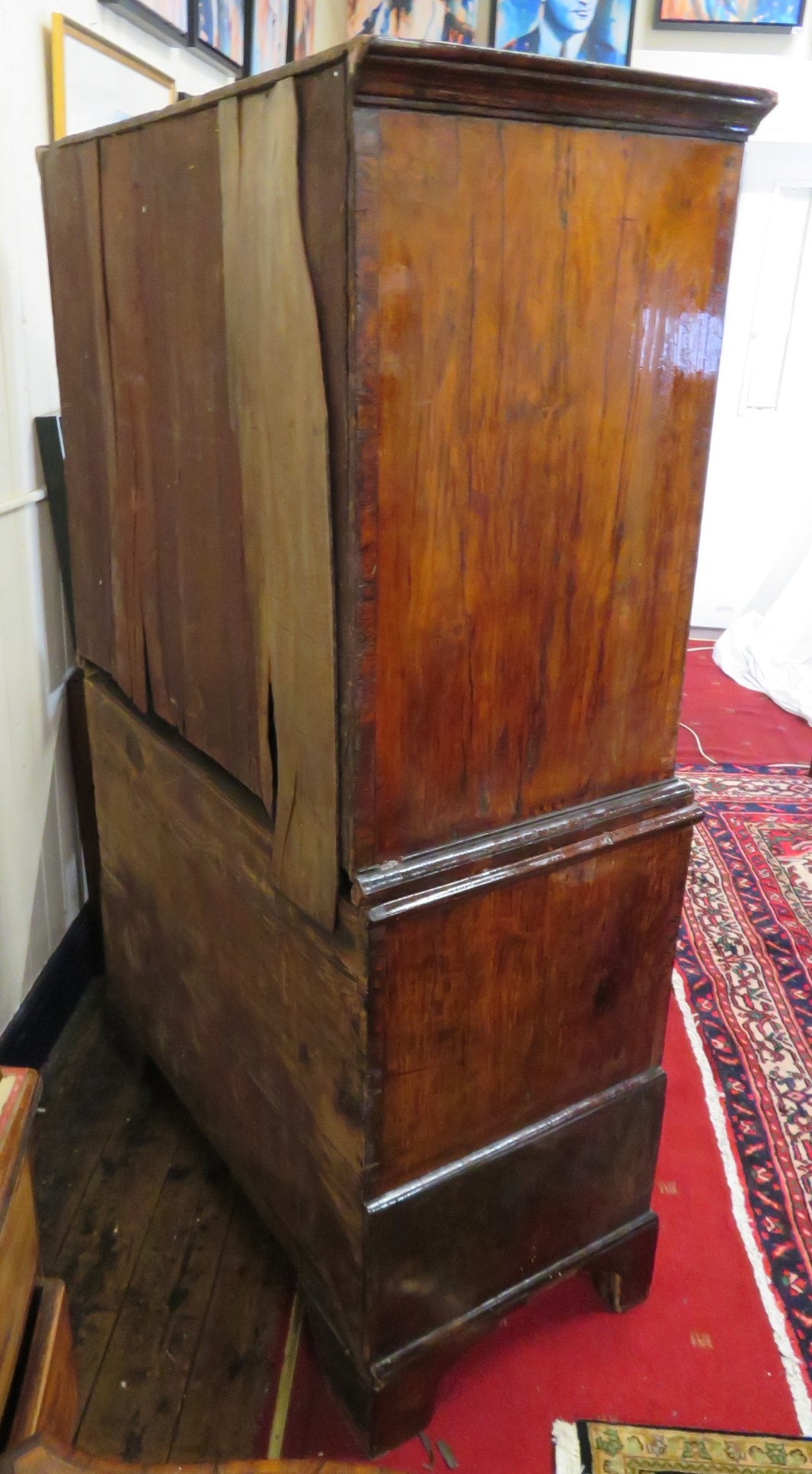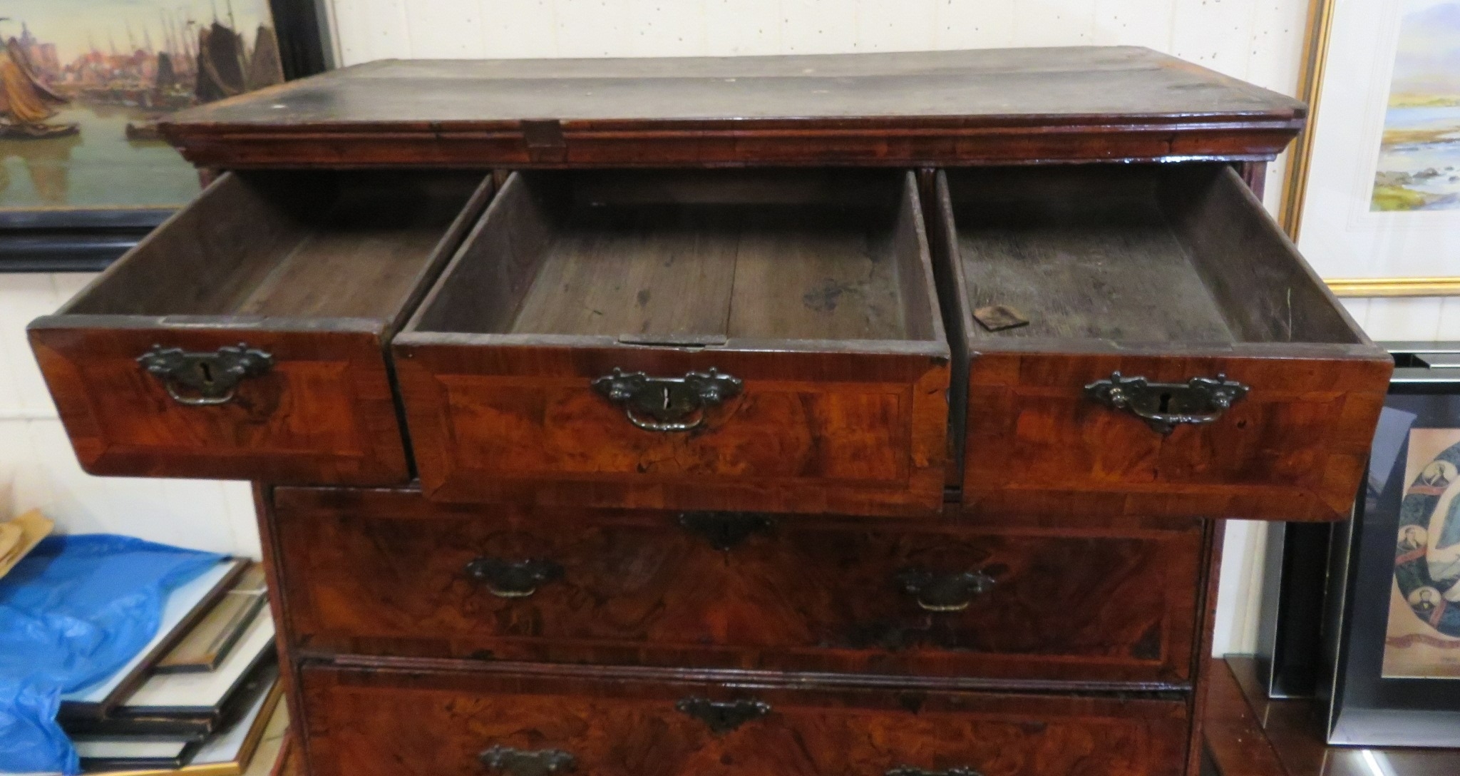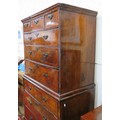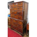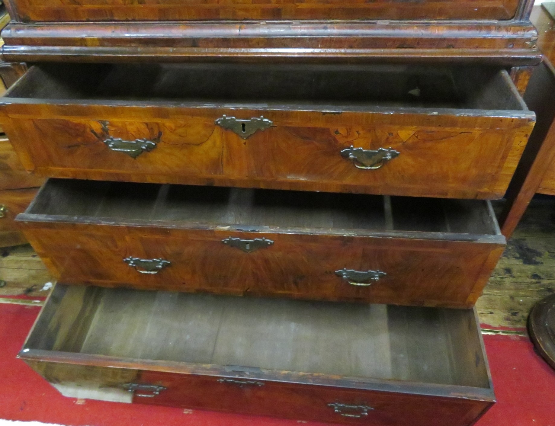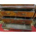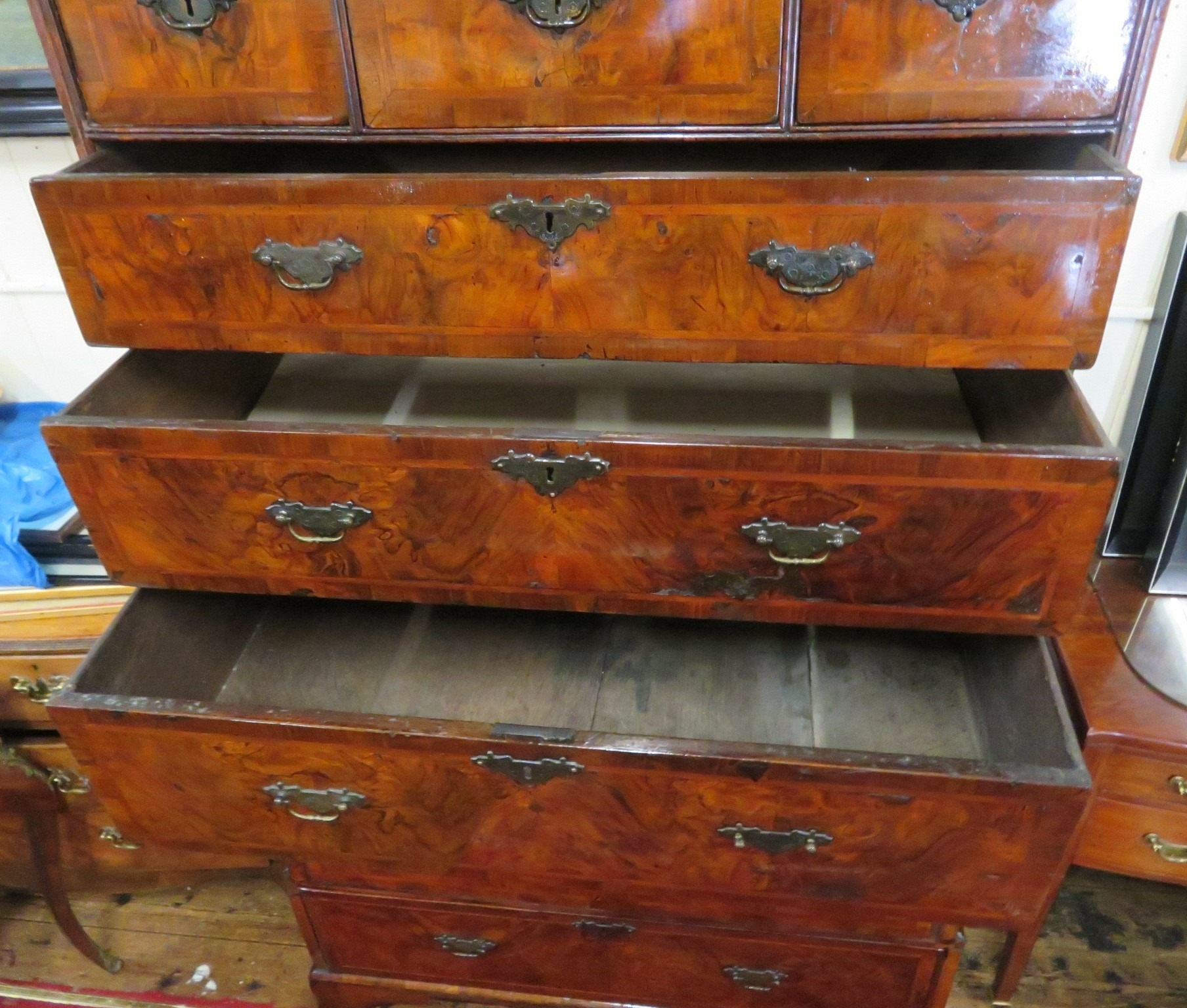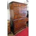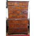 Queen Anne inlaid crossbanded mahogany & walnut chest on chest with crossbanded & herring bone inlaid drawers, top with 3 short & 3 graduated drawers, 3 graduated drawers under, with ornate handles & escutcheons, on bracket feet