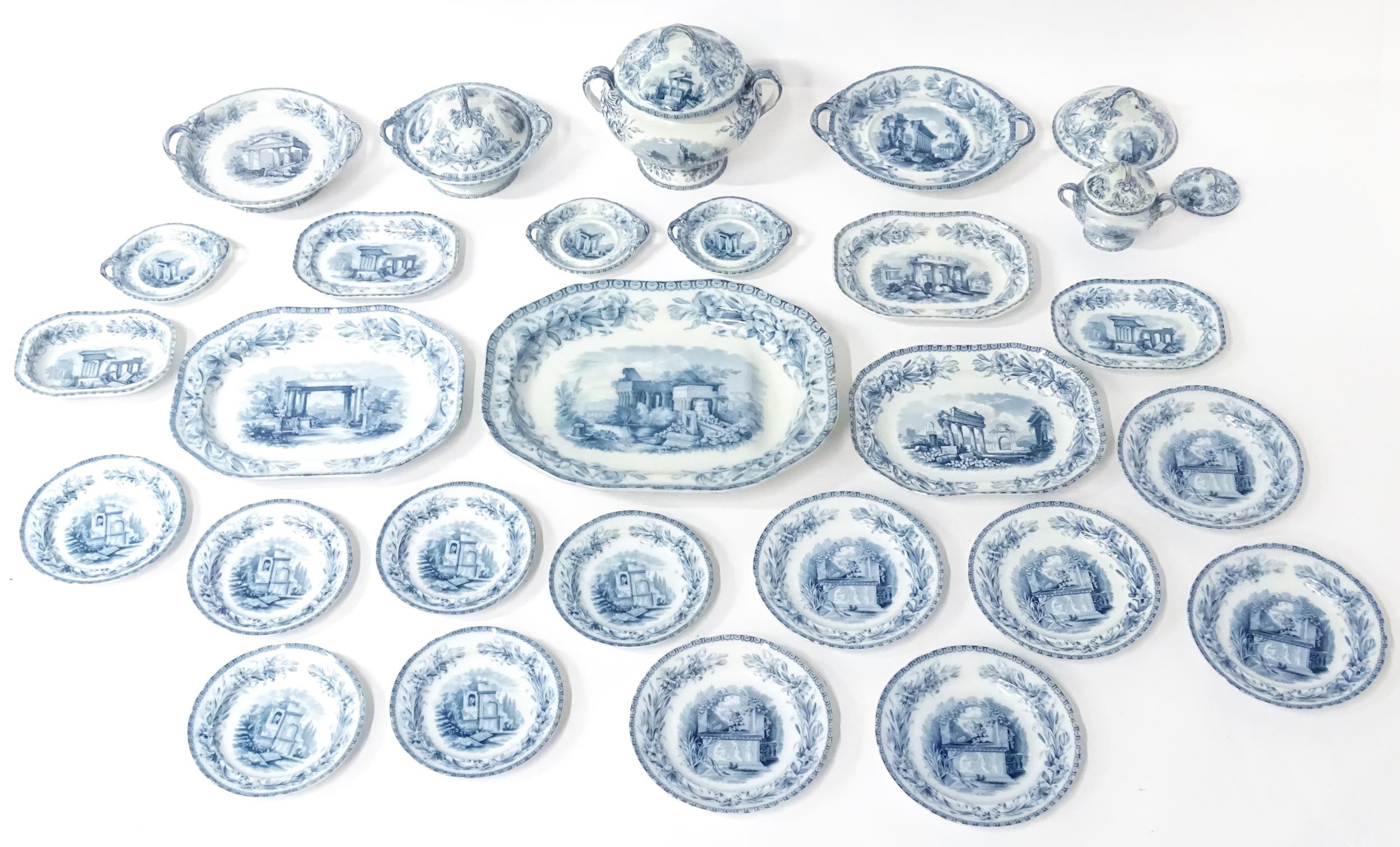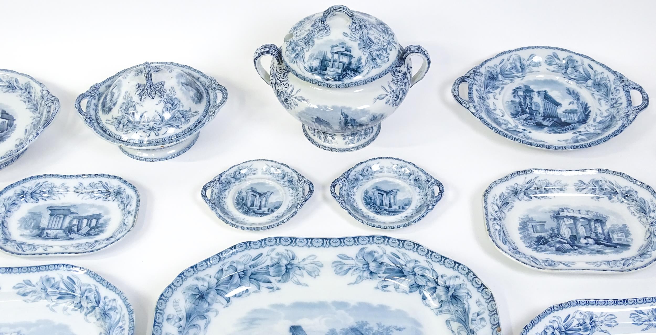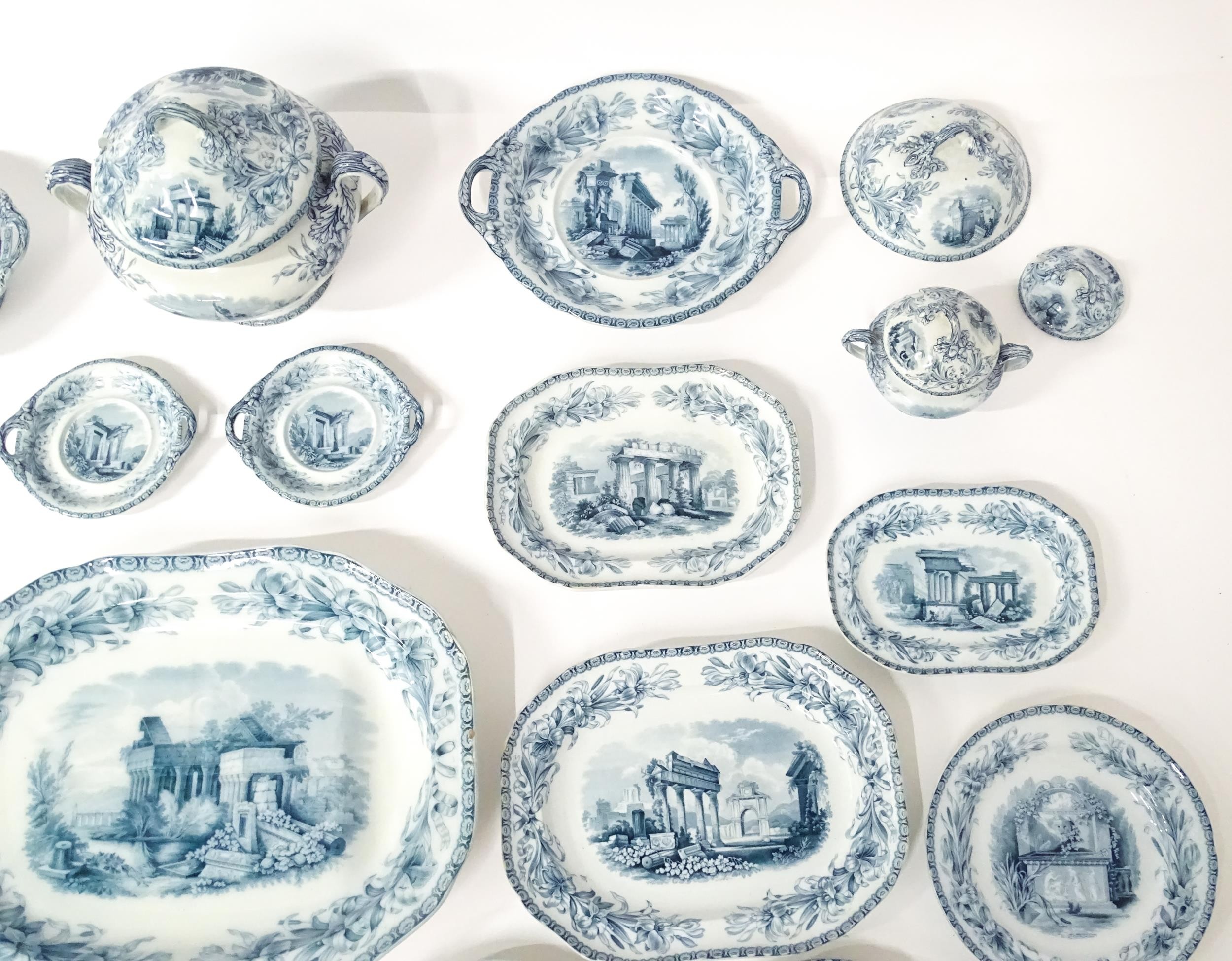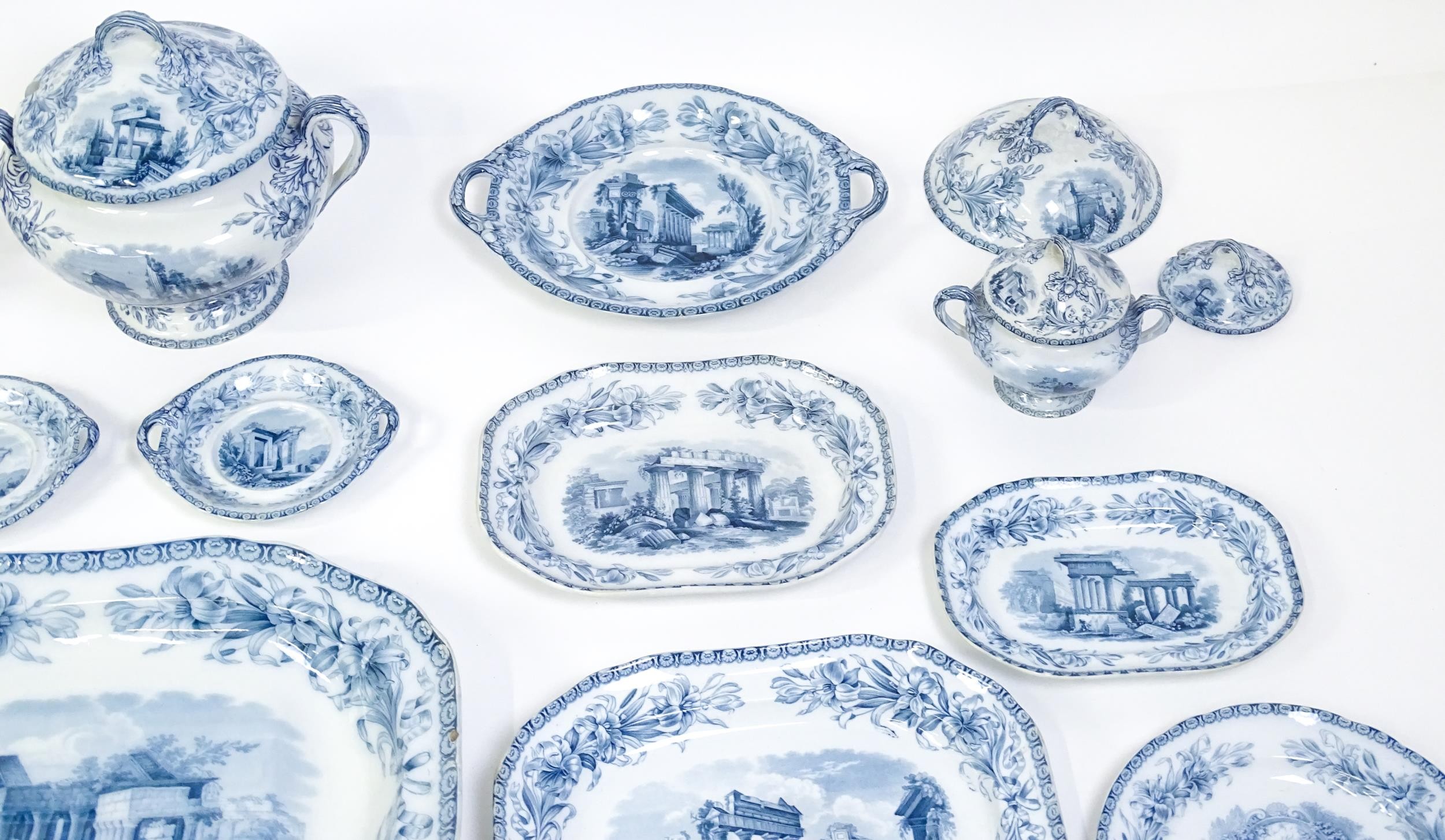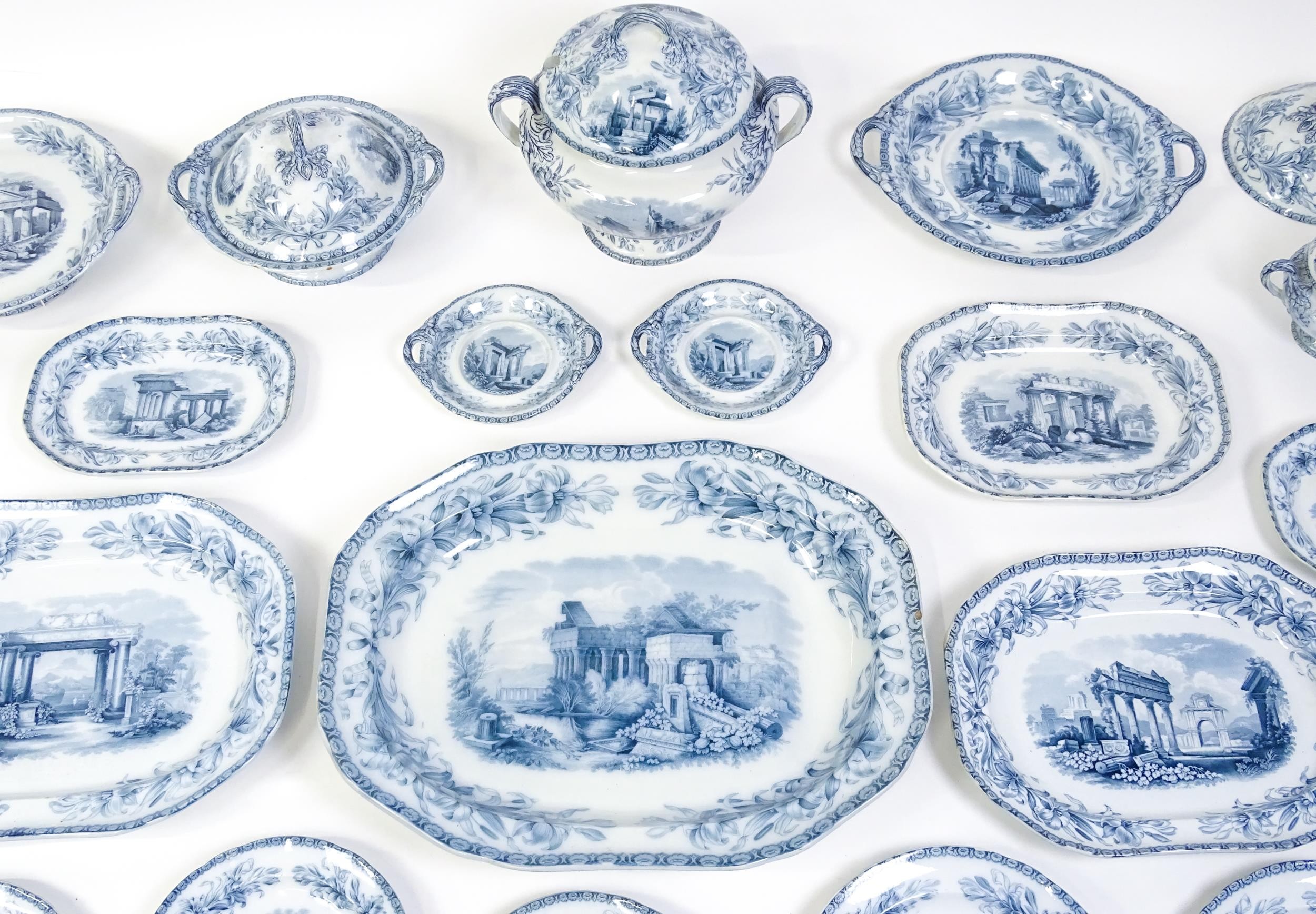 A quantity of Copeland late Spode blue and white dinner wares decorated with ruins to include plates, meat plates, serving dishes, tureens etc. Largest meat plate approx. 20 1/2" x 16"