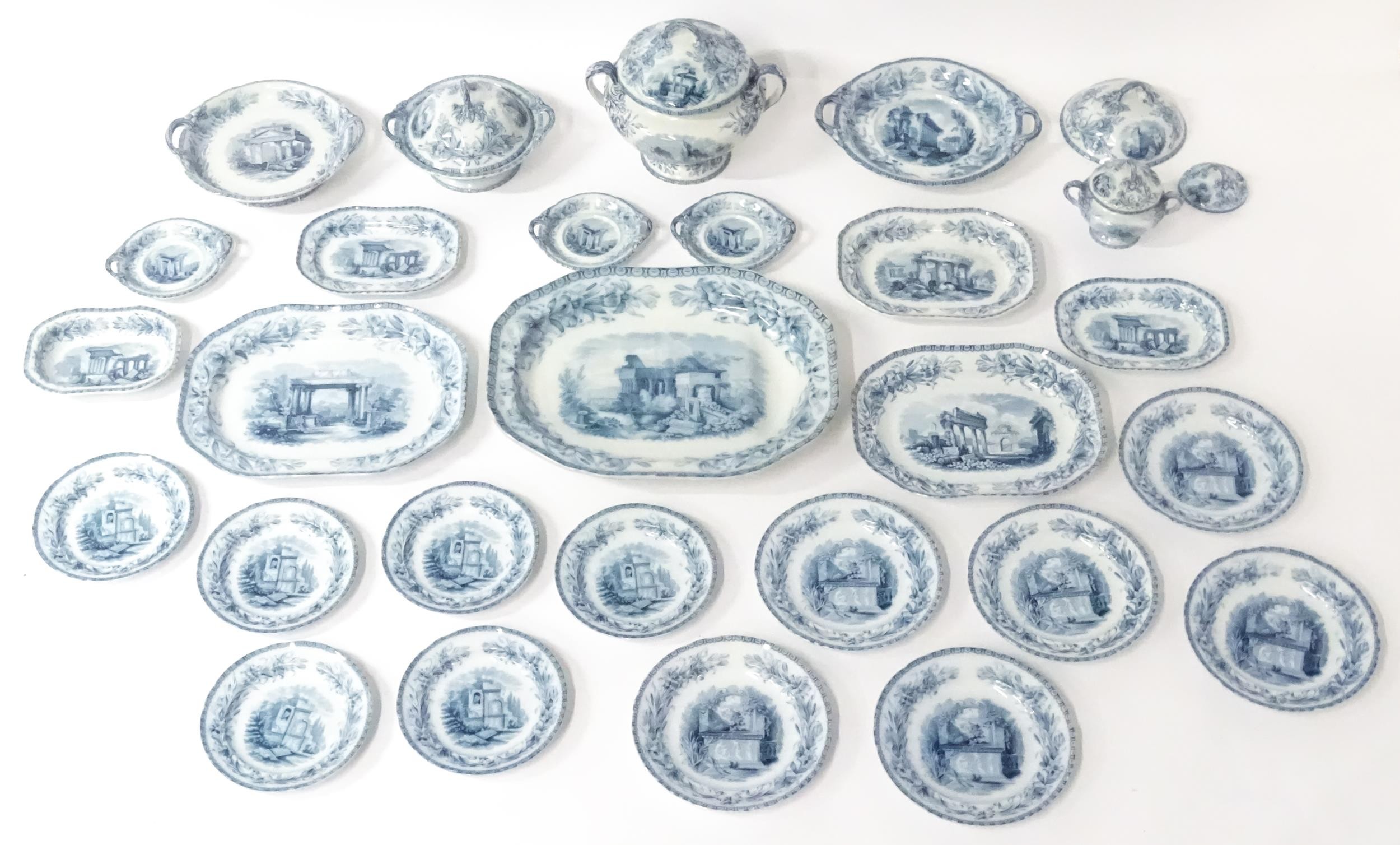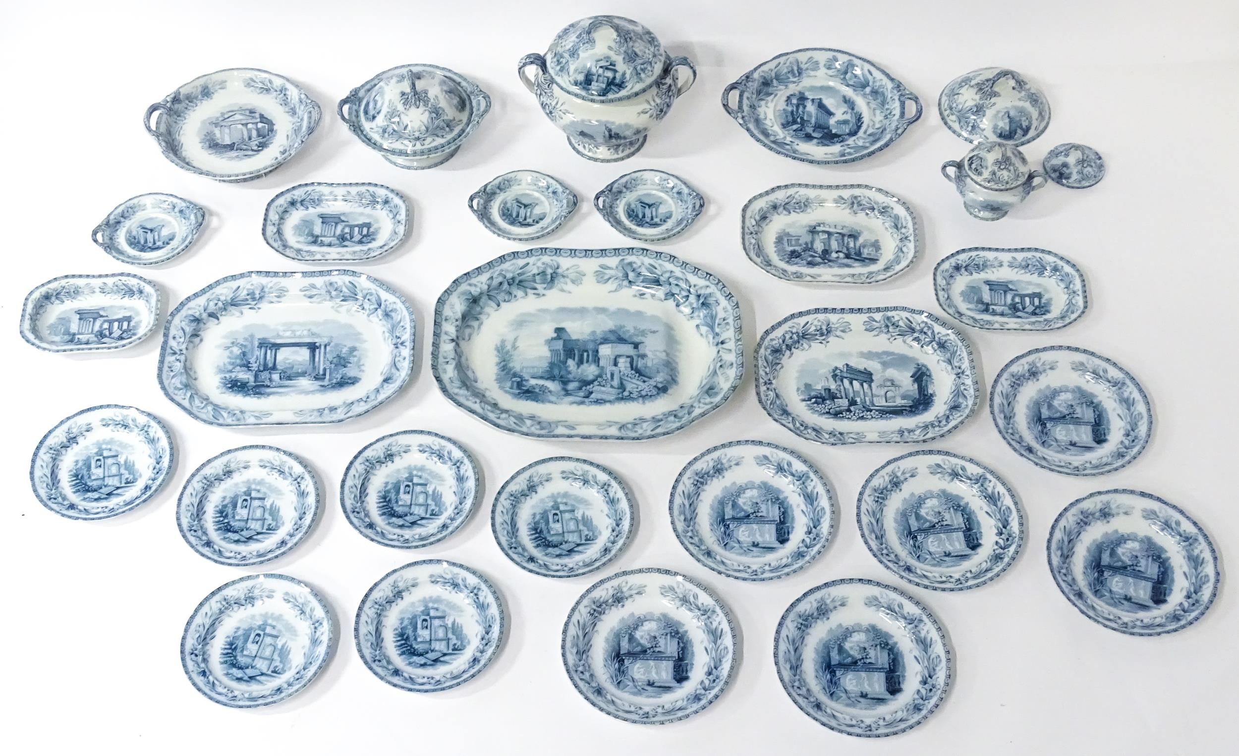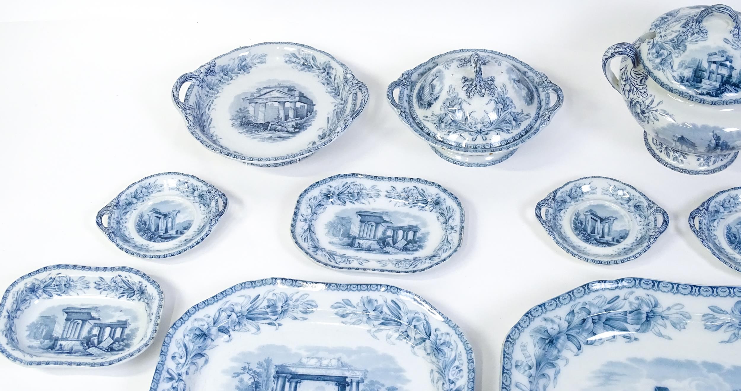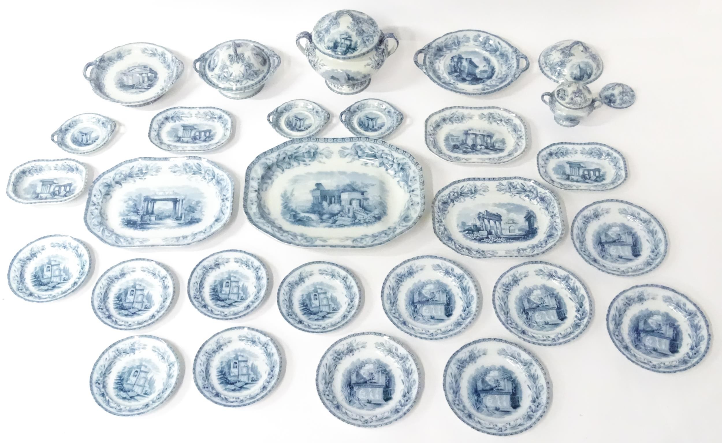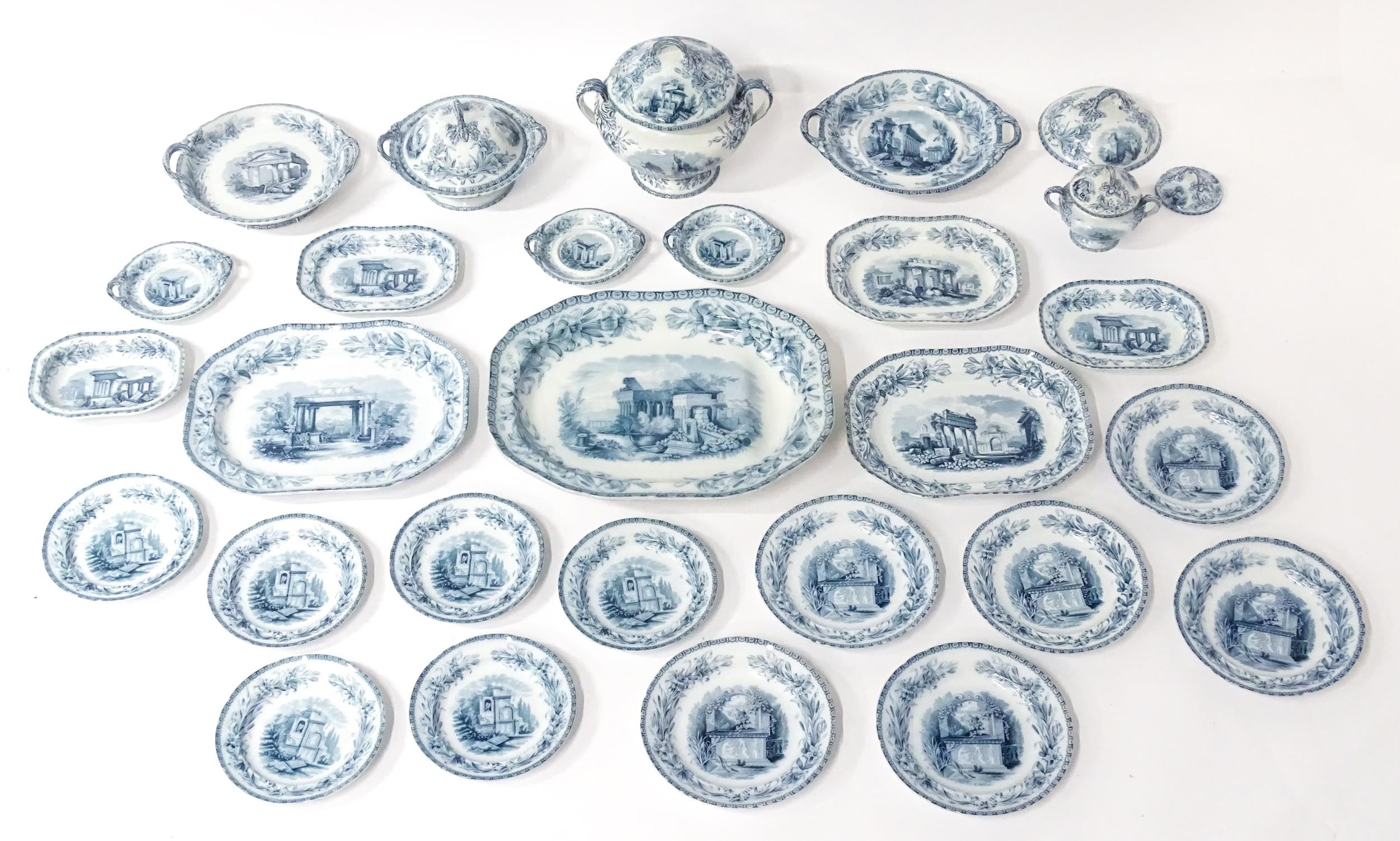 A quantity of Copeland late Spode blue and white dinner wares decorated with ruins to include plates, meat plates, serving dishes, tureens etc. Largest meat plate approx. 20 1/2" x 16"