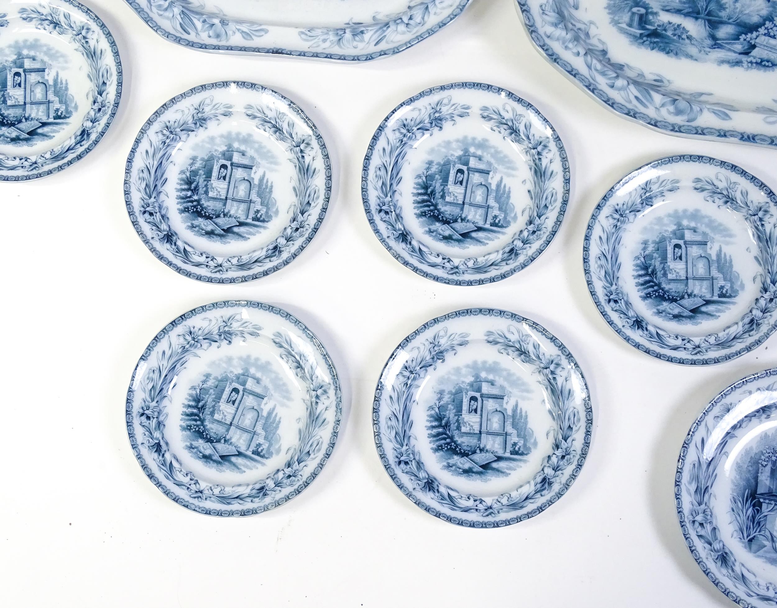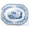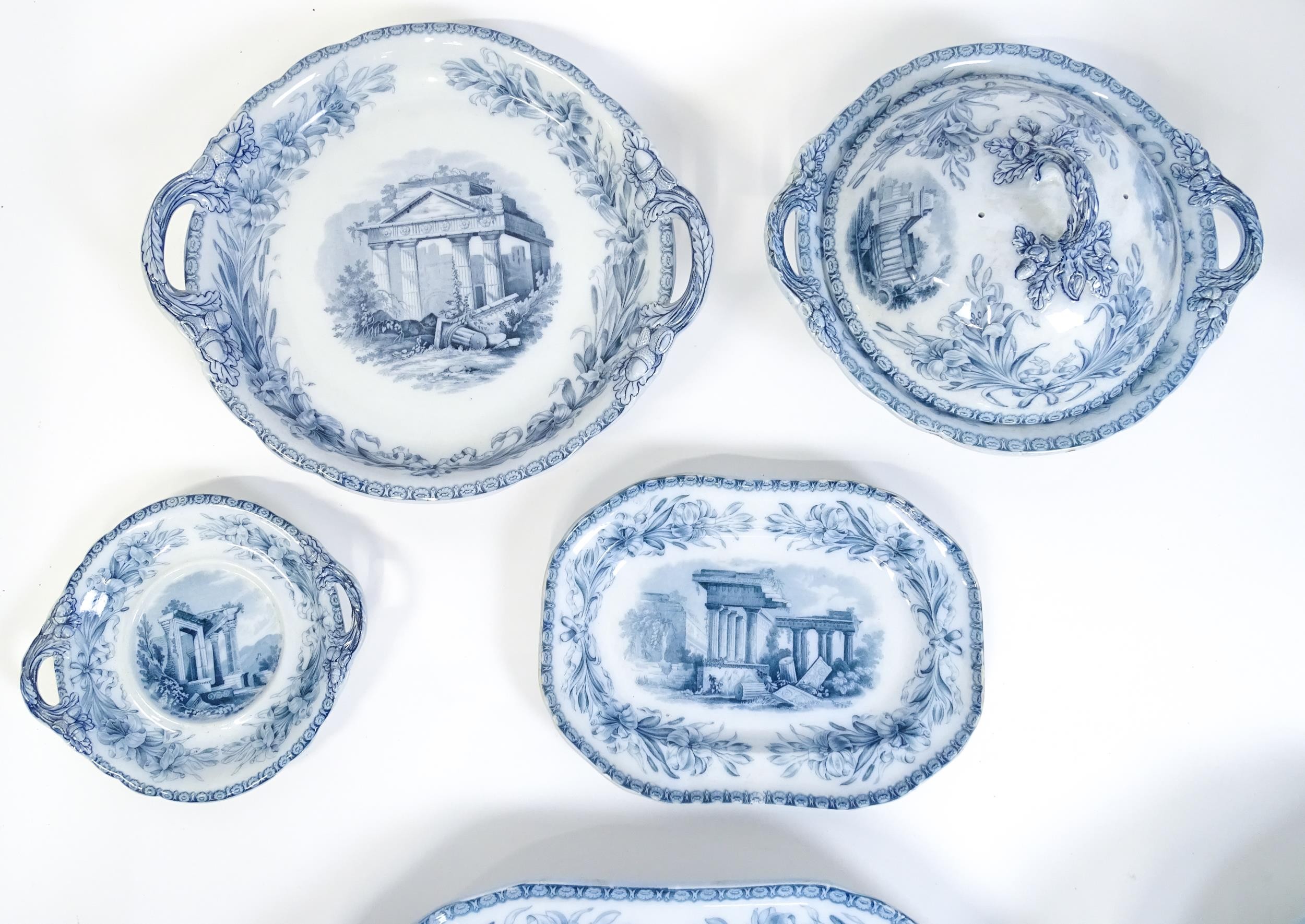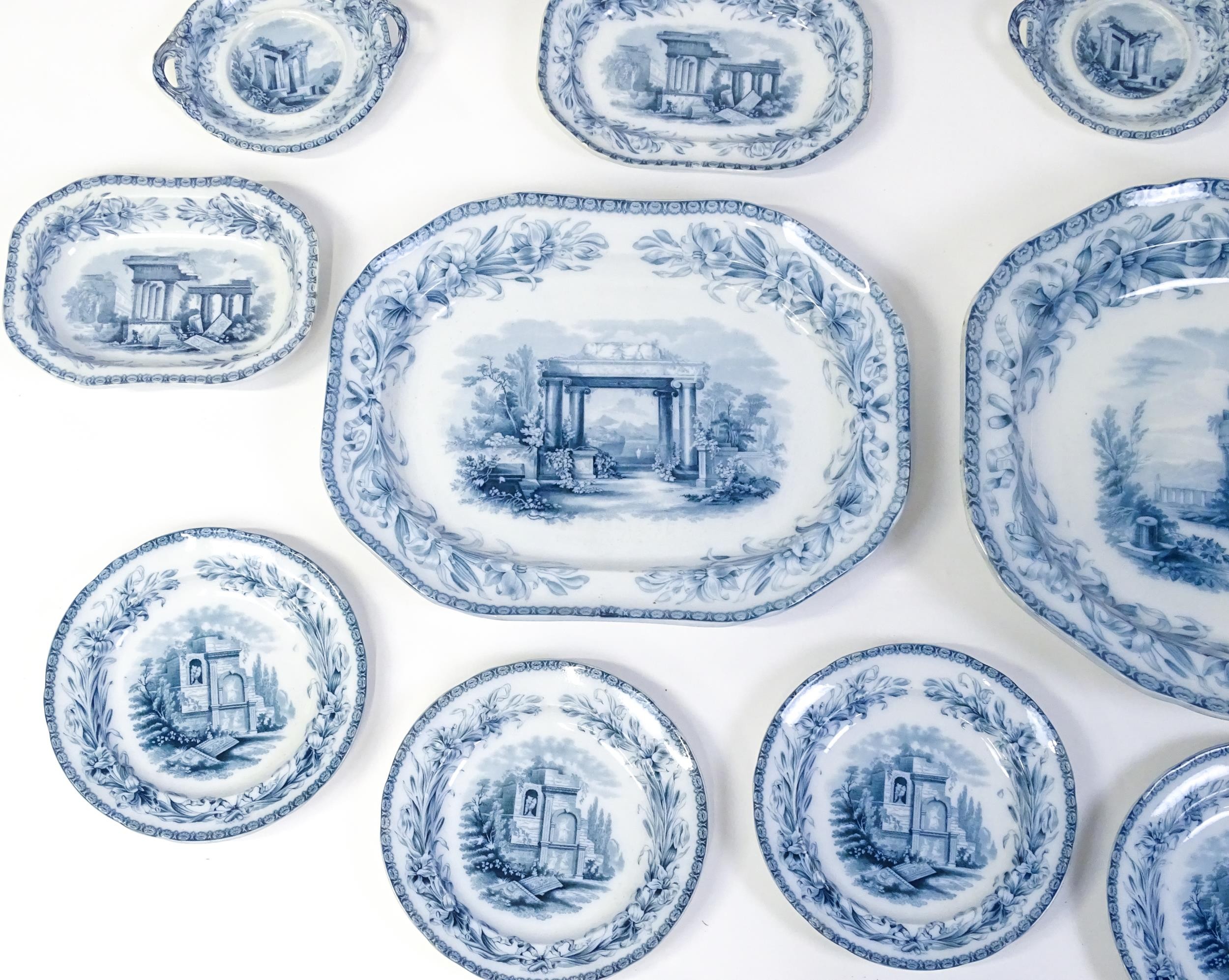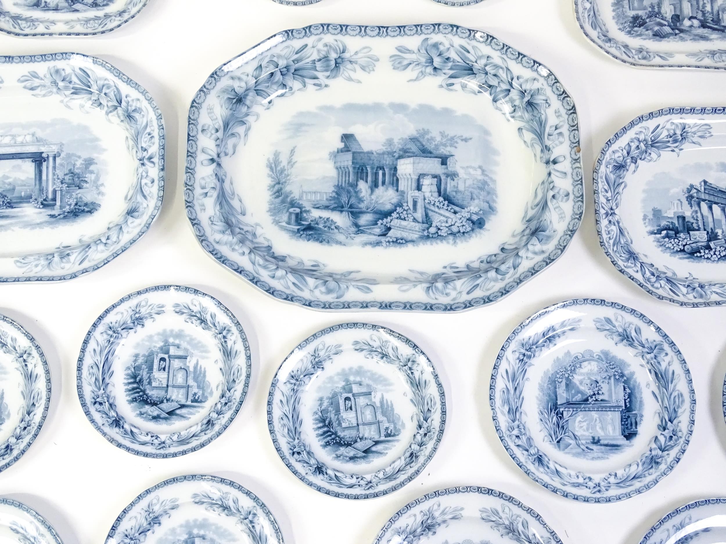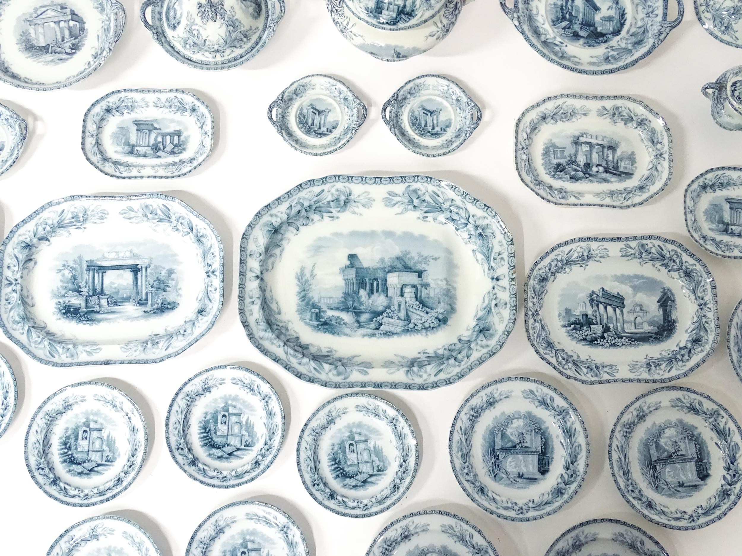A quantity of Copeland late Spode blue and white dinner wares decorated with ruins to include plates, meat plates, serving dishes, tureens etc. Largest meat plate approx. 20 1/2" x 16"