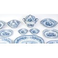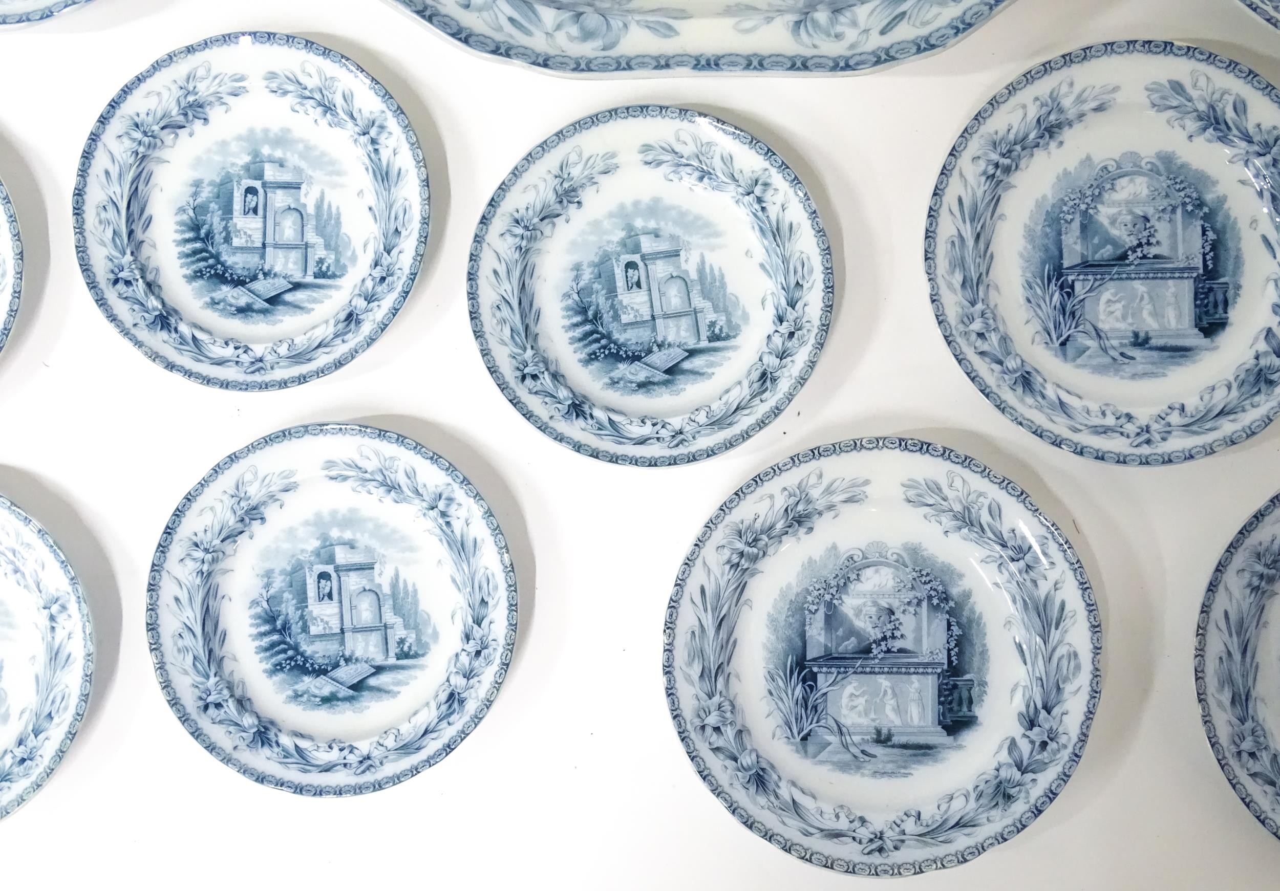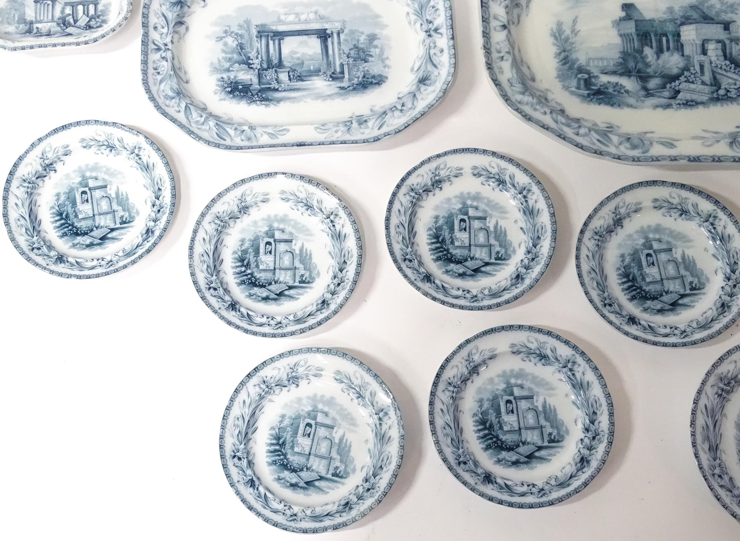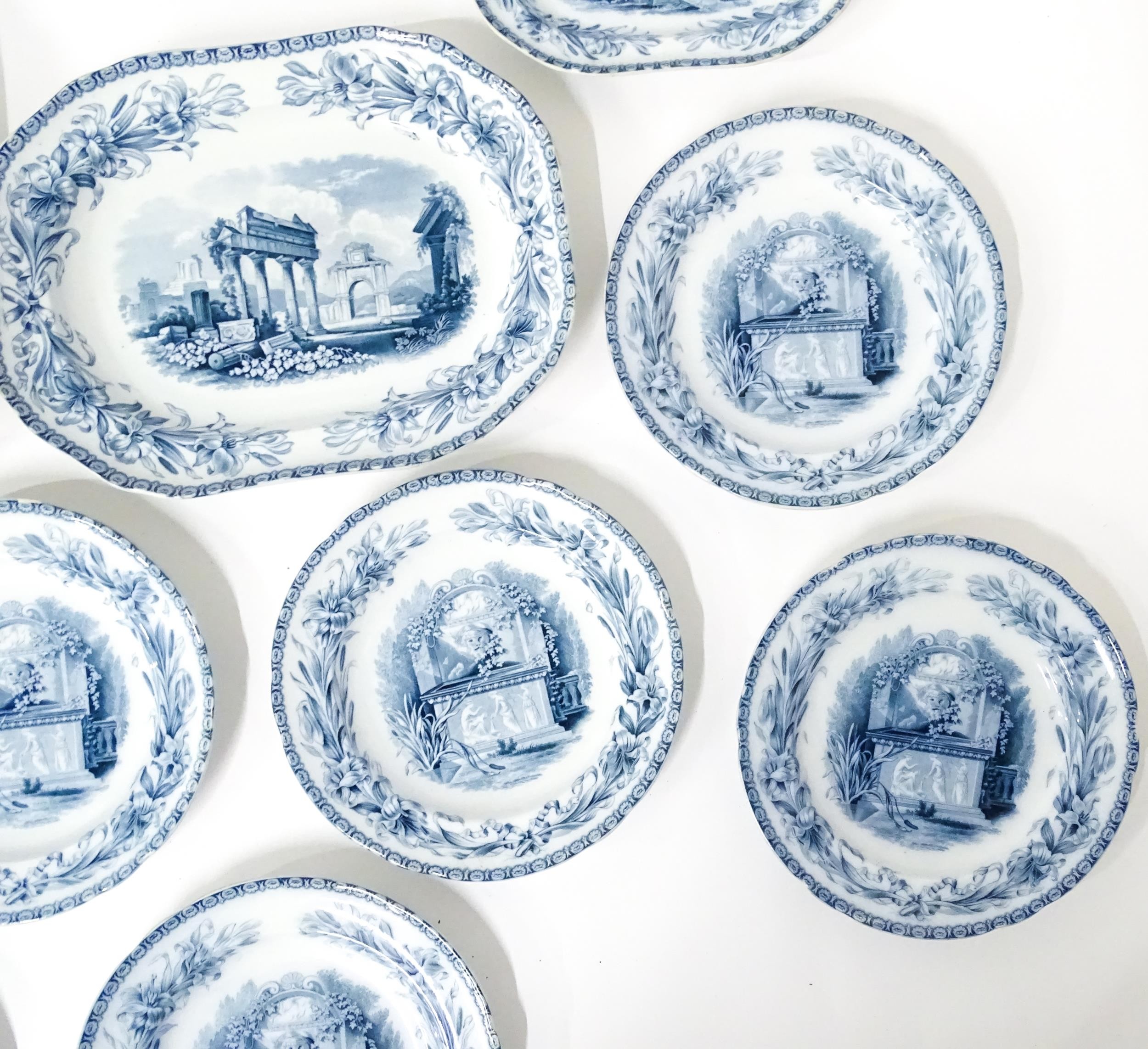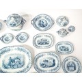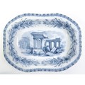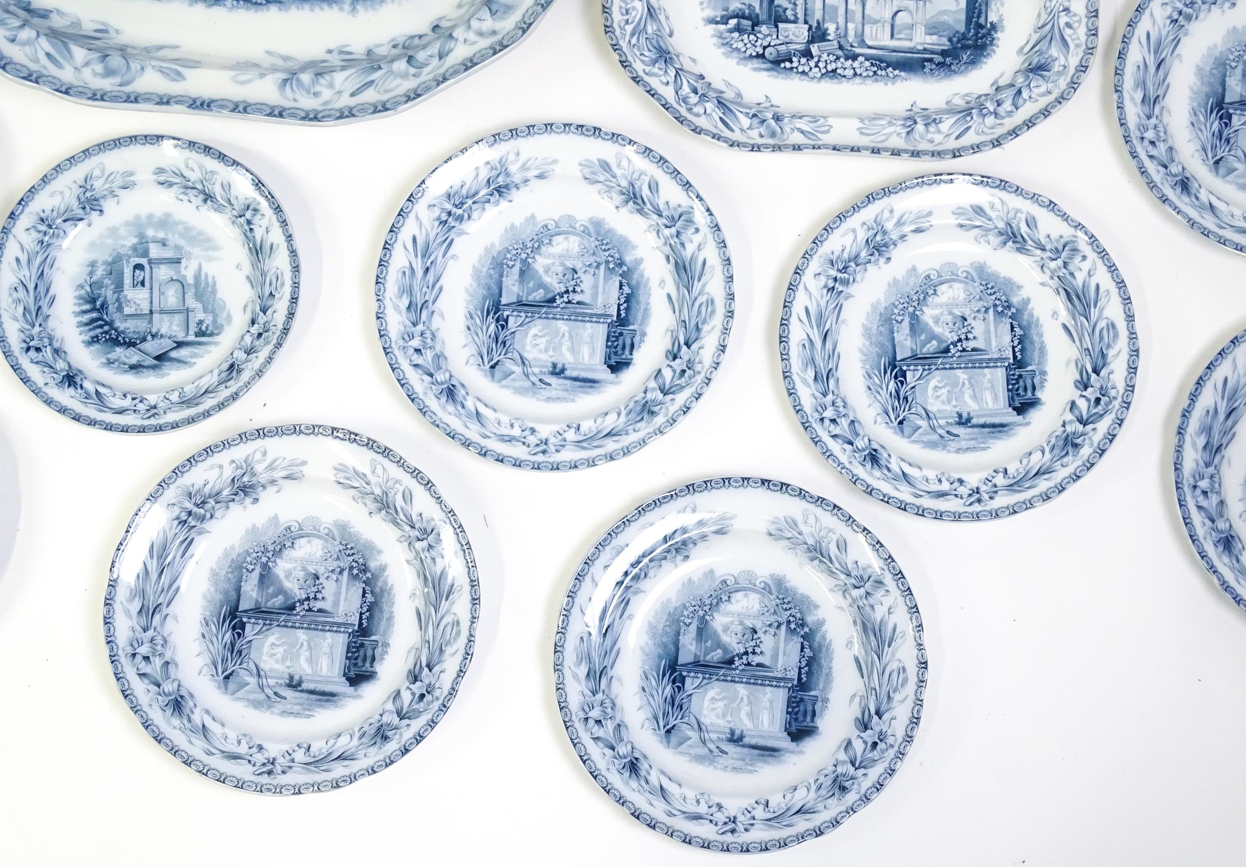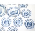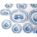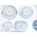 A quantity of Copeland late Spode blue and white dinner wares decorated with ruins to include plates, meat plates, serving dishes, tureens etc. Largest meat plate approx. 20 1/2" x 16"