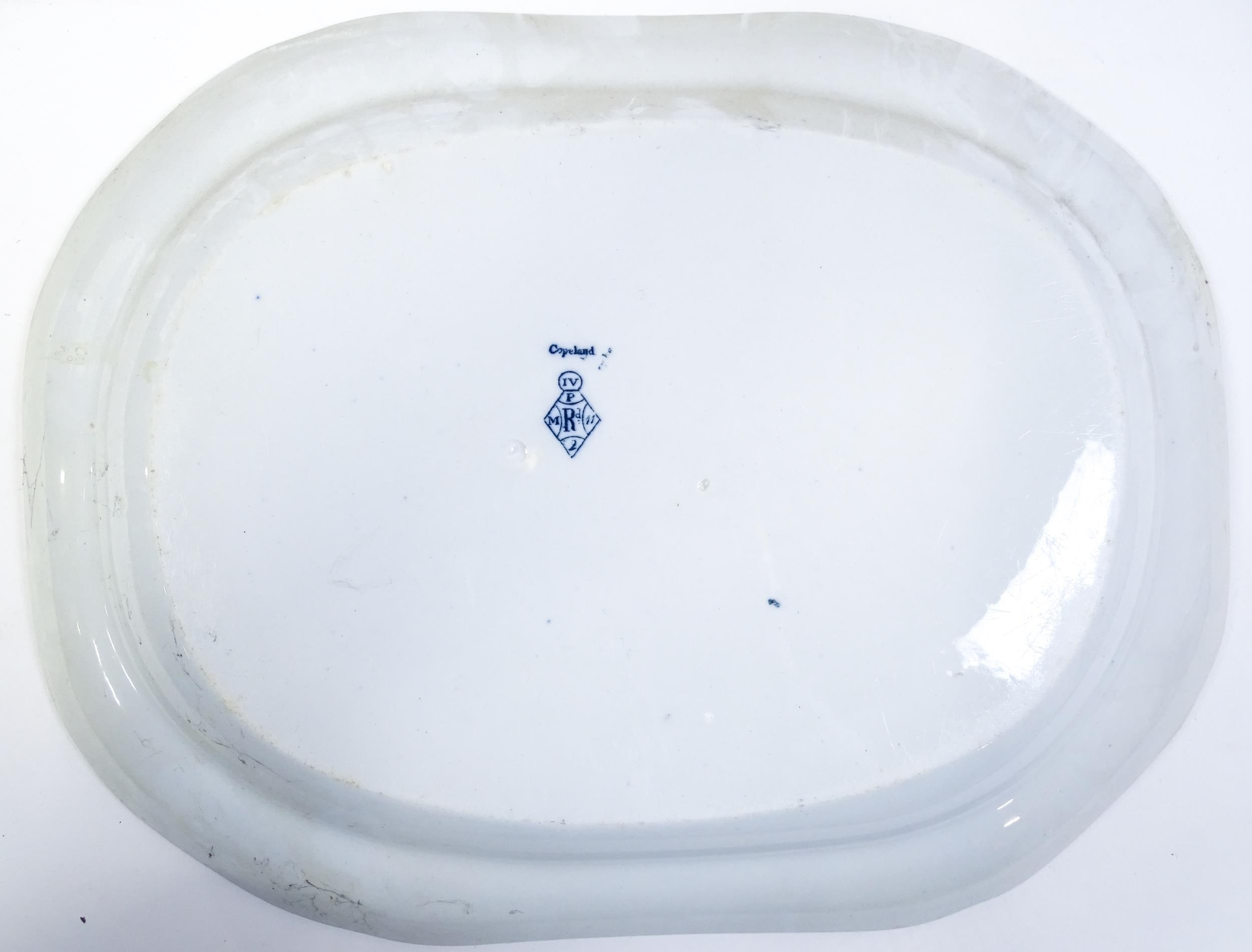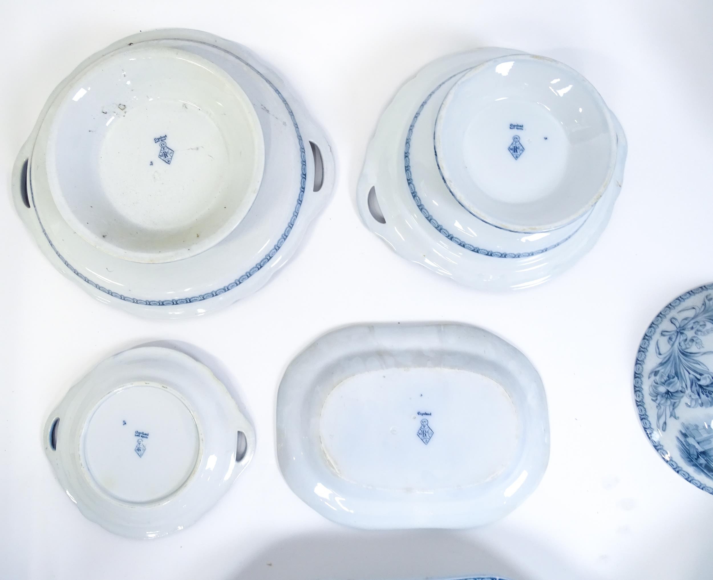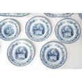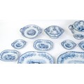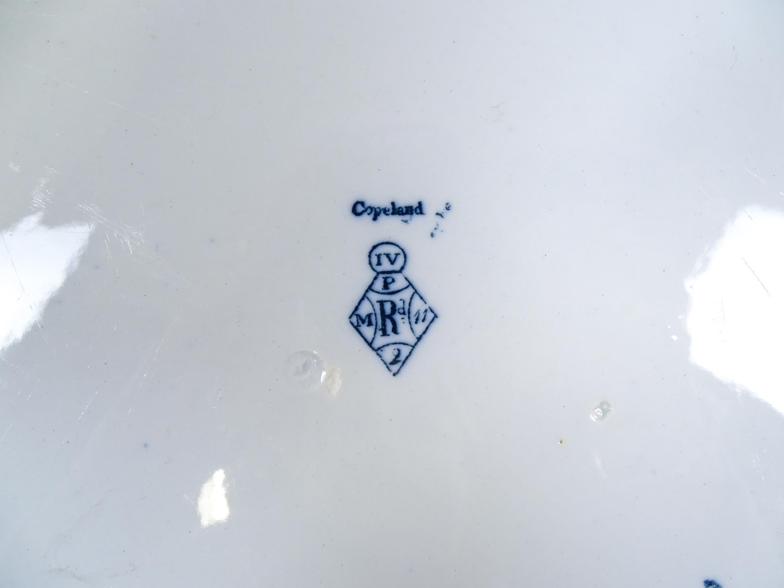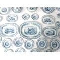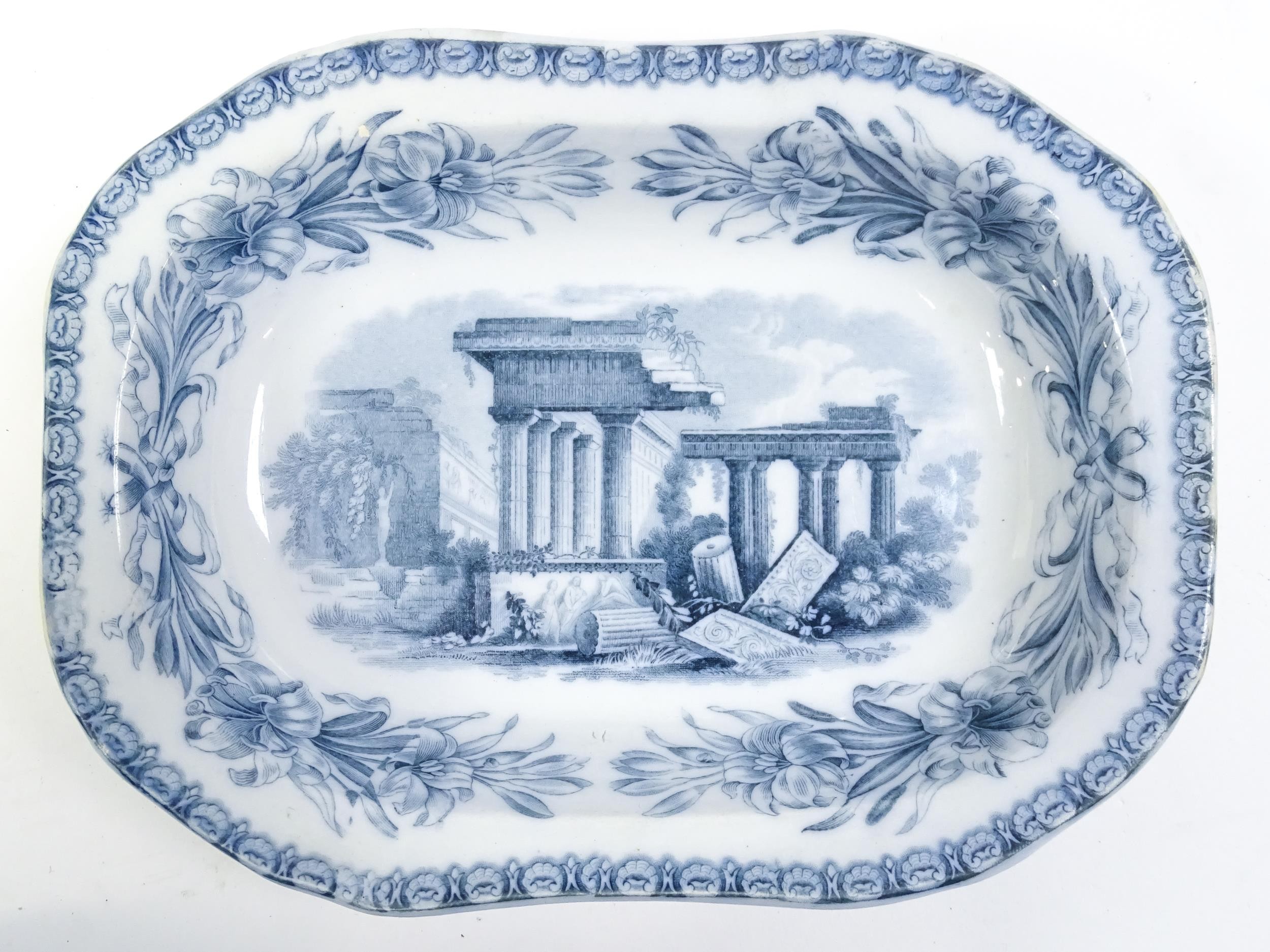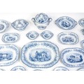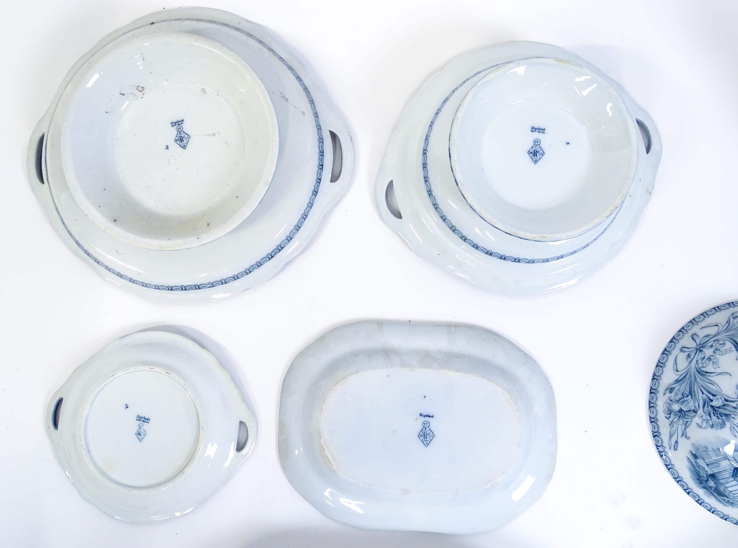 A quantity of Copeland late Spode blue and white dinner wares decorated with ruins to include plates, meat plates, serving dishes, tureens etc. Largest meat plate approx. 20 1/2" x 16"