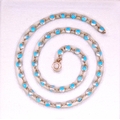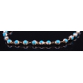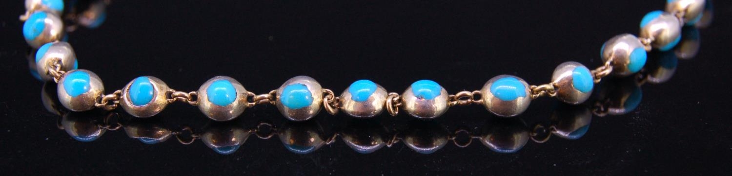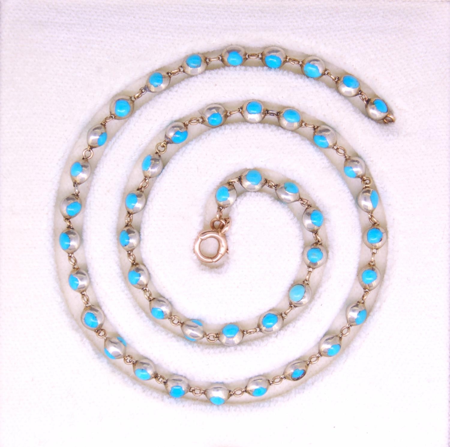 TURQUOISE LINK NECKLACE, precious white metal with 45 links double sided set with cabochon turquoise. L. 39 cm. 16.6 grams.