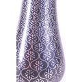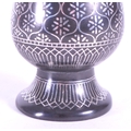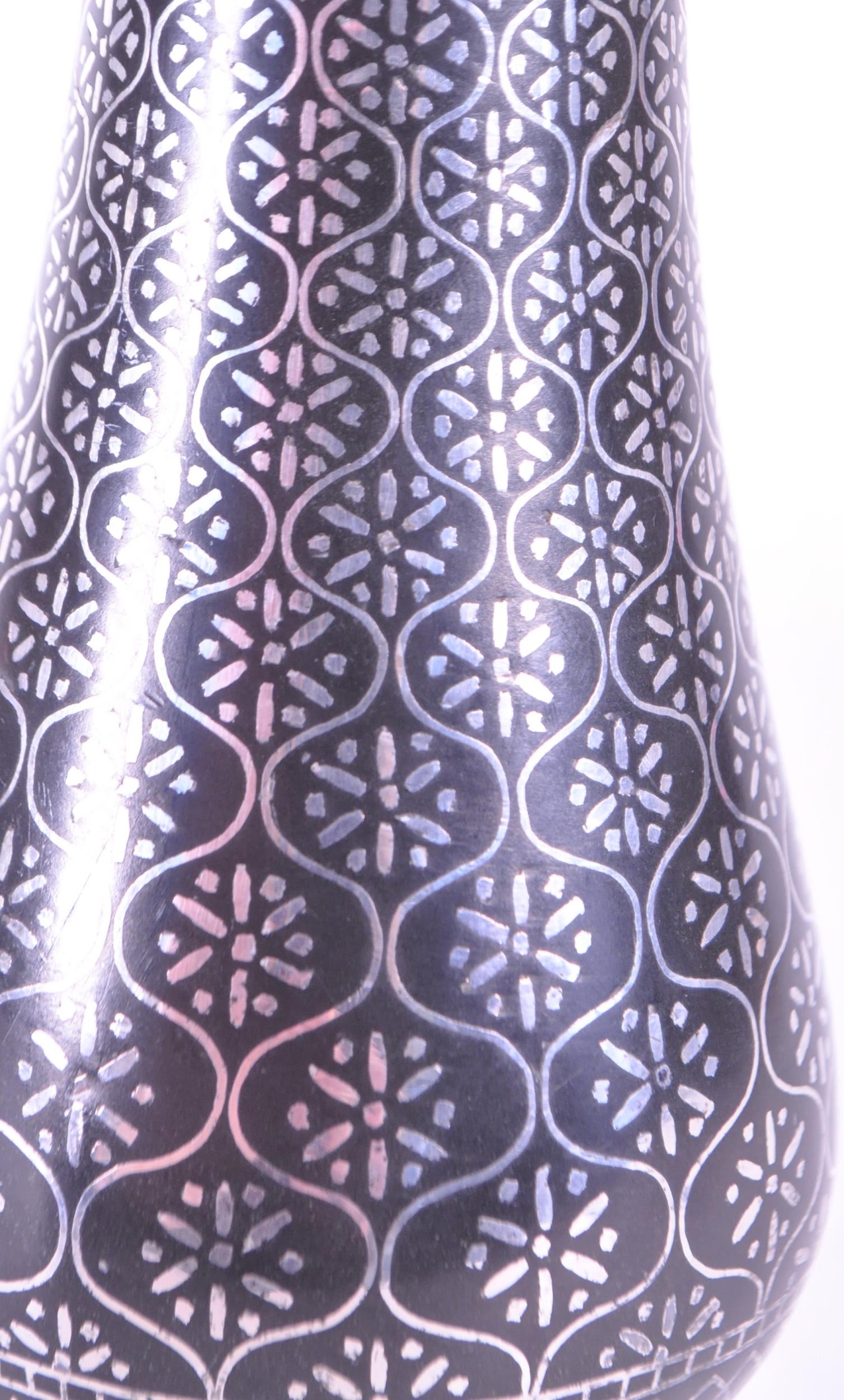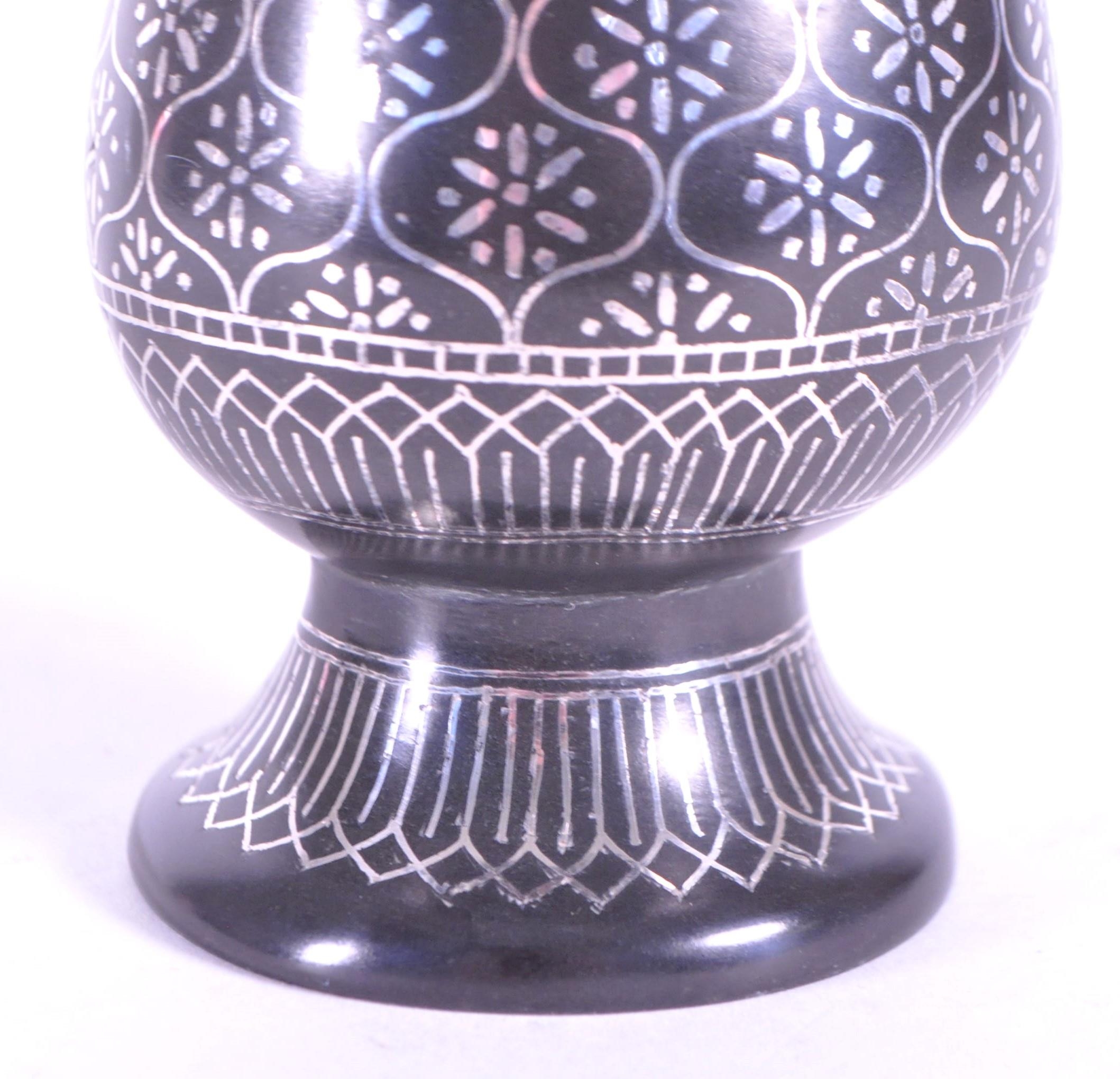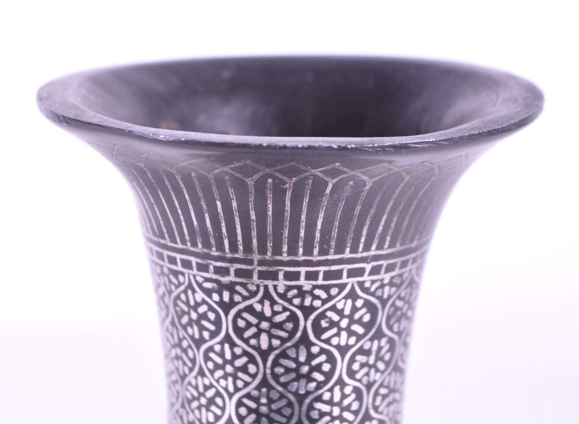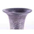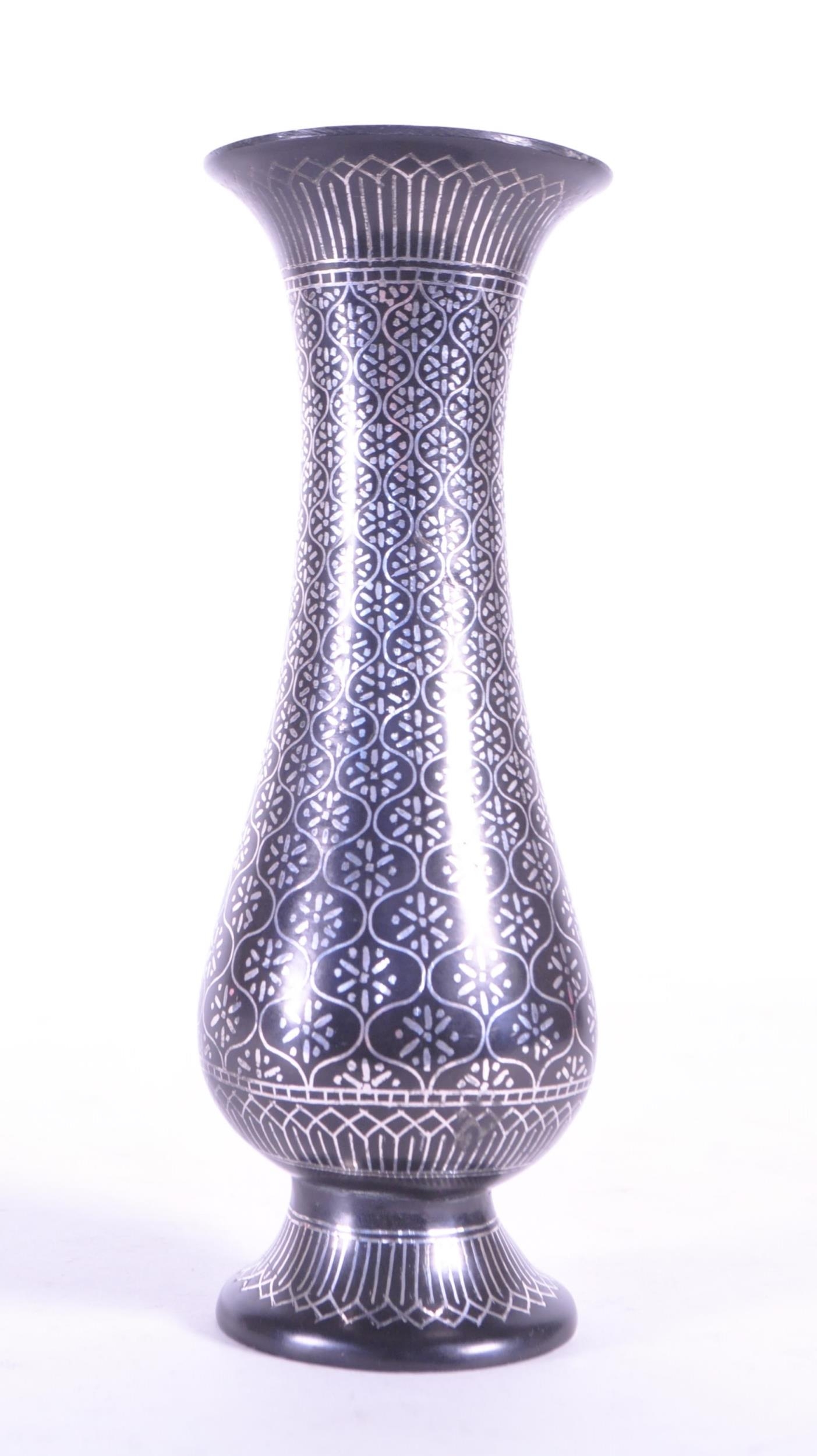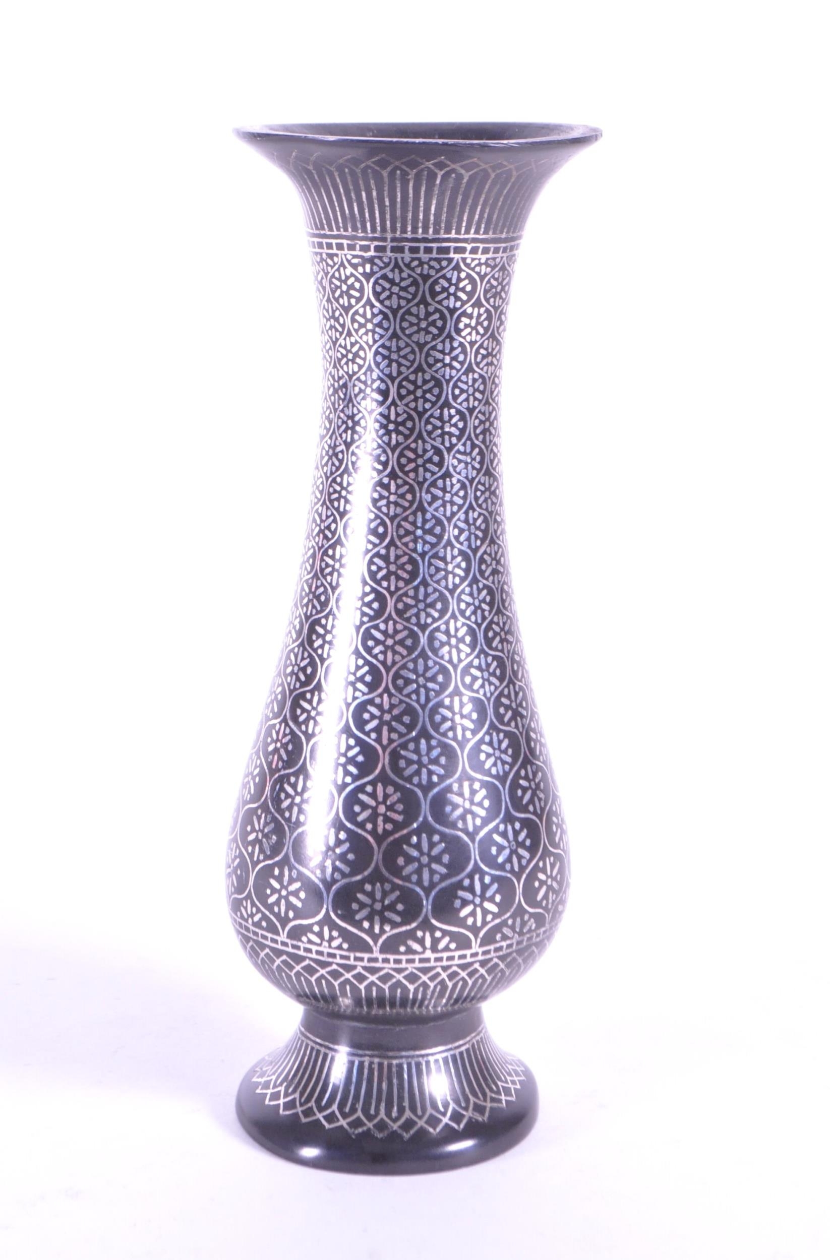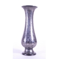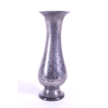 A vintage 20th century metal etched stem bud vase. With flared top into a tapering neck and tulip foot. Repeating geometric pattern to body.