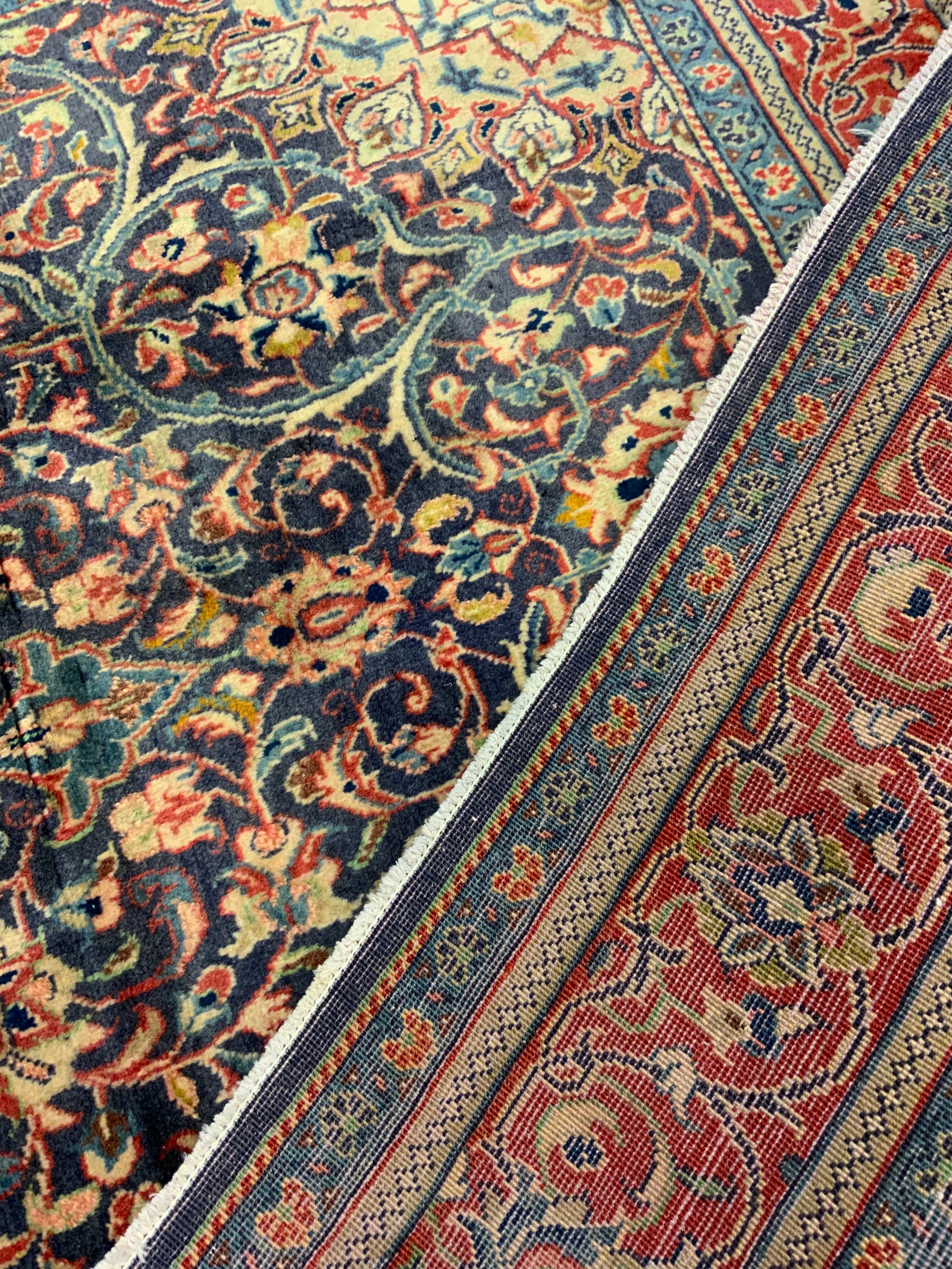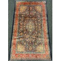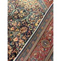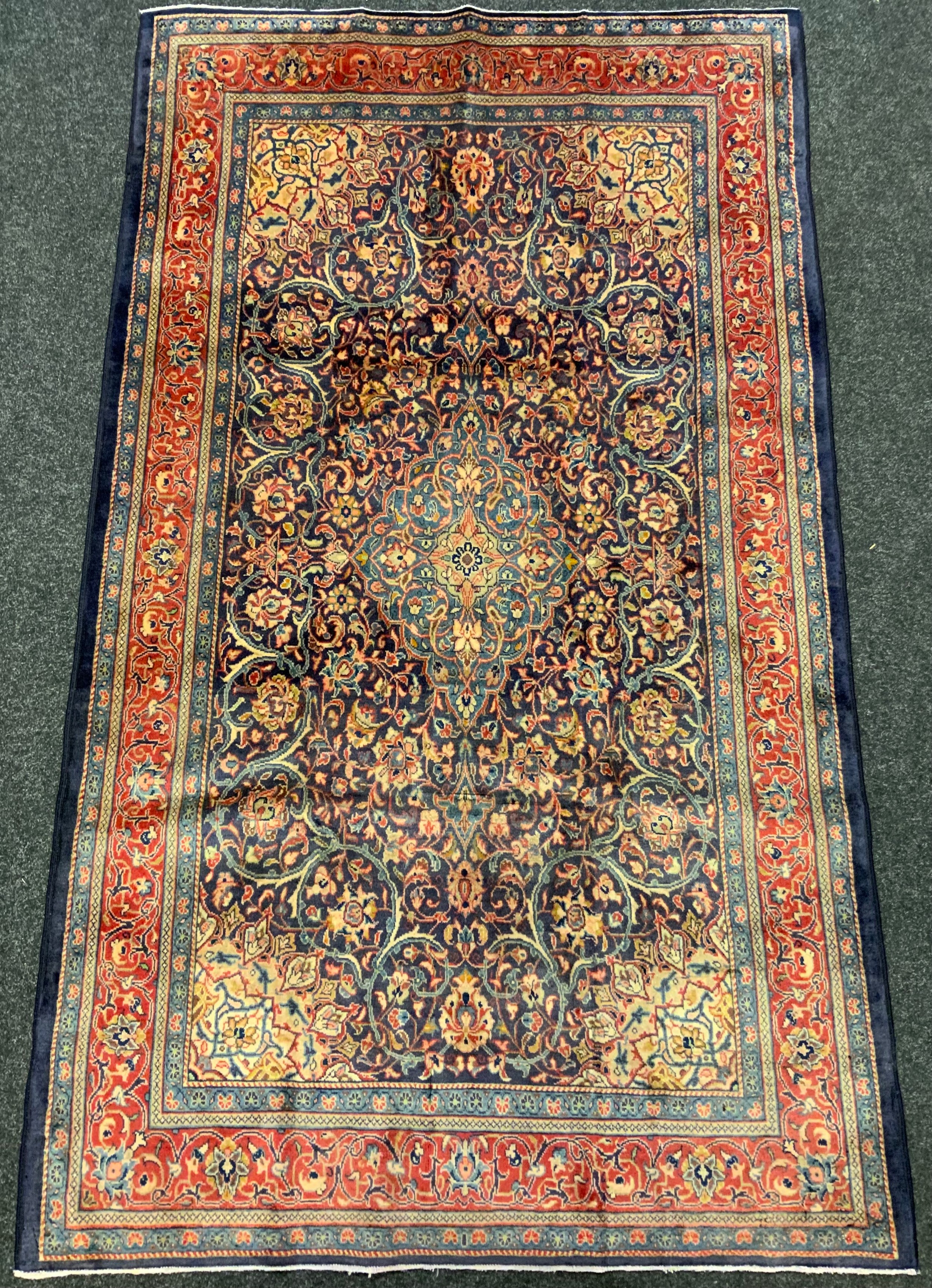 A Persian Sarough rug / carpet, having a diamond shaped medallion within a central field densely woven with stylised floral motifs, in shades of red, blue, and indigo, 225cm x 133cm.