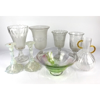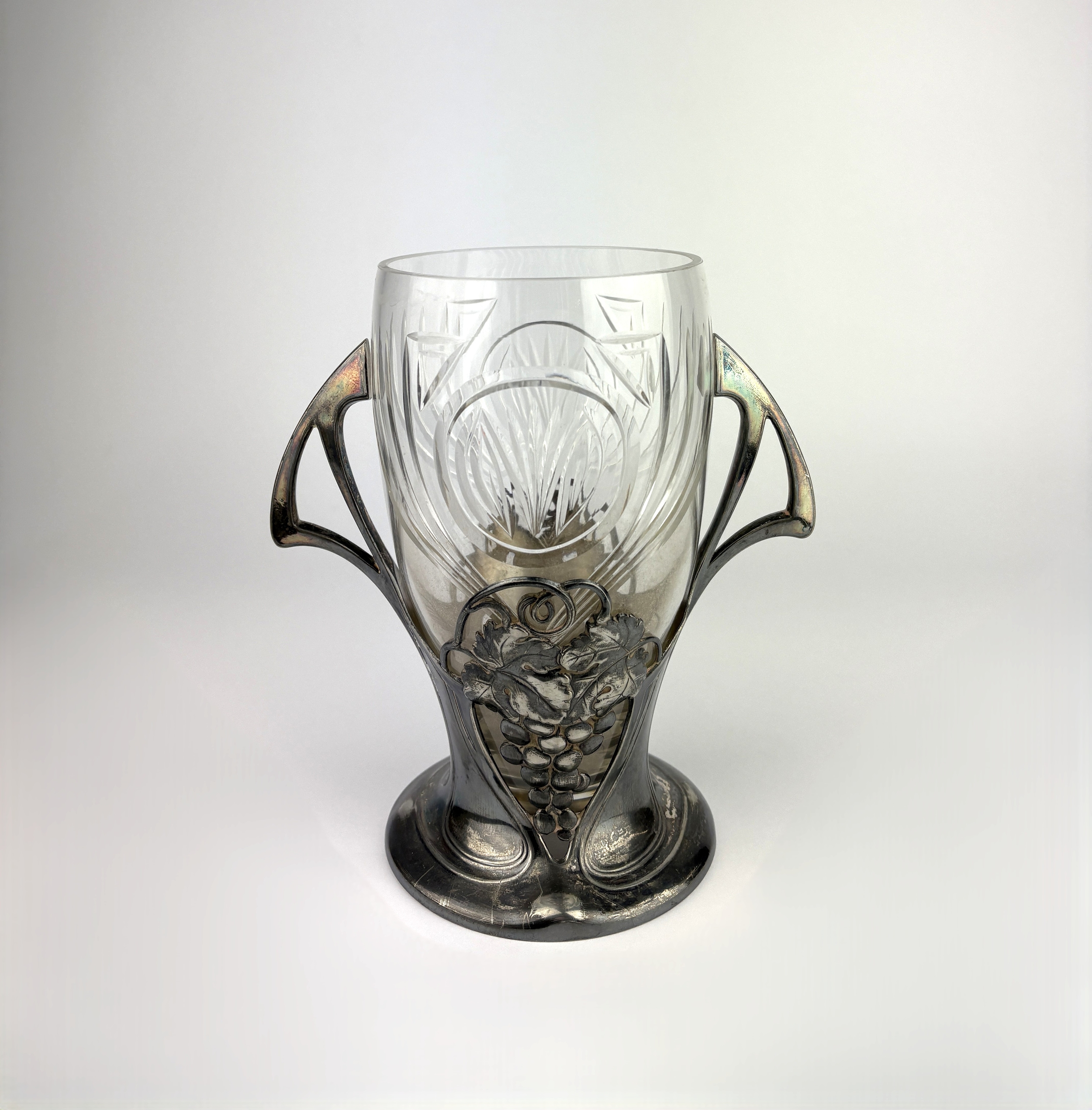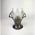 An Art Nouveau WMF (Württembergische Metallwarenfabrik) pewter celery stand or vase, with grape decoration and cut glass liner, 20cm high