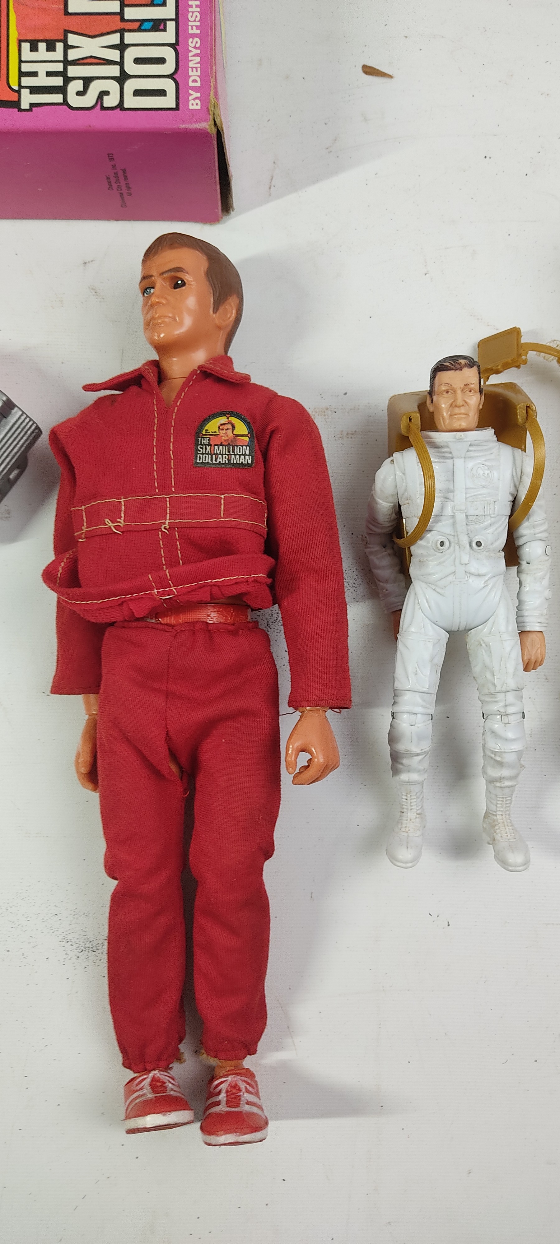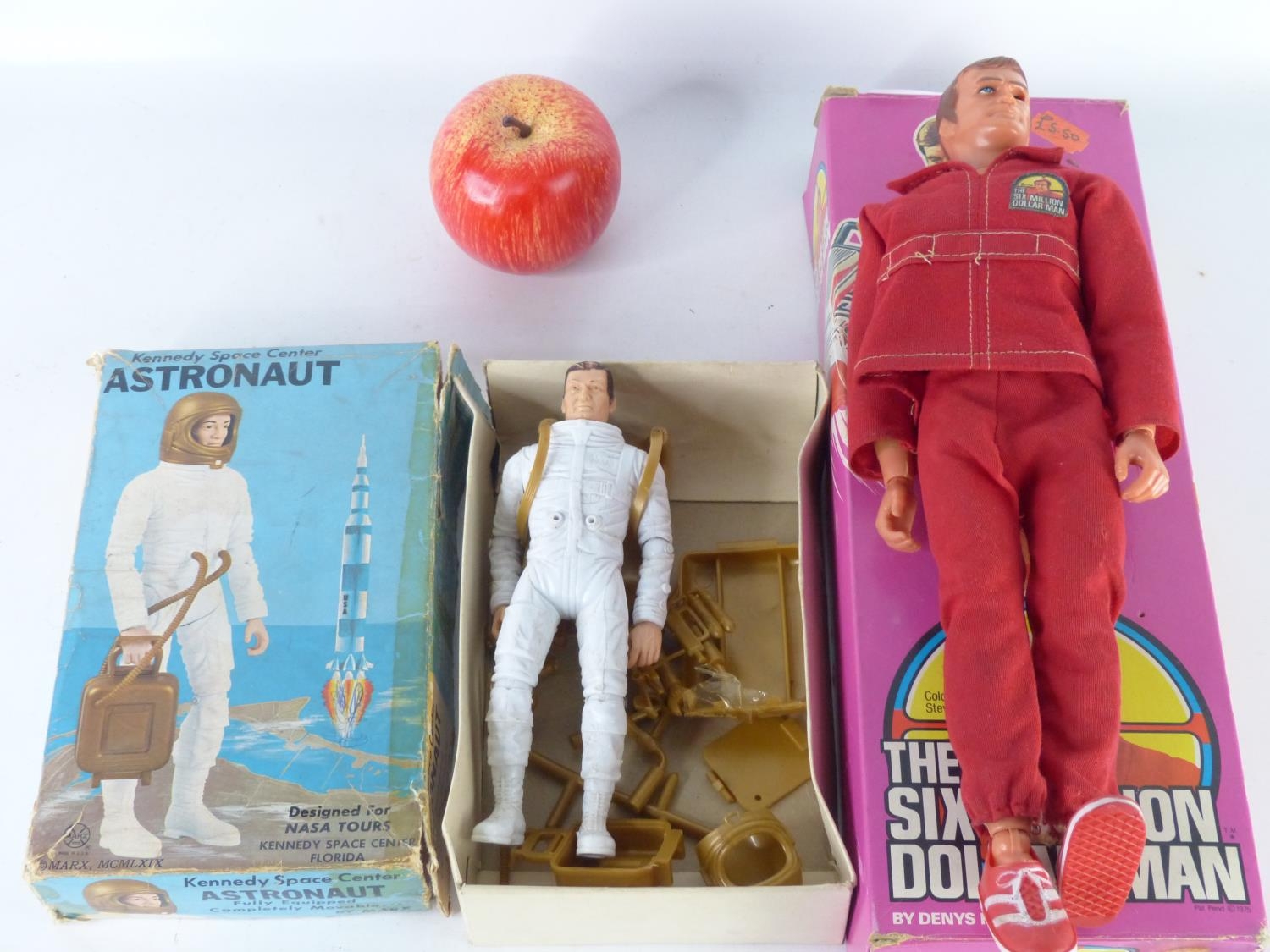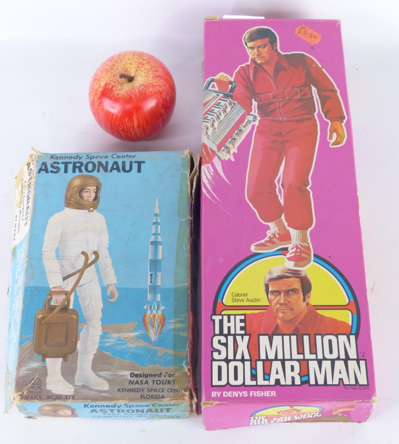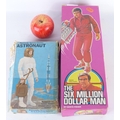 A vintage boxed Nasa Tours Kennedy Space Centre Florida toy figure and an original boxed Six Million Dollar Man figure by Dennys Fisher.