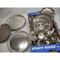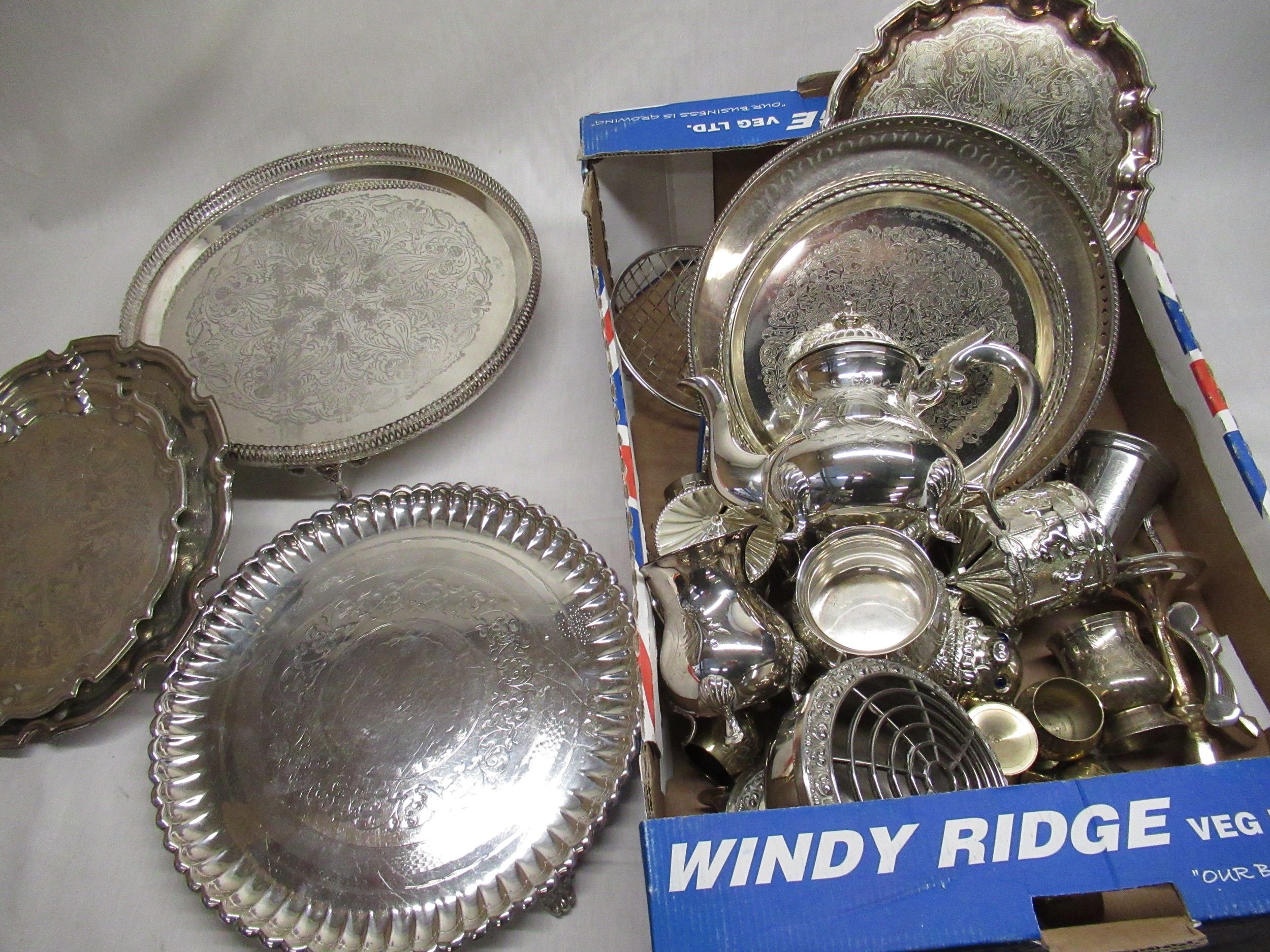 Late Victorian silver plated salver with monogrammed initials, bright cut decorations on three - scroll feet. Diameter 33.5cm. A selection of Lotus pattern silver plated ware including serving trays