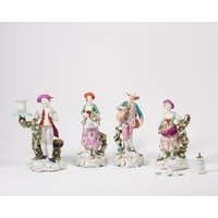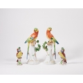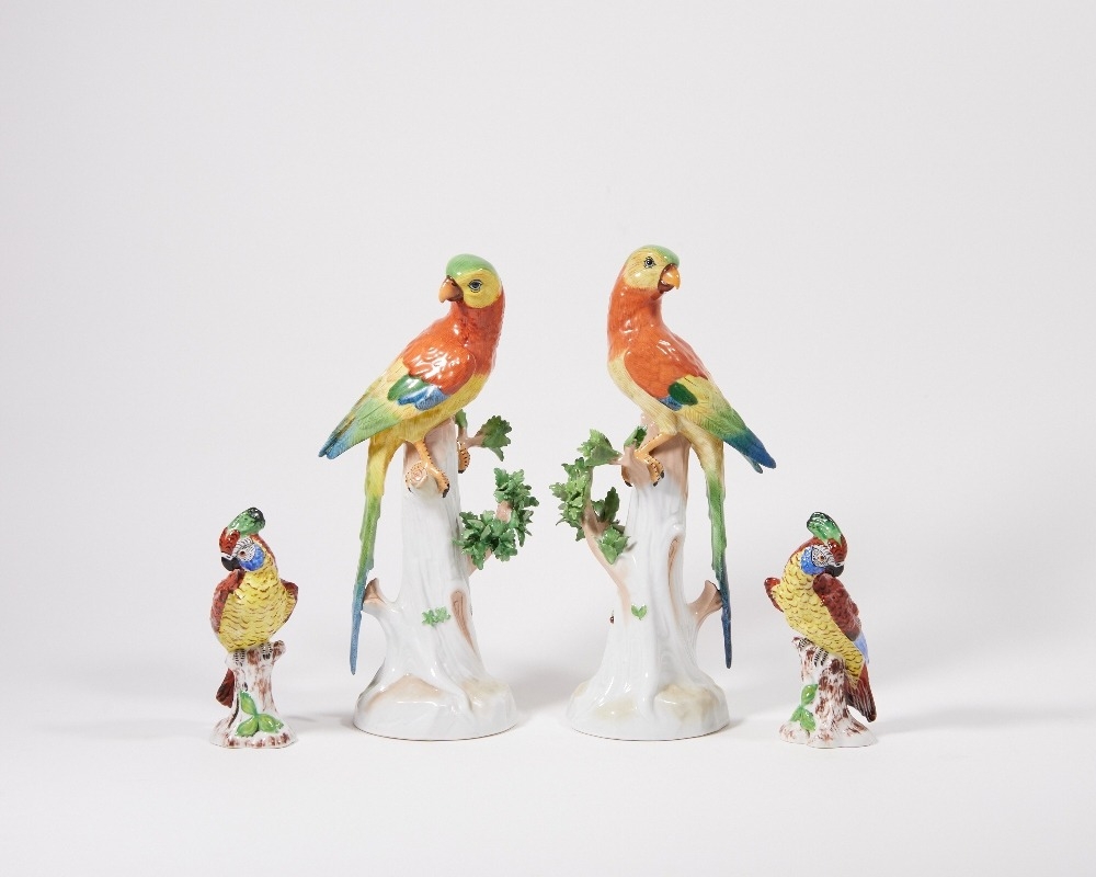 Four Continental porcelain models of birds, late 19th / early 20th century, comprising: two Dresden parrots in the manner of Meissen, blue printed marks, and two cockatoos, pseudo-Chelsea gold anchor marks, both pairs modelled with colourful plumage and perched on leafy tree stumps, the parrots 32cm high, the cockatoos 15.5cm high (4)
