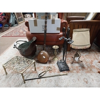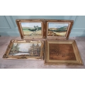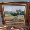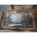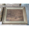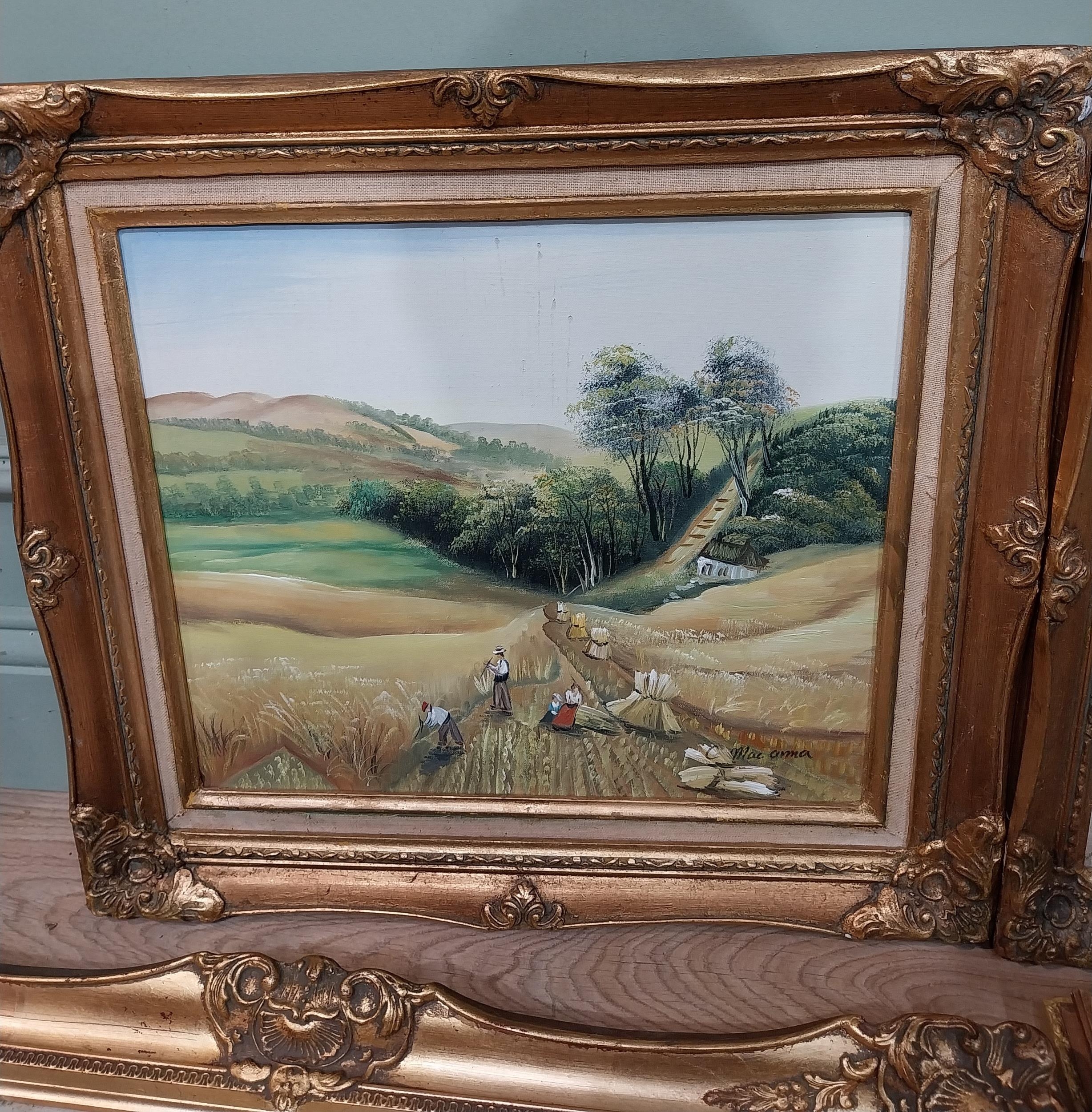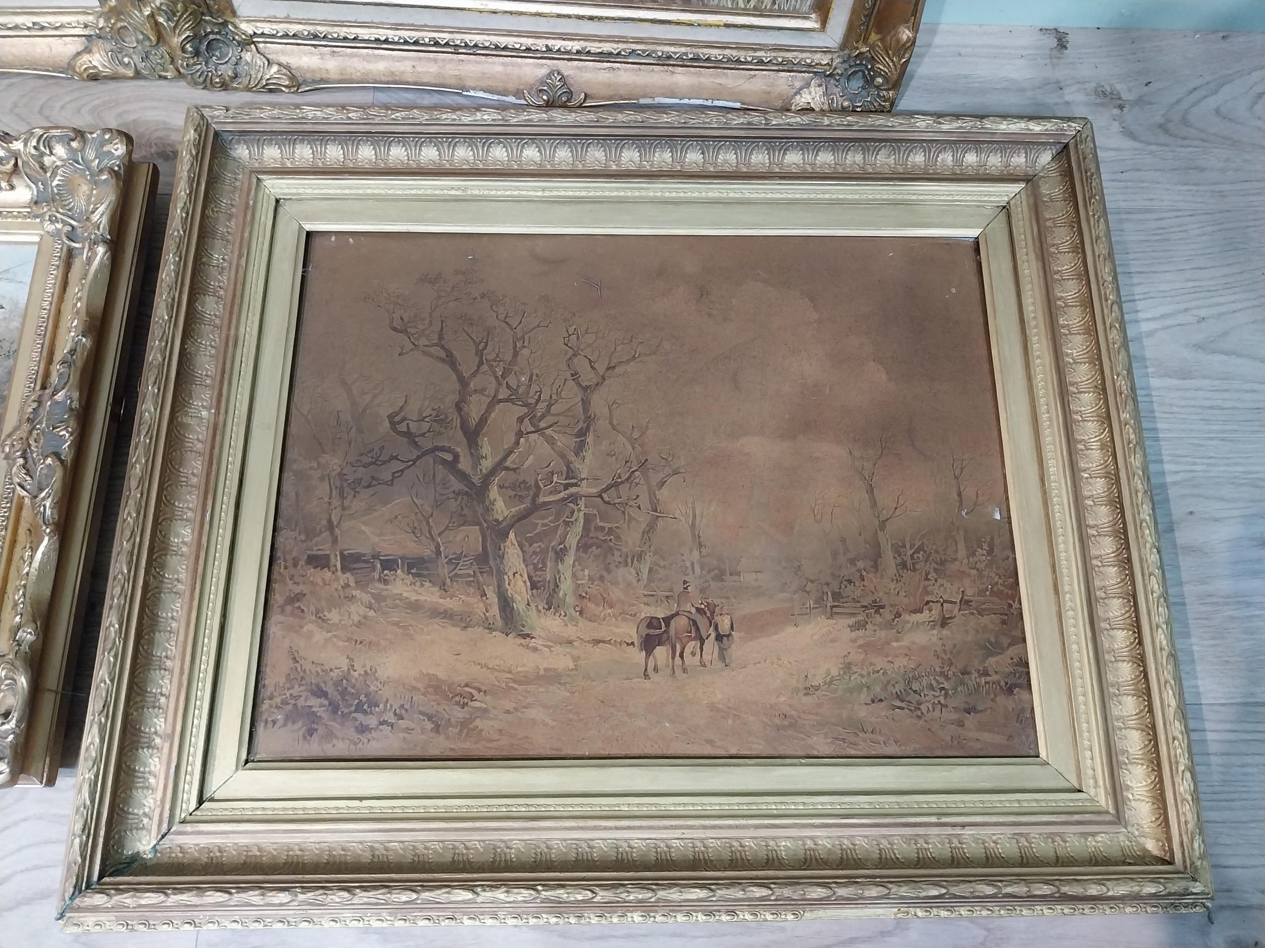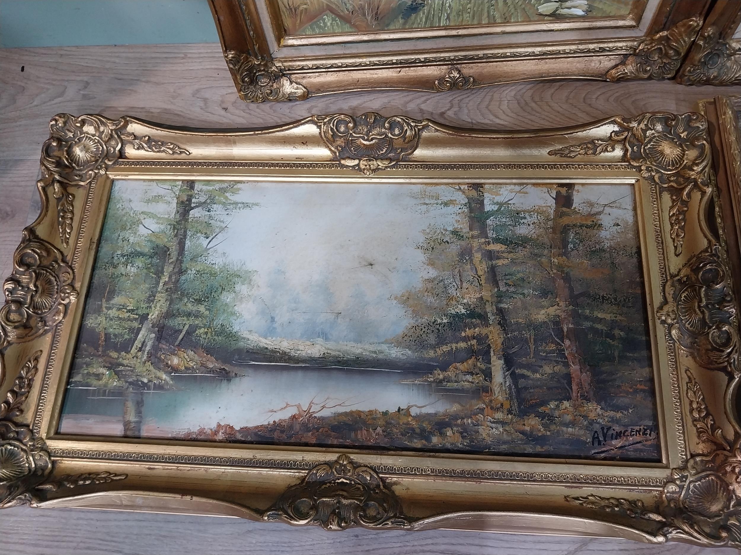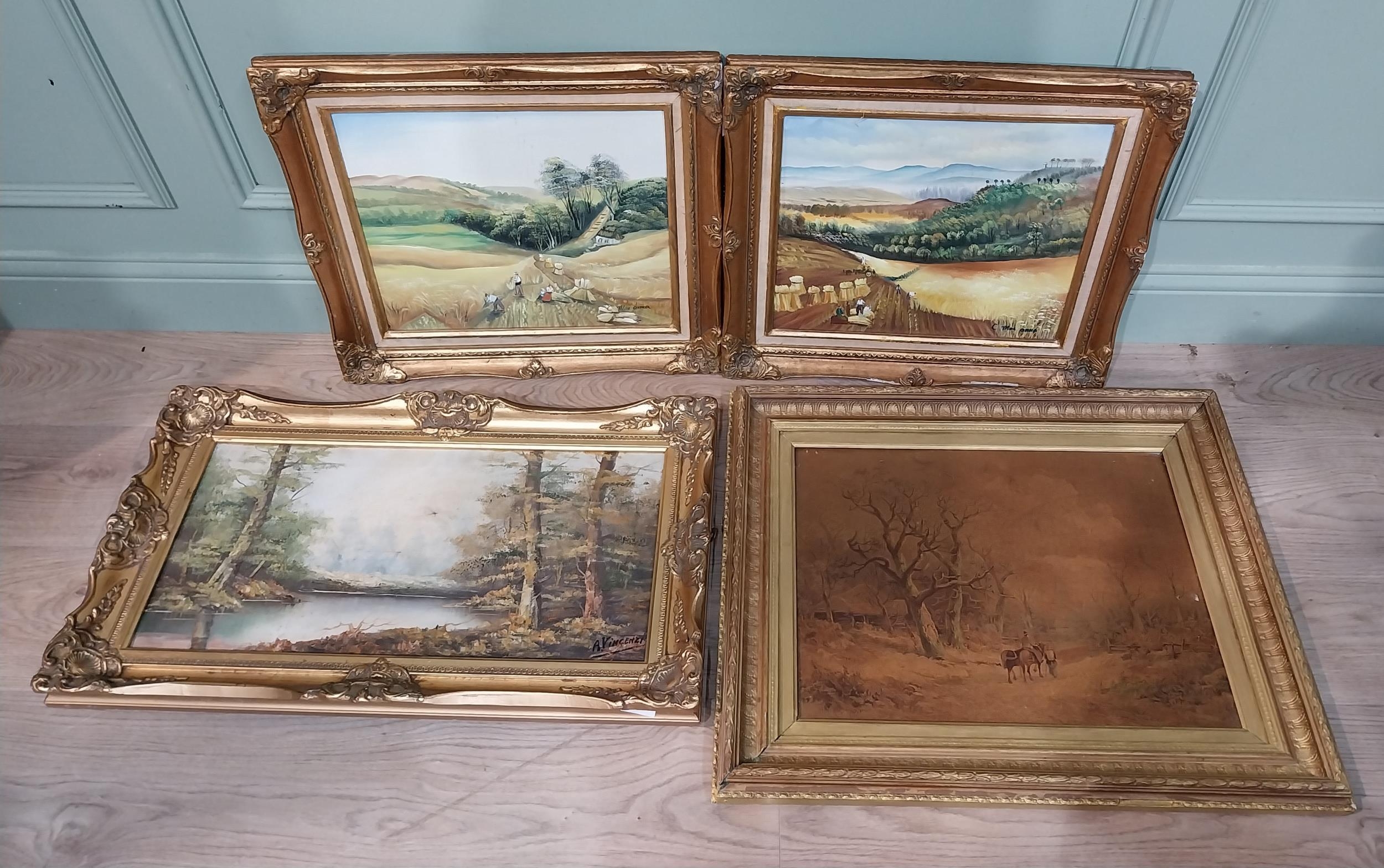 Pair of oleographs mounted in giltwood framed Harvest Scenes signed C Mac Anna. {49 cm H x 55 cm W}, Oil on canvas River and Woodland Scene signed A Vincenzi mounted in gilt frame. {43 cm H x 73 cm W} and Gilt framed olegraph board Horse and Forest Scene. {55 cm H x 70 cm W}