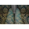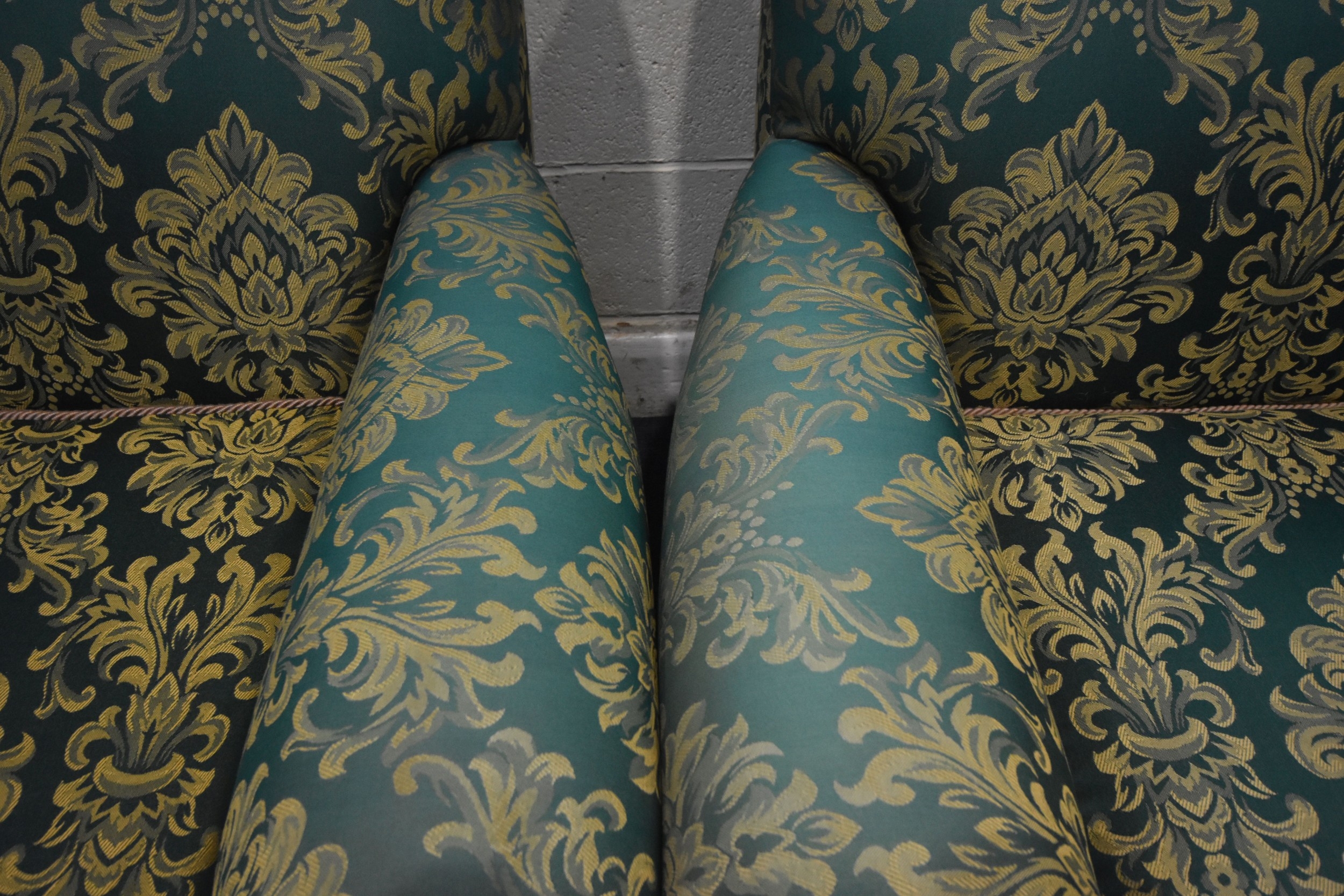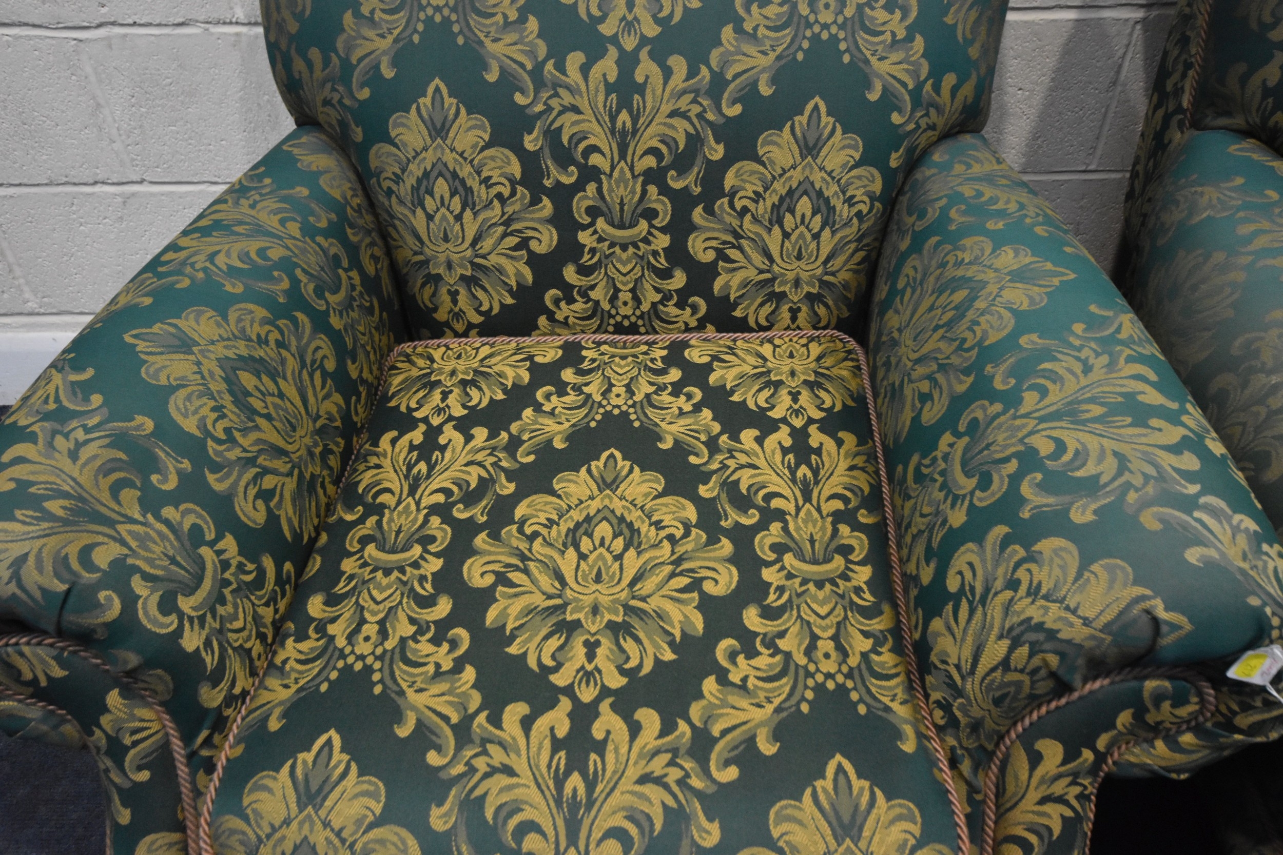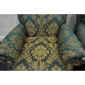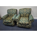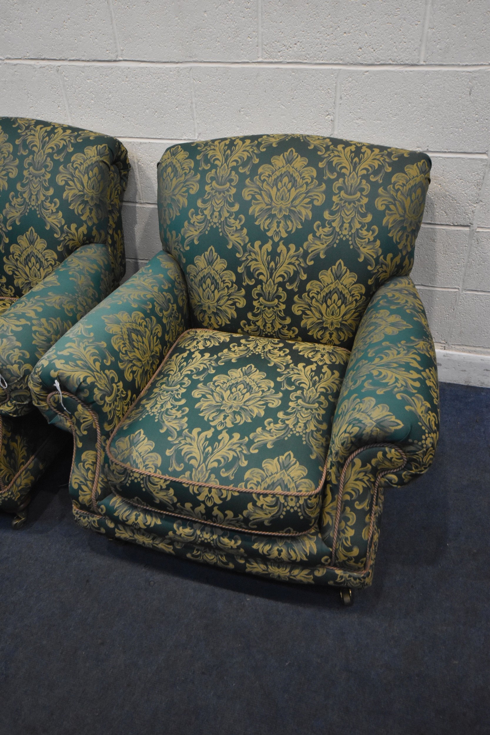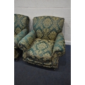 A PAIR OF KIRKDALE GREEN AND FOLIATE UPHOLSTERED ARMCHAIRS, raised on turned front legs, with brass caps and castors, width 98cm x depth 103cm x height 92cm, condition report: general signs of wear and usage, slight discolouration, no visible rips or tears (2)