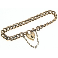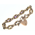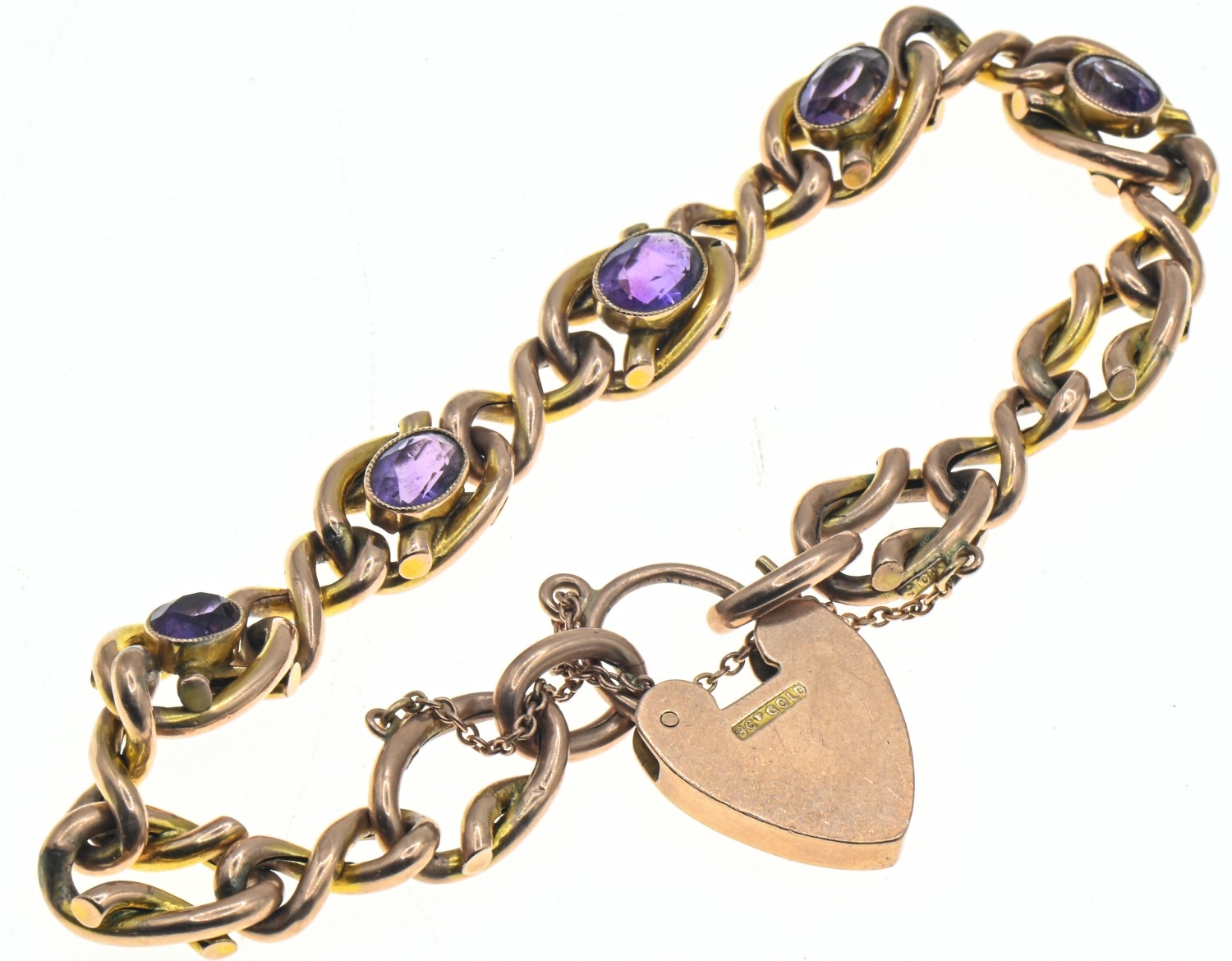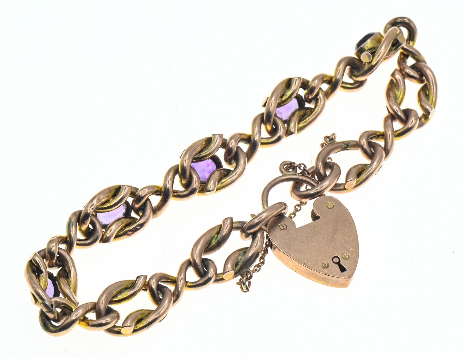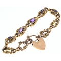 Amethyst set fancy link bracelet with a heart-shaped padlock clasp, clasp marked '9CT GOLD', with safety chain, gross weight 14.4 grams