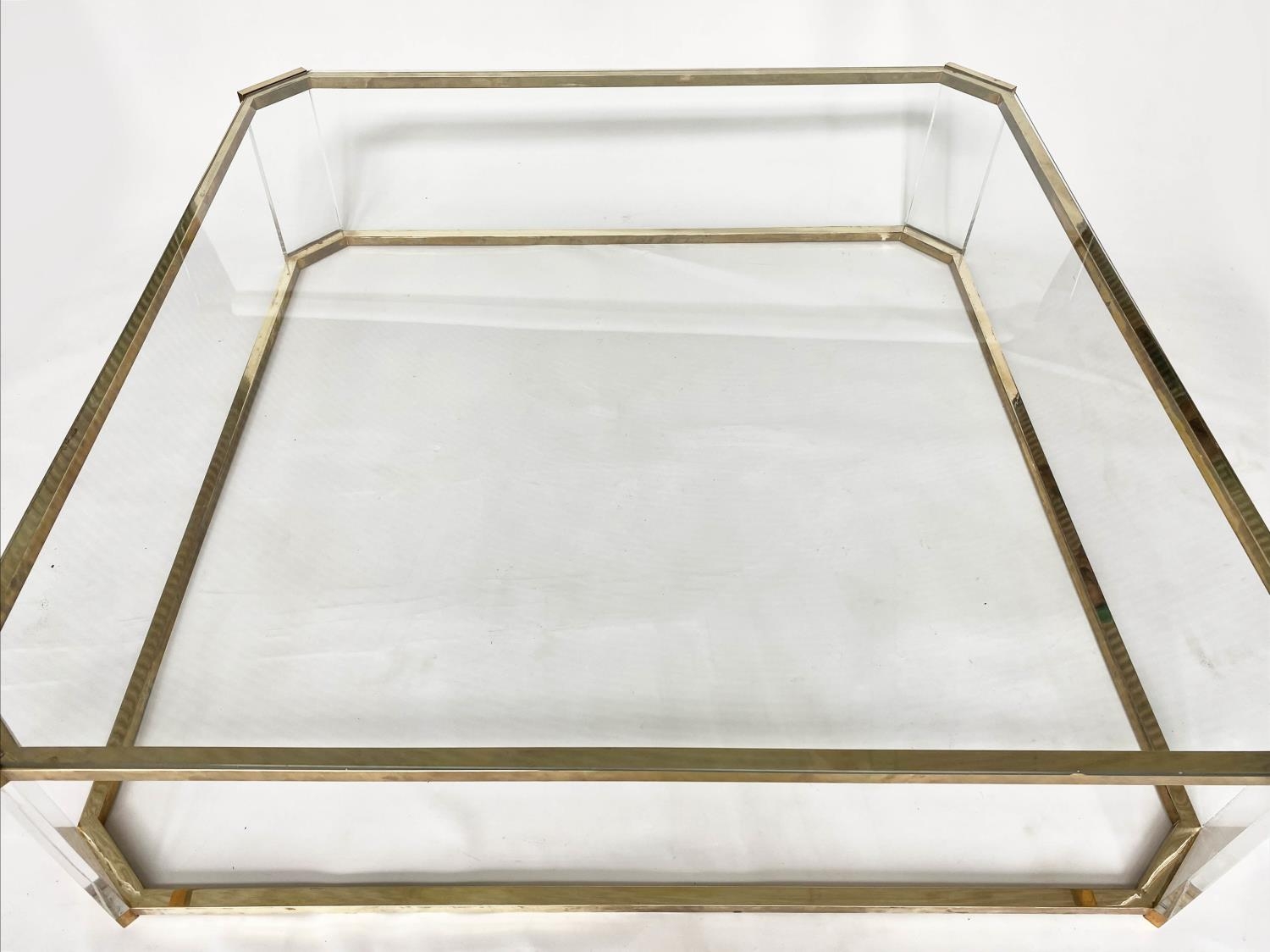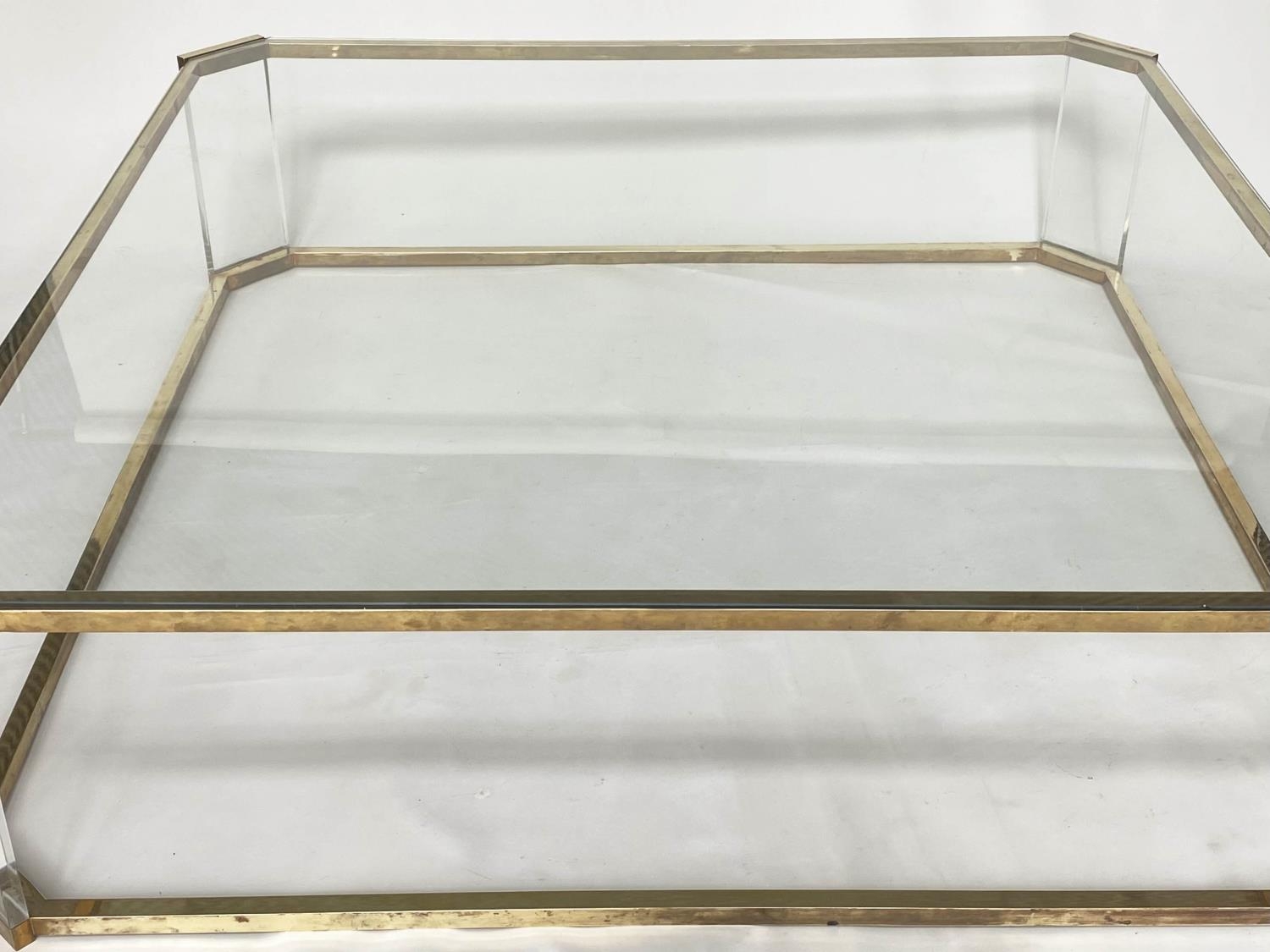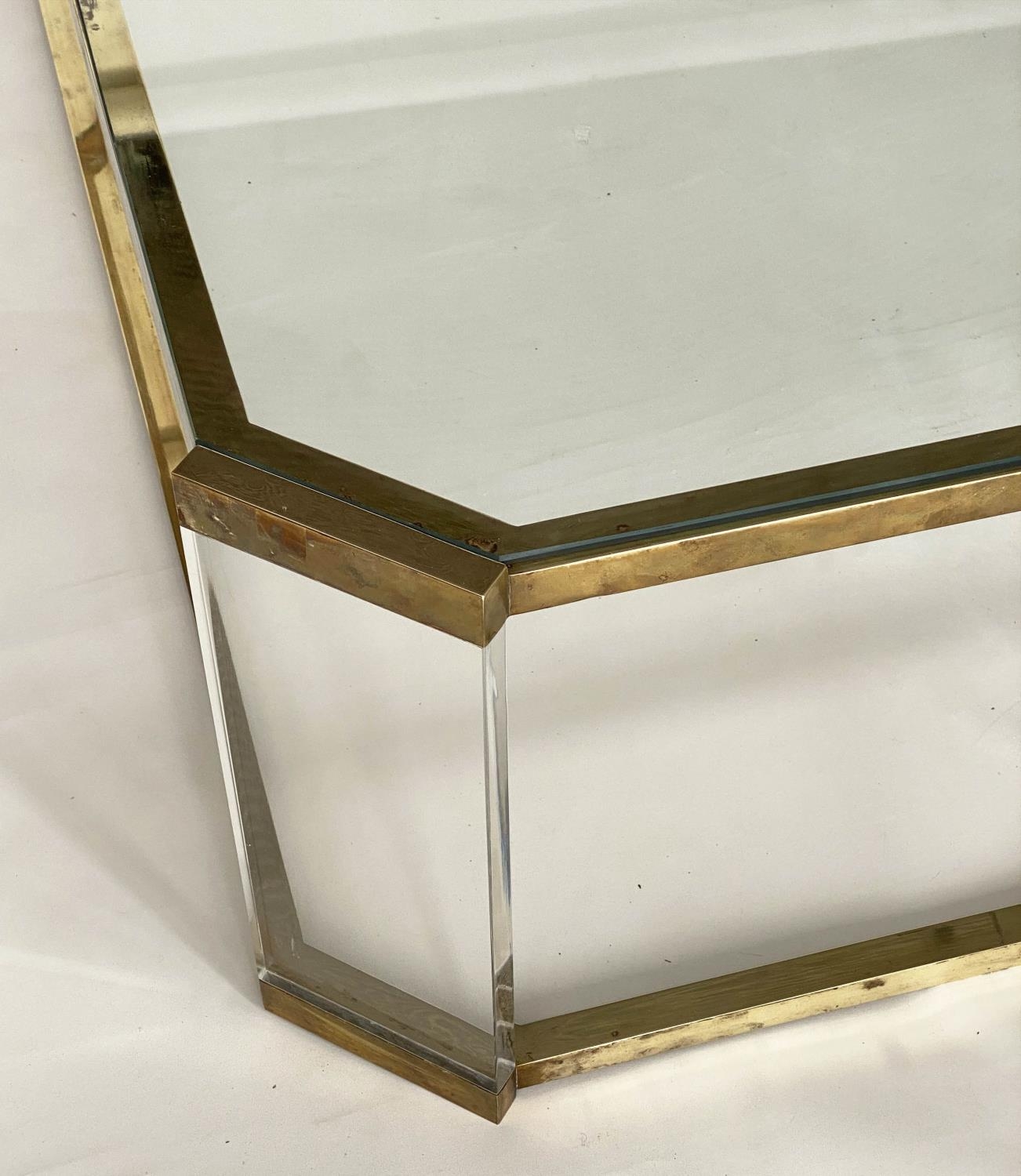 LOW TABLE, 1970's French octagonal glazed brass framed and lucite supports, 153cm x 153cm x 40cm H.