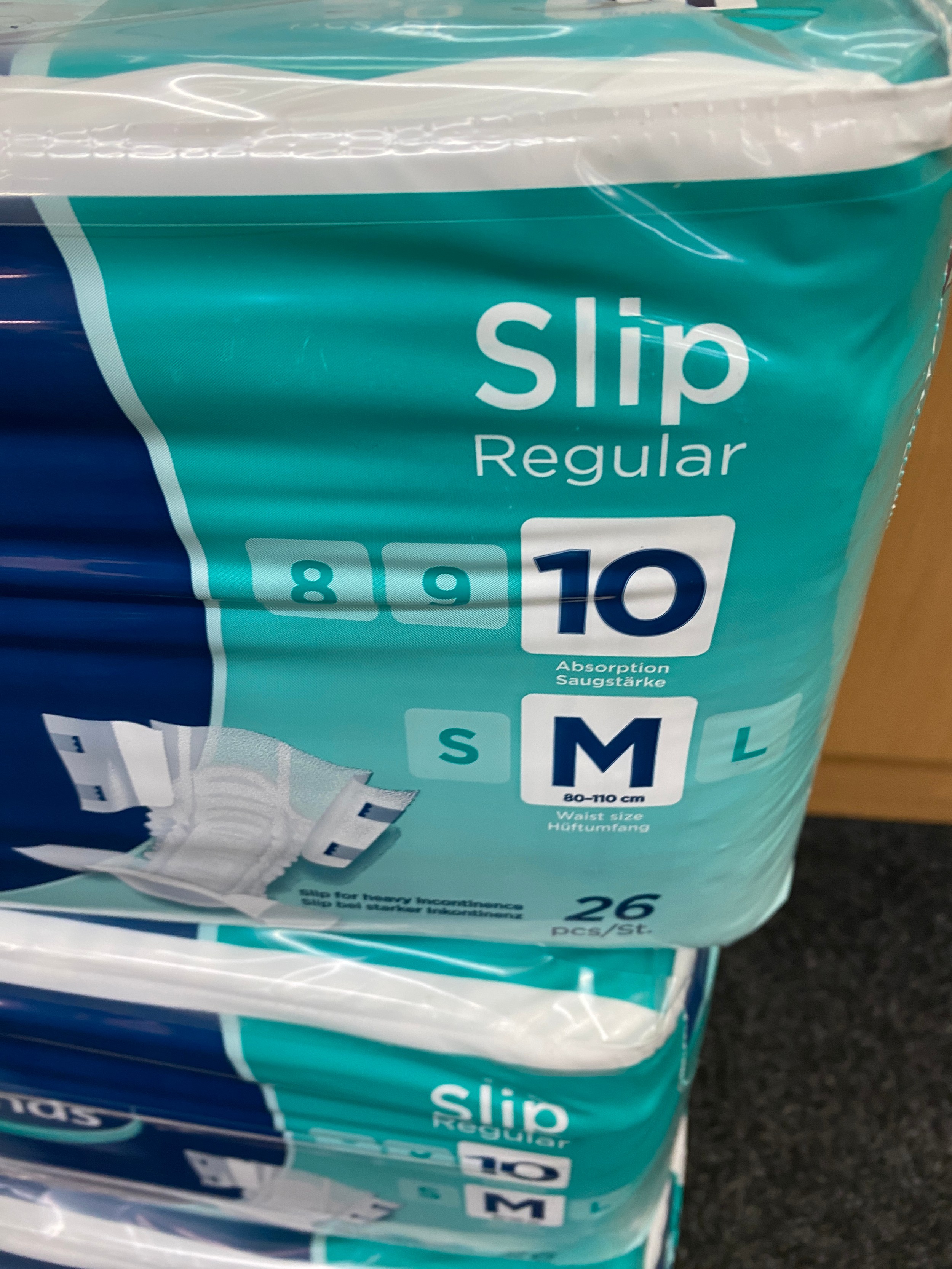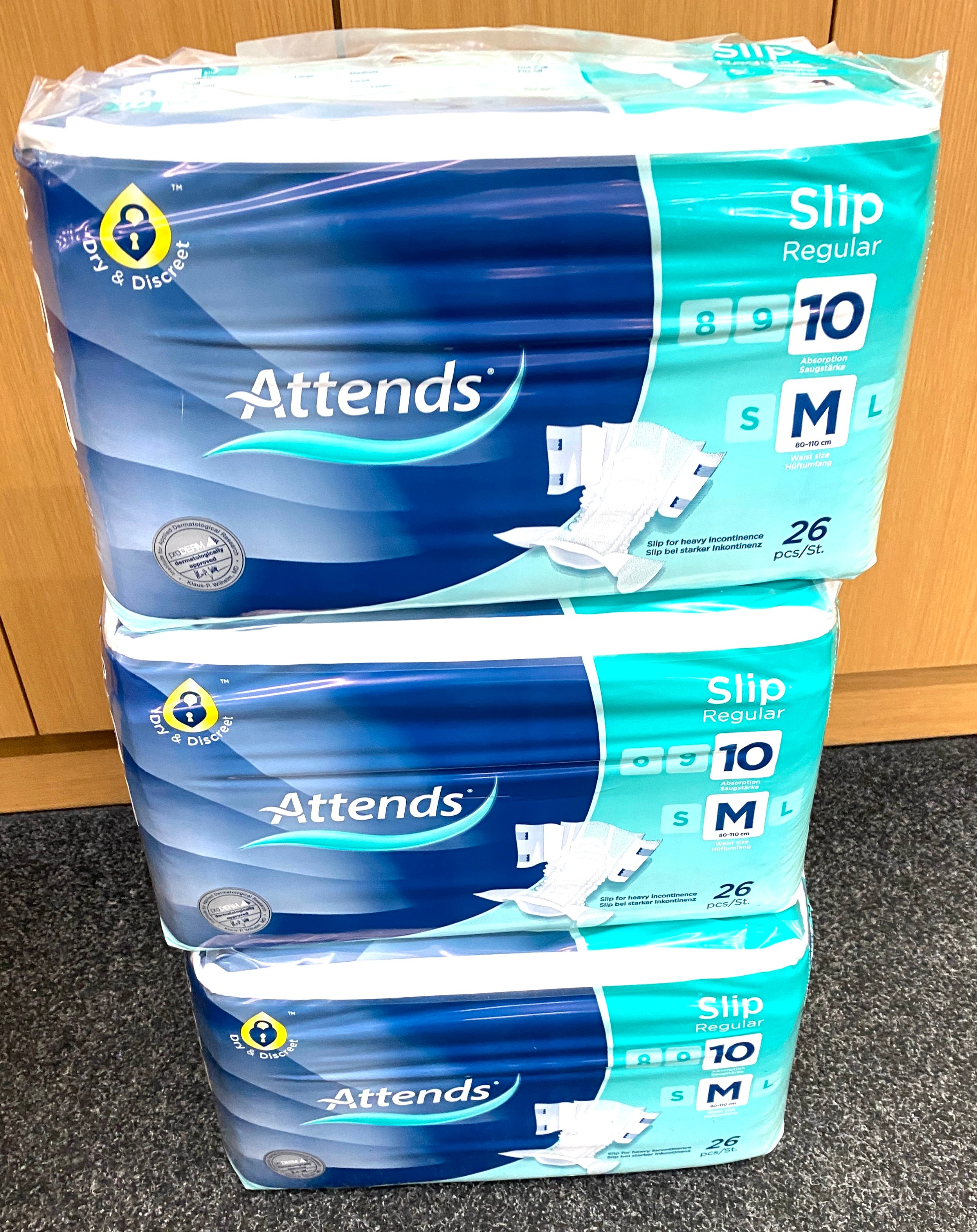 3 sealed packs of Attends slip regular incontinence pads, size M - each pack has 26