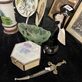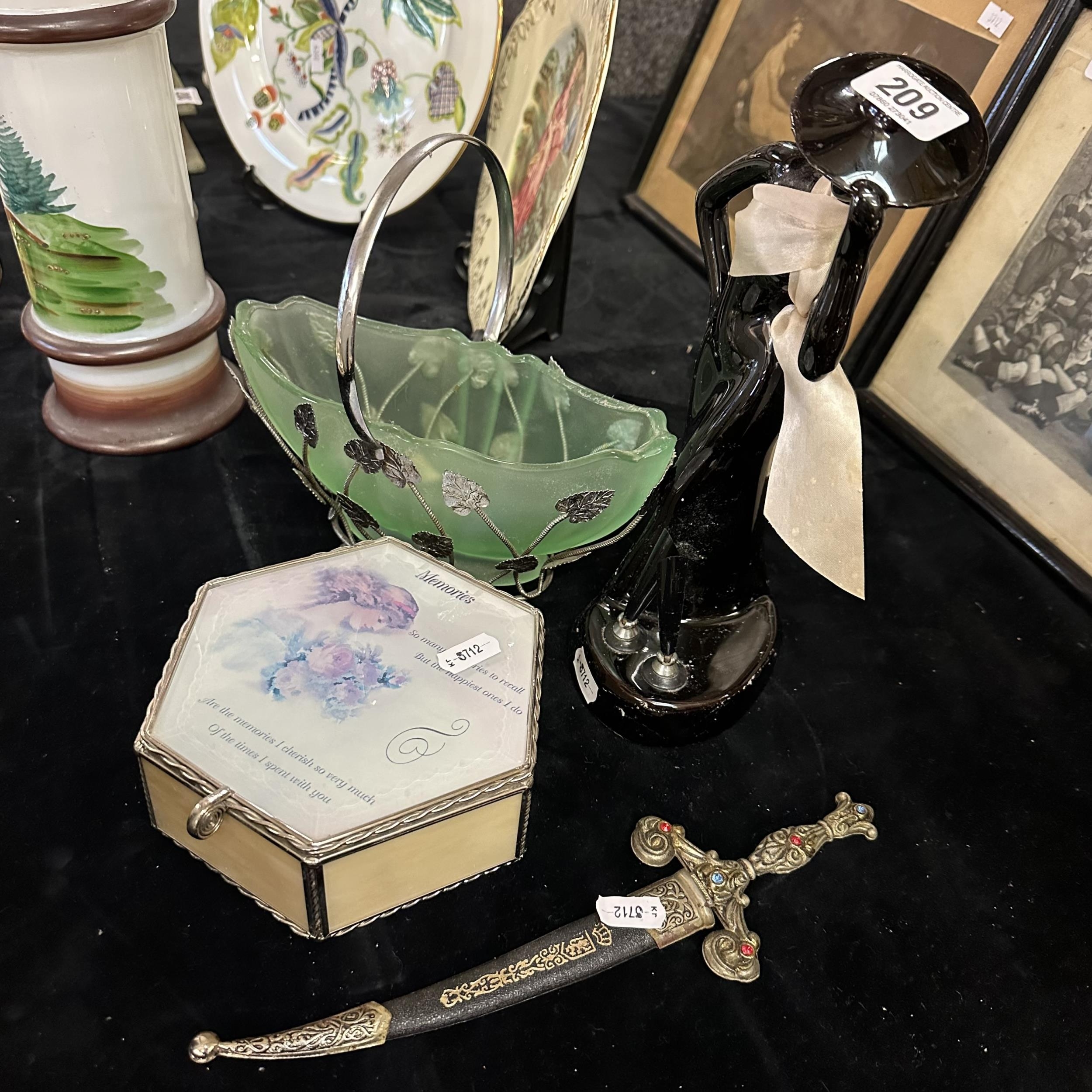 ART DECO ENGLISH SATIN GREEN GLASS BASKET BAGLEY EVESHAM POSY SILVER METAL LEAF WITH MEMORY BOX, PENHOLDER AND LETTER OPENER