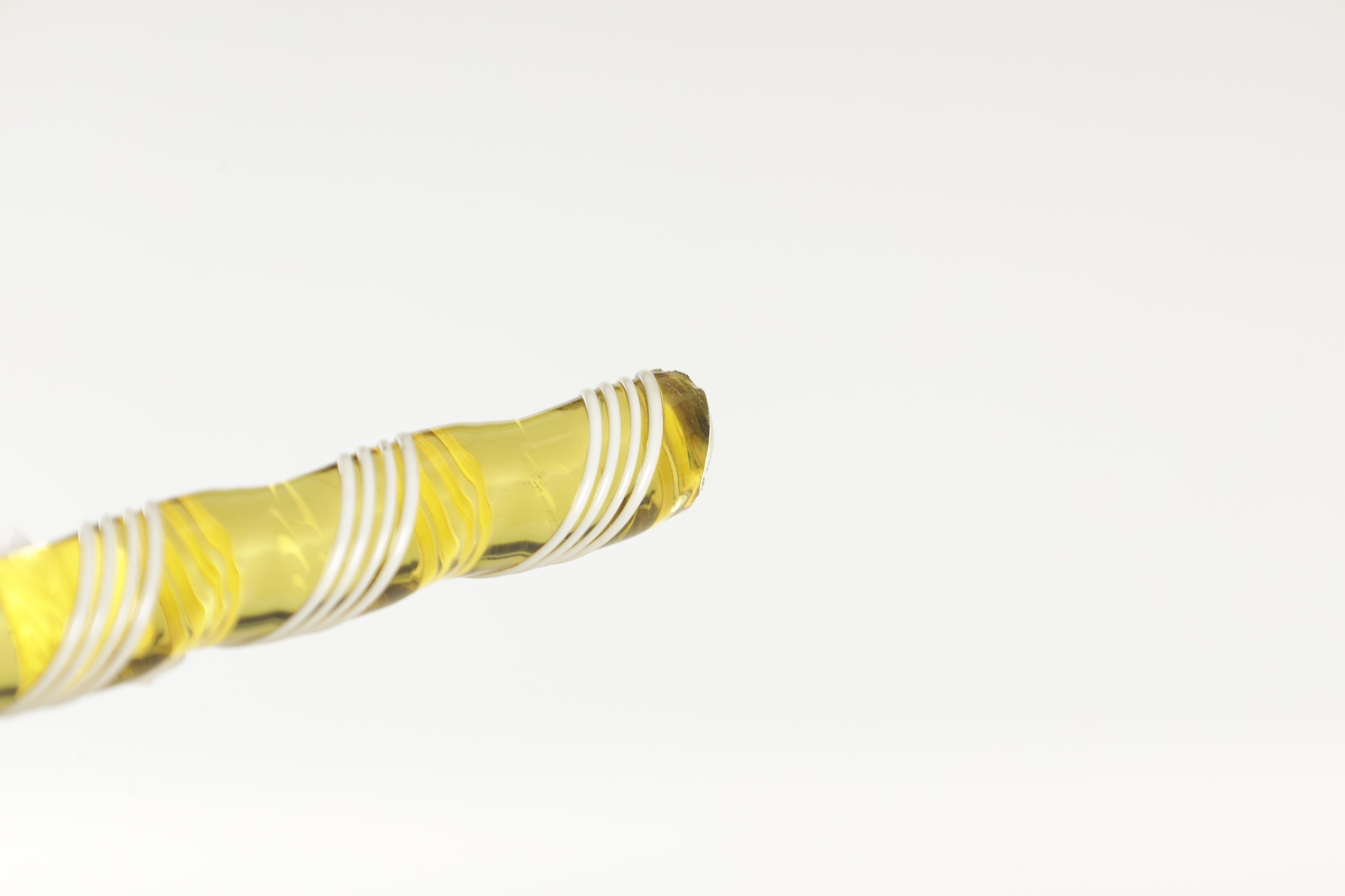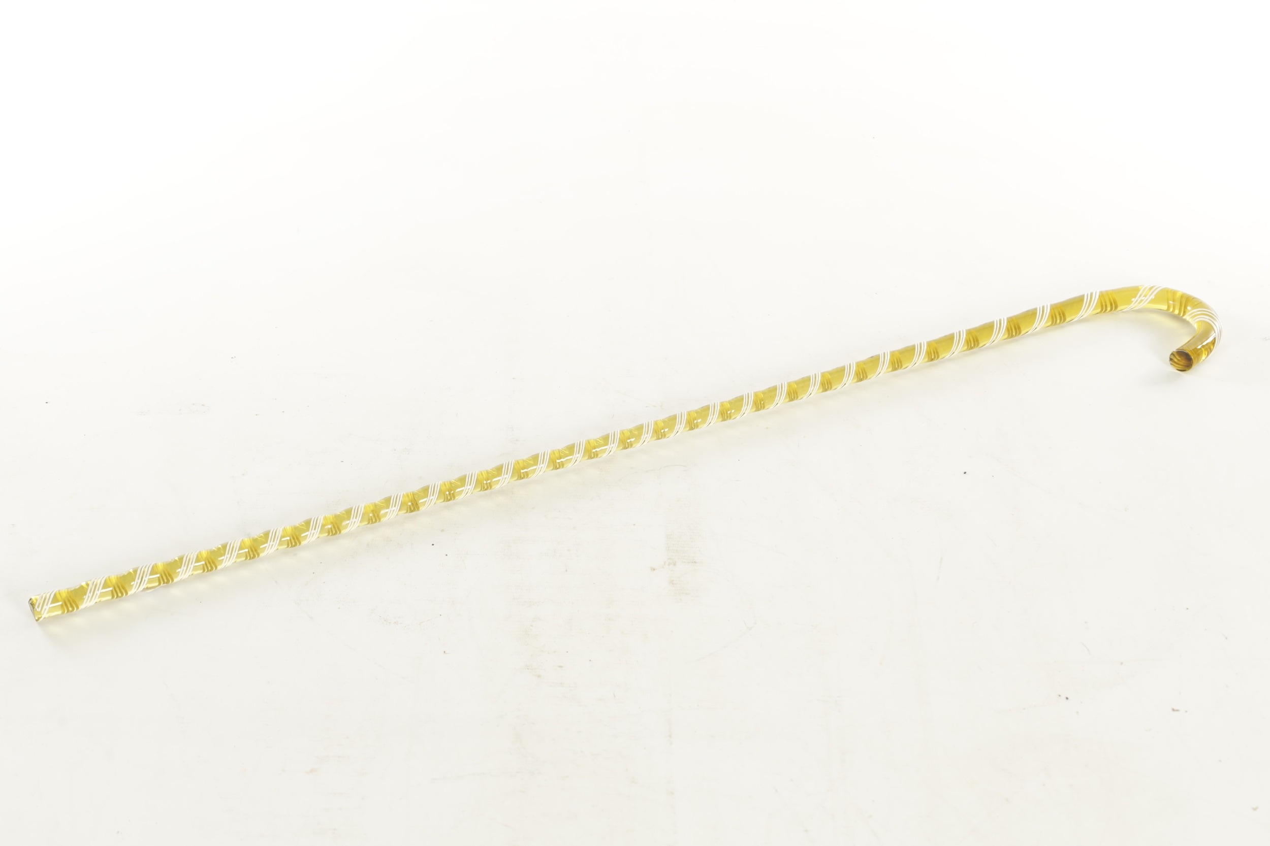 A LATE 19TH CENTURY CONTINENTAL AMBER GLASS WALKING CANE the crook handle and tapering shaft formed in translucent amber glass with applied white spiral trails throughout. (99cm long)