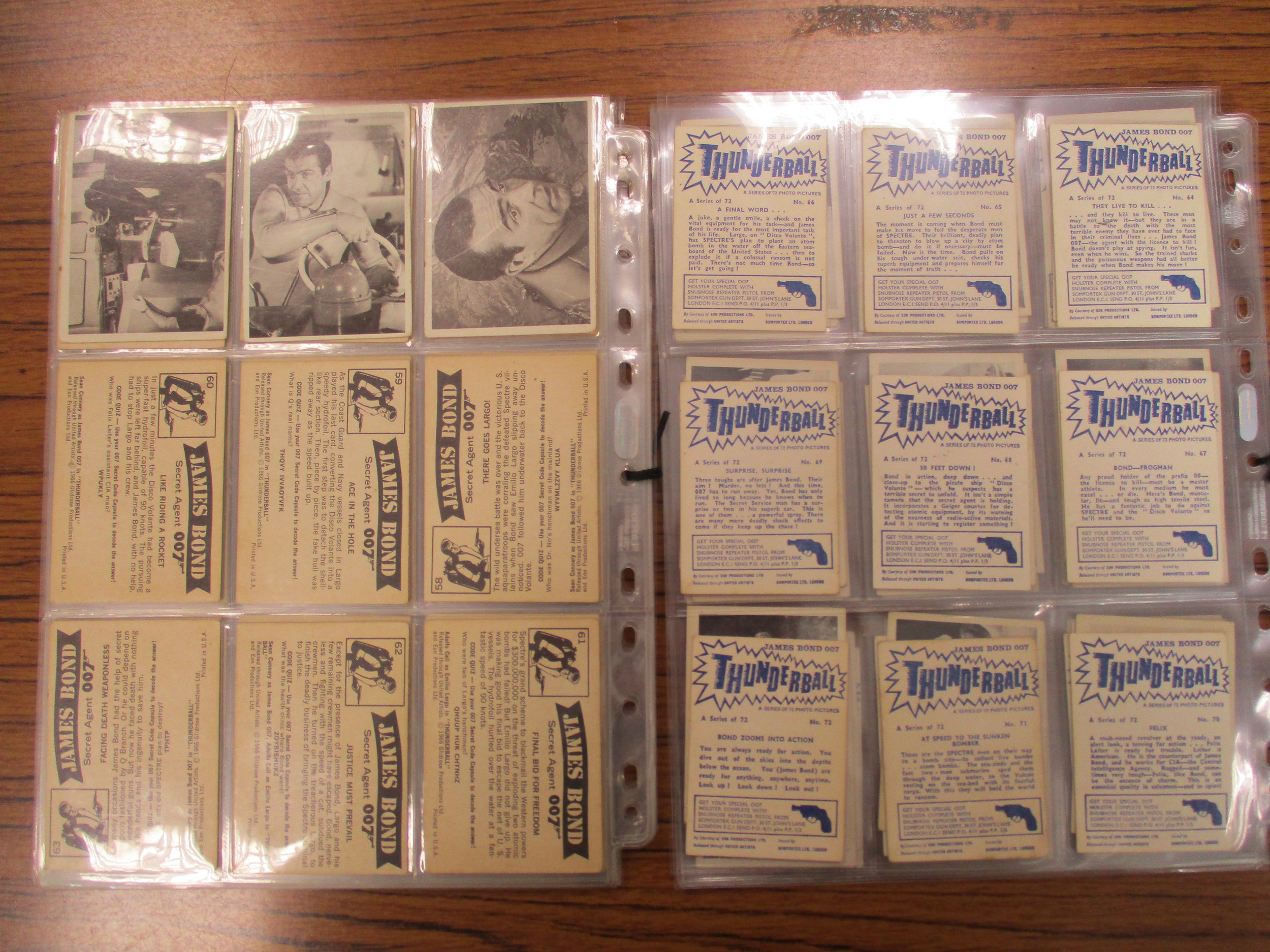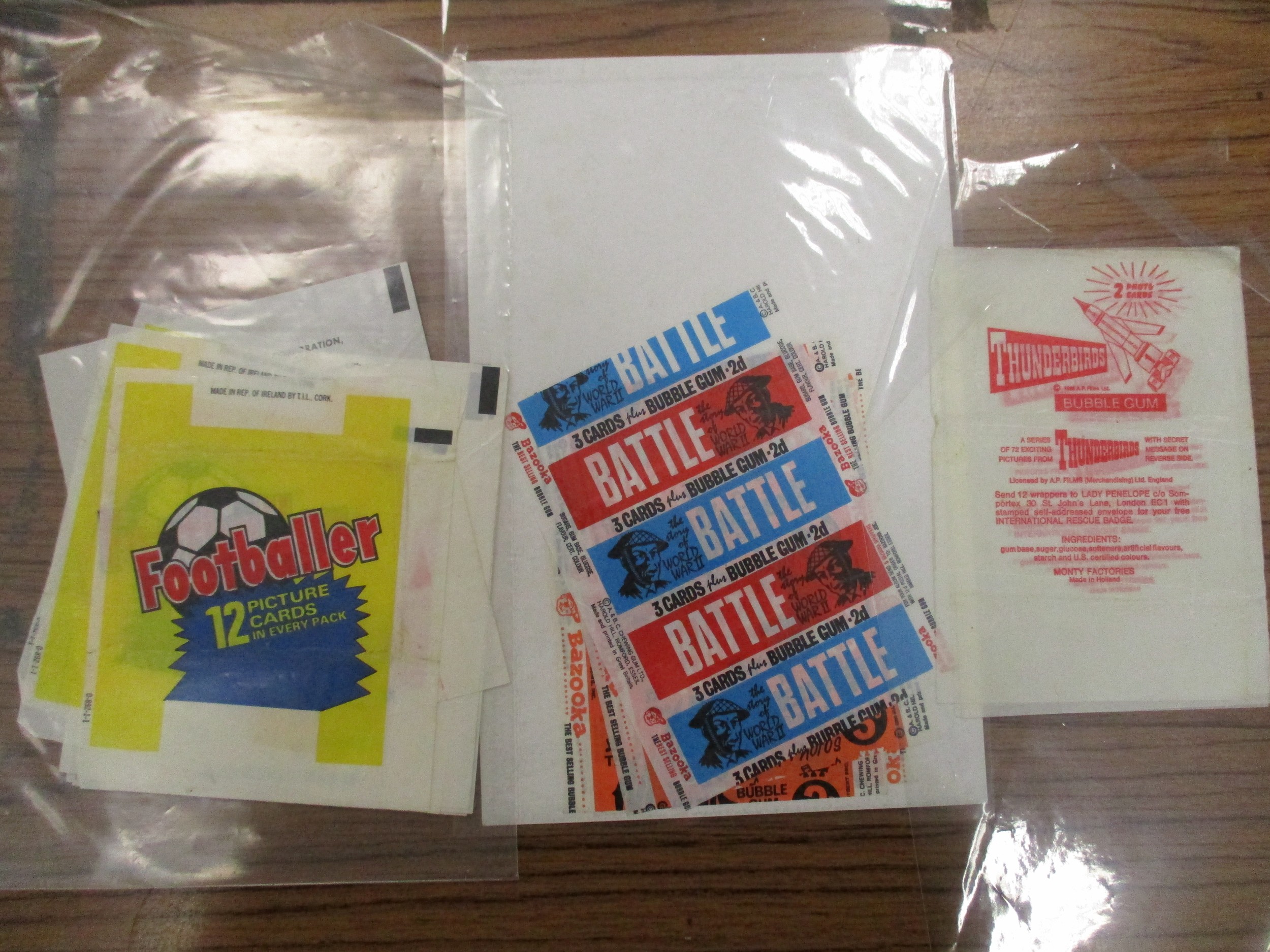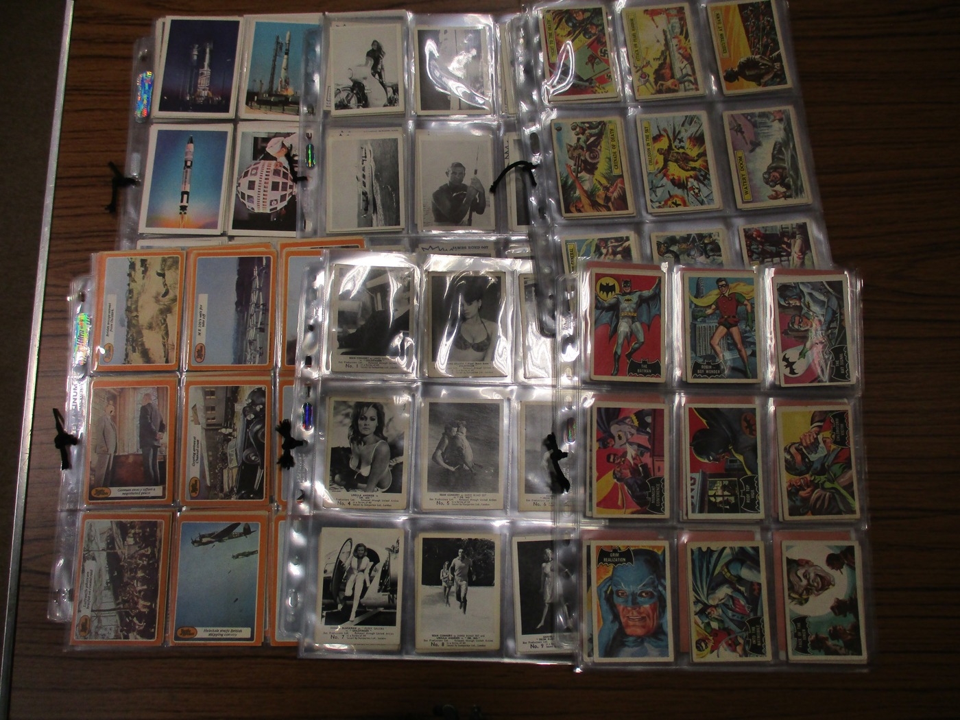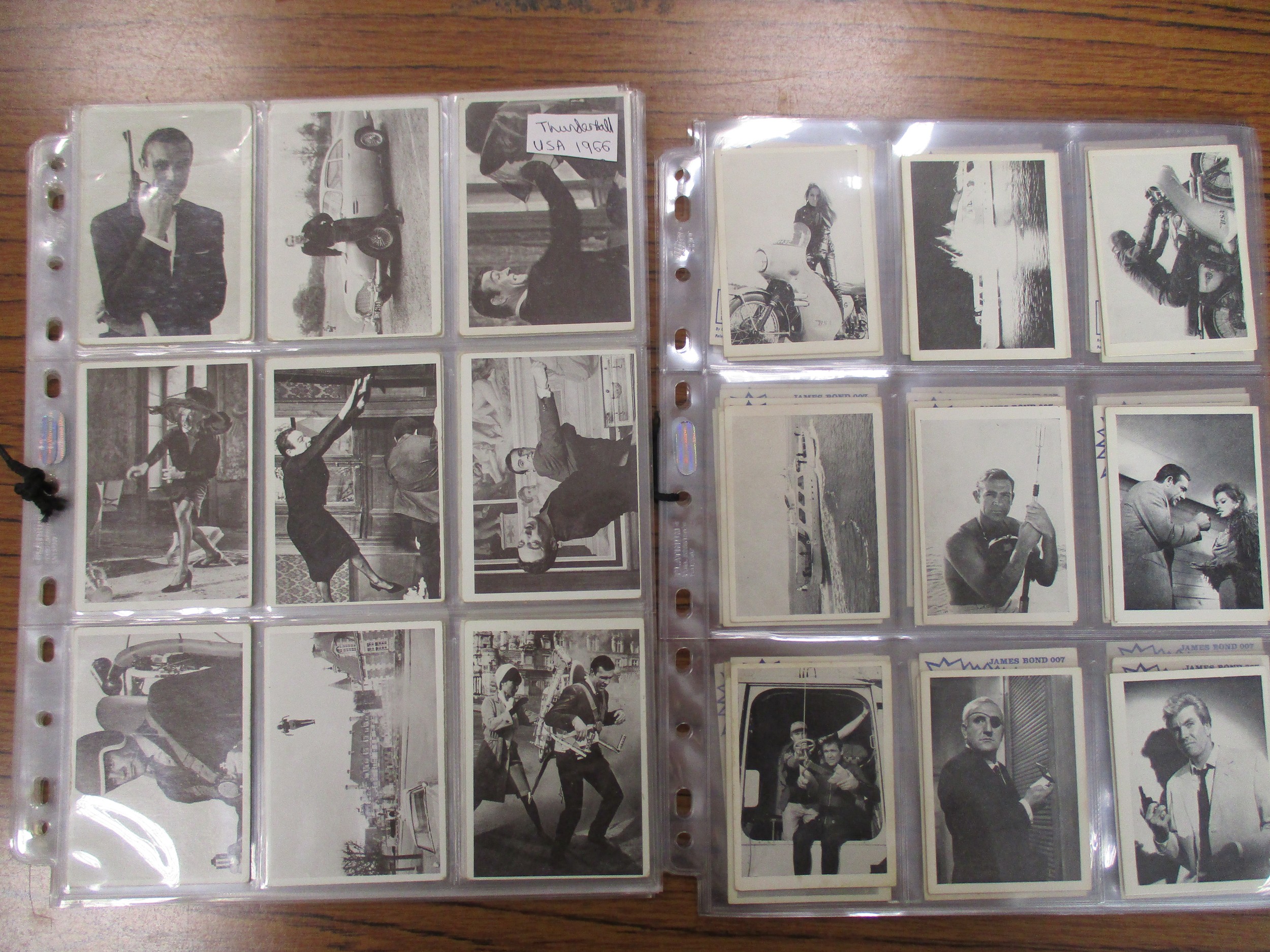 Collection of complete and part sets in plastic sleeves including A & B.C Batman pink back, Beatles ranges, Civil War News, Anglo Confectionary Captain Scarlett, Bubbles Inc Outer Limits, Somportex James Bond 007 Thunderball complete sets, Thunderbirds (B&W both sizes with one set incomplete), Topps Beatles Series 3, etc, plus wax gum wrappers, generally good plus packaging. Qty 1,800 approx (B)