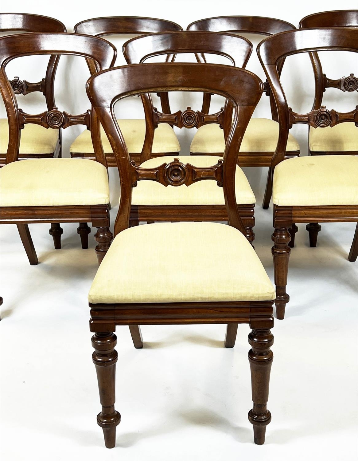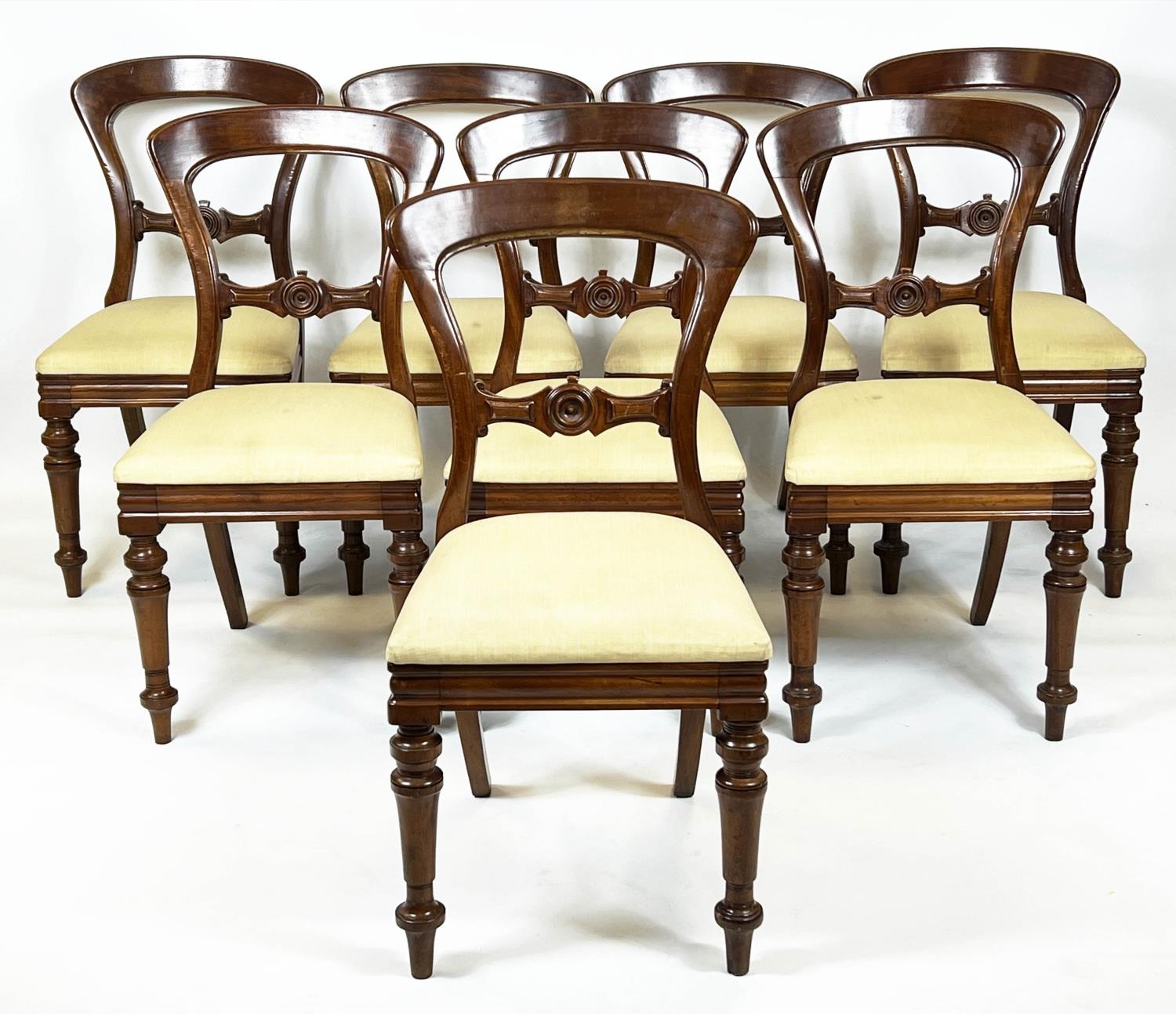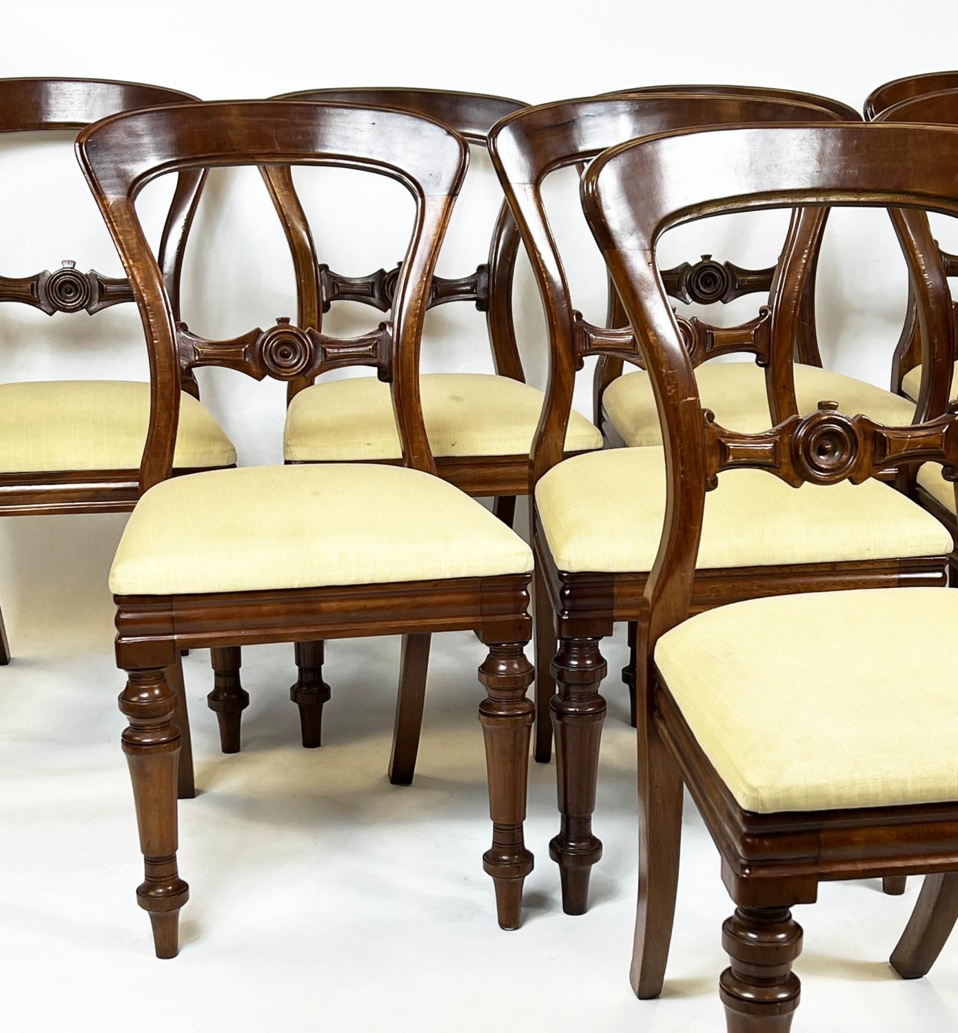 DINING CHAIRS, 87cm H x 47cm, a set of eight, Victorian mahogany with cream drop in seats, stamped J Reilly's patent. (8)