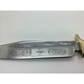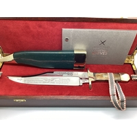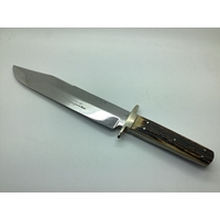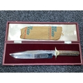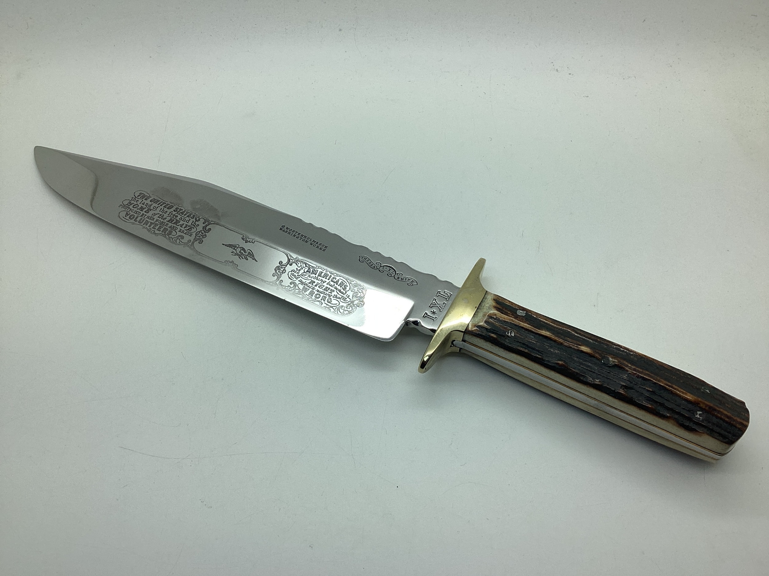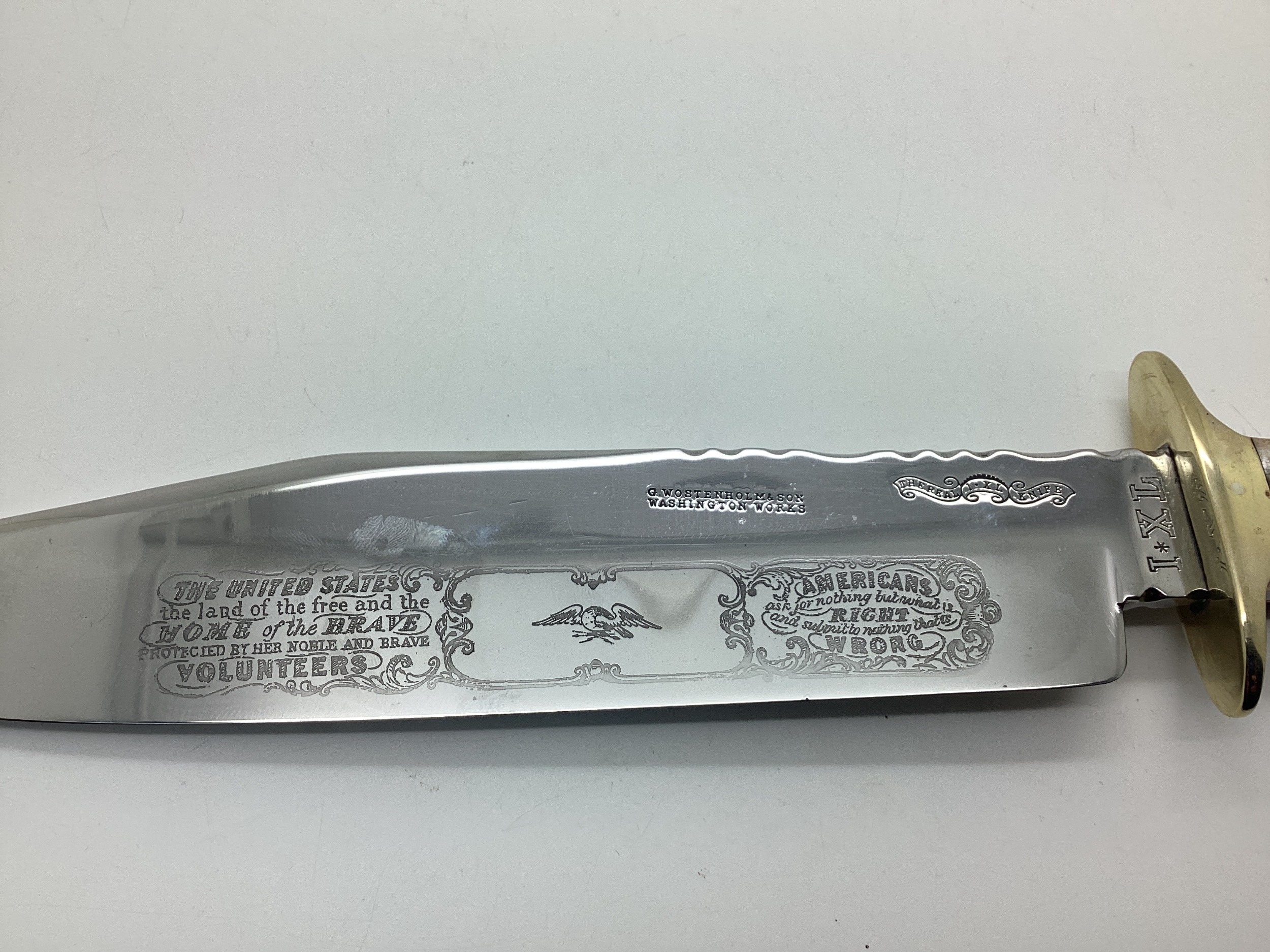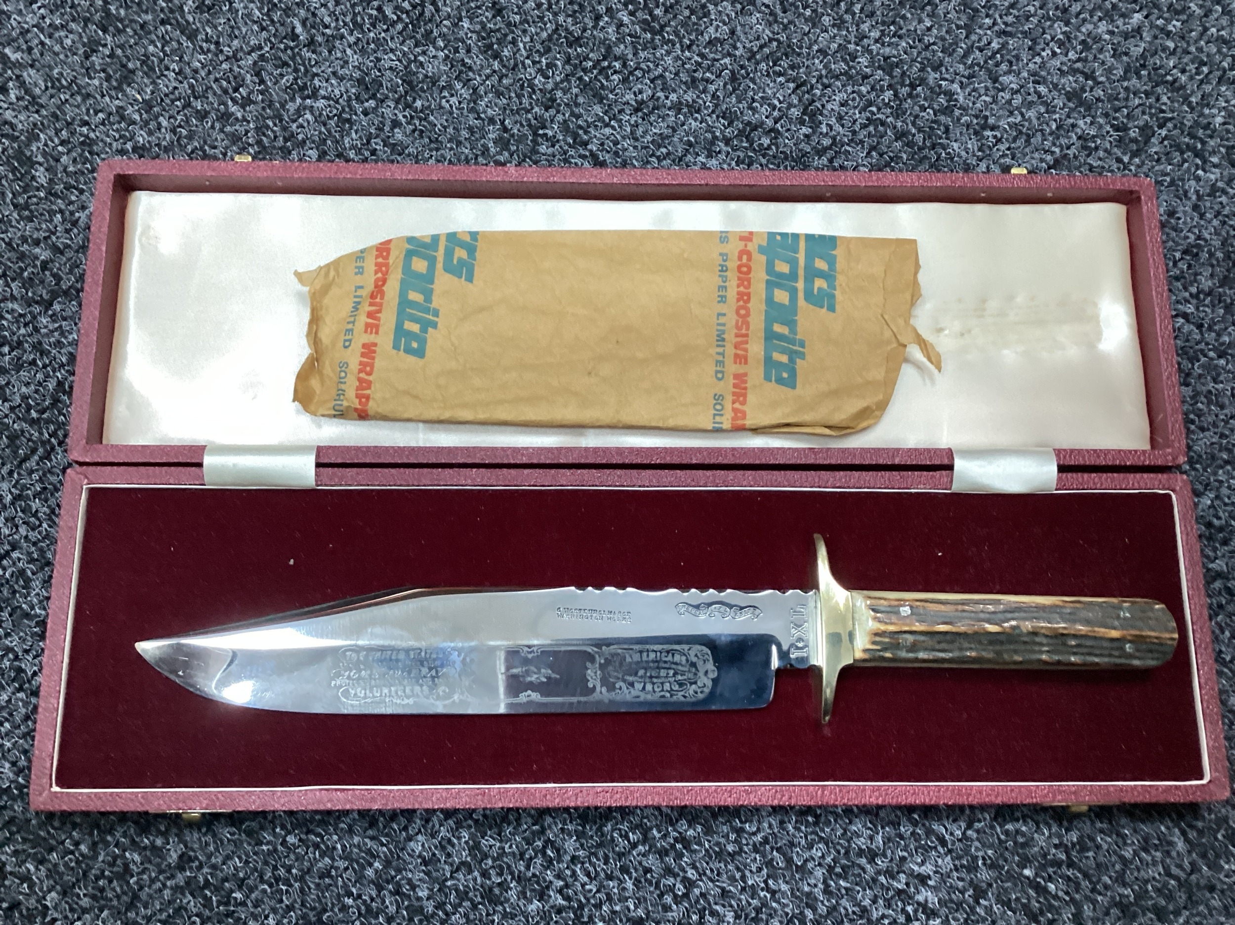 Bowie Knife George Wostenholm & Son Ltd Washington Works, detailed 'The Land of The Free and The Home of The Brave..', stag handle, 37.5cm long, fitted 'I.XL' case.
