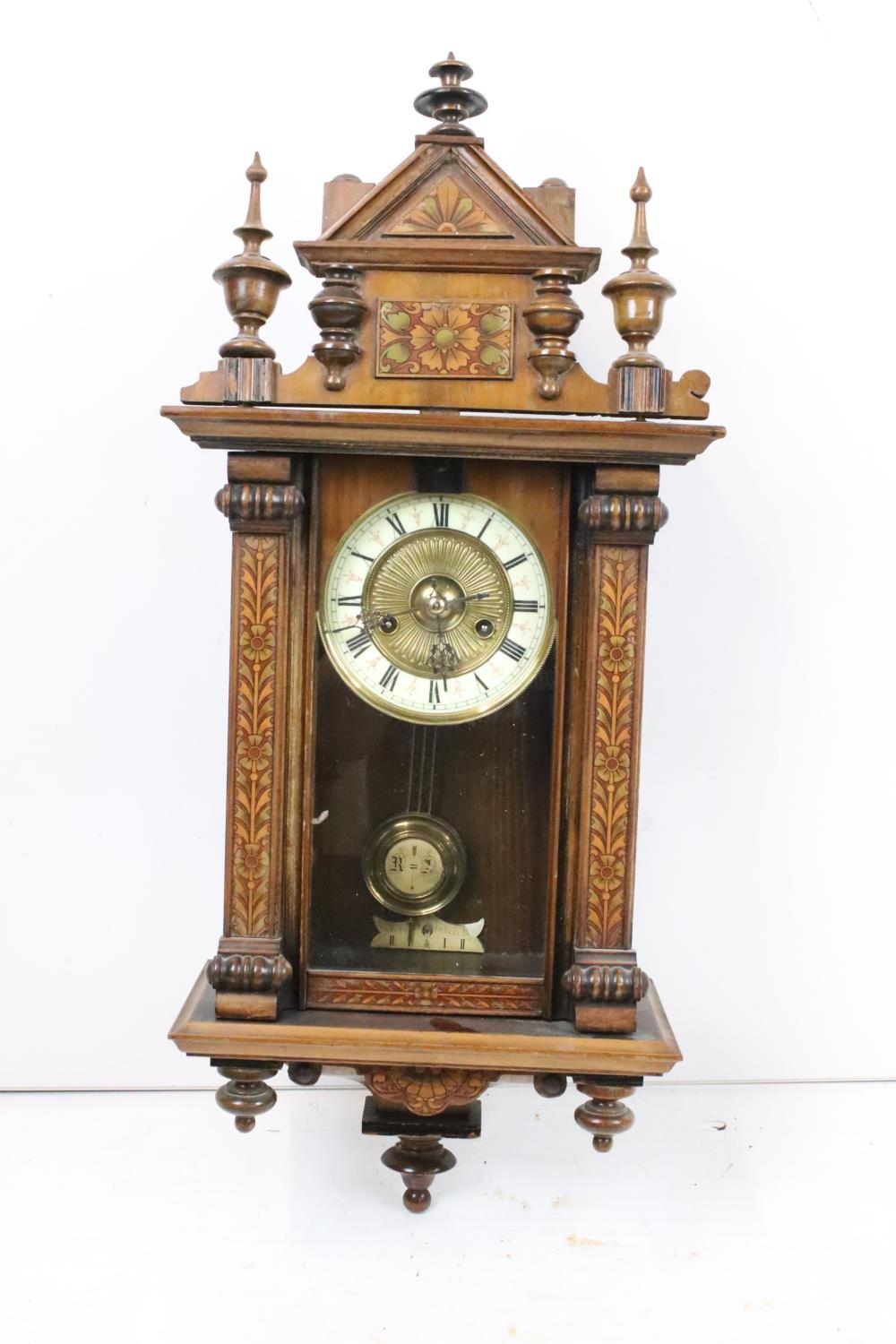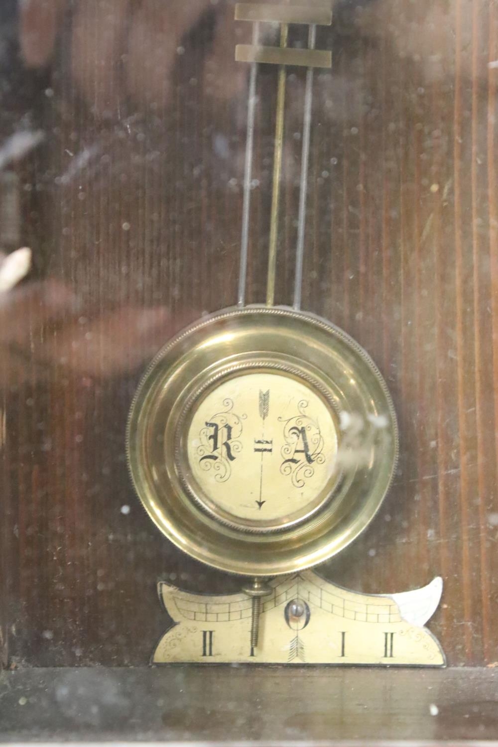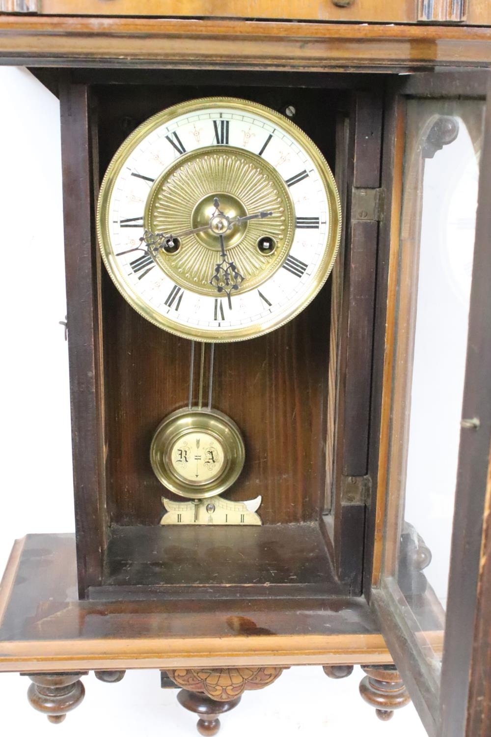 An antique wooden cased wall clock with brass and enamel dial, Roman numeral markers, complete with pendulum.