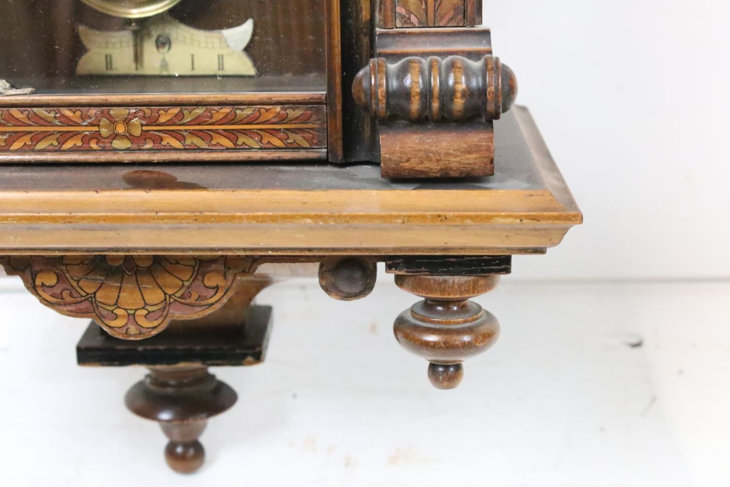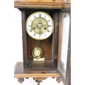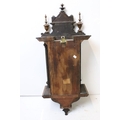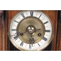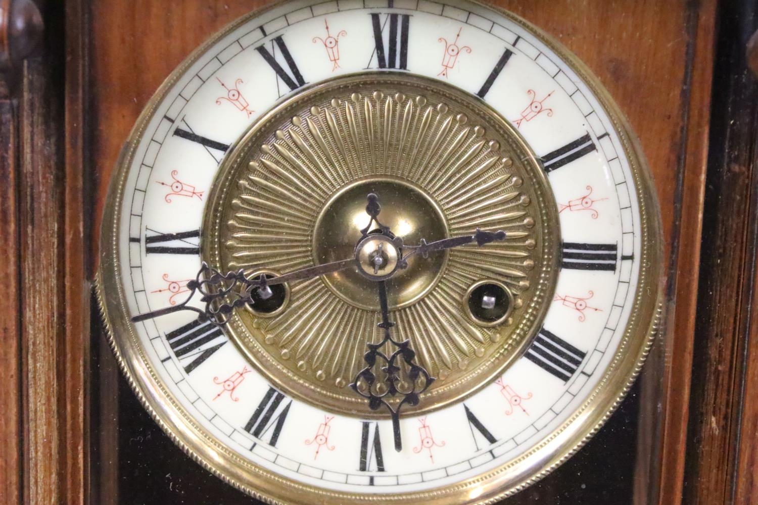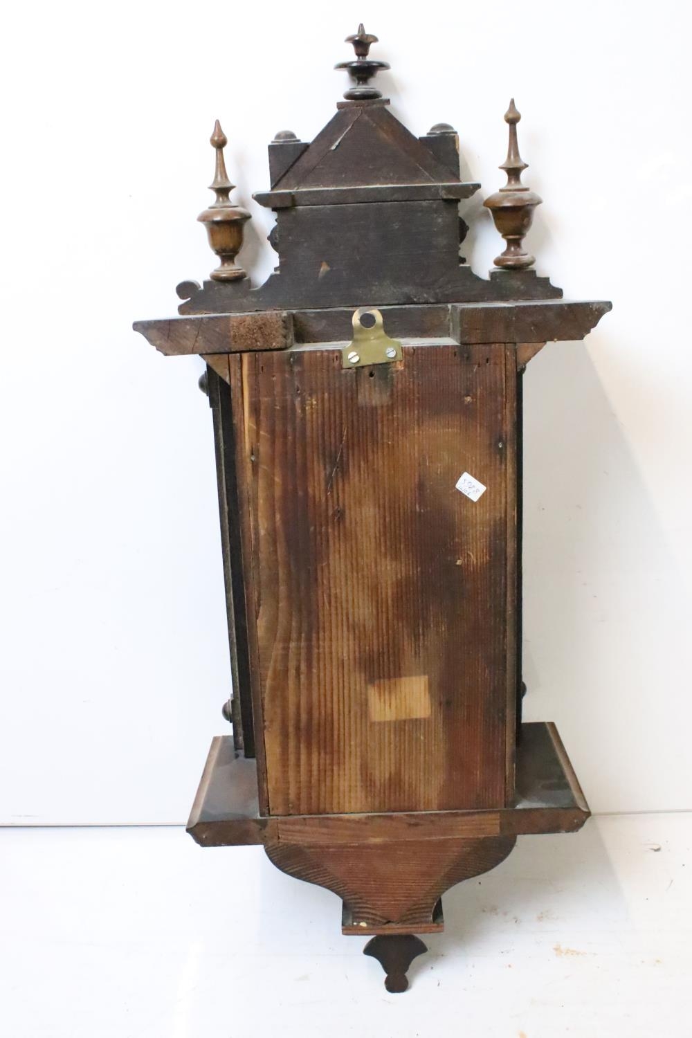 An antique wooden cased wall clock with brass and enamel dial, Roman numeral markers, complete with pendulum.