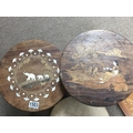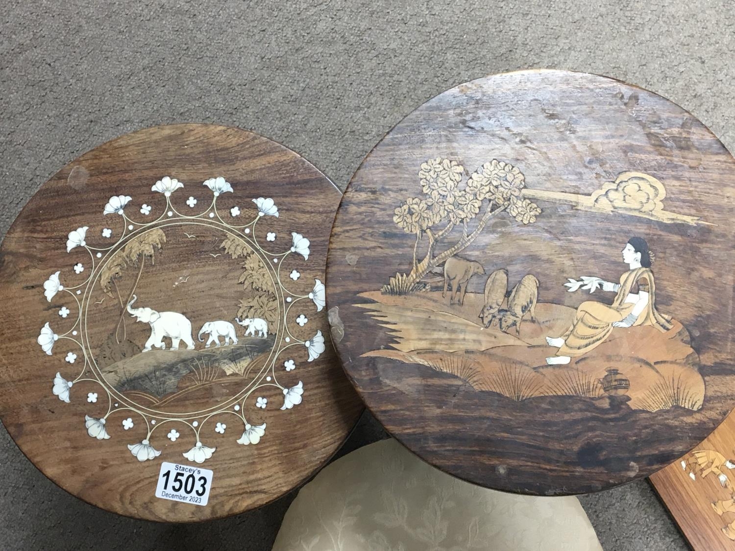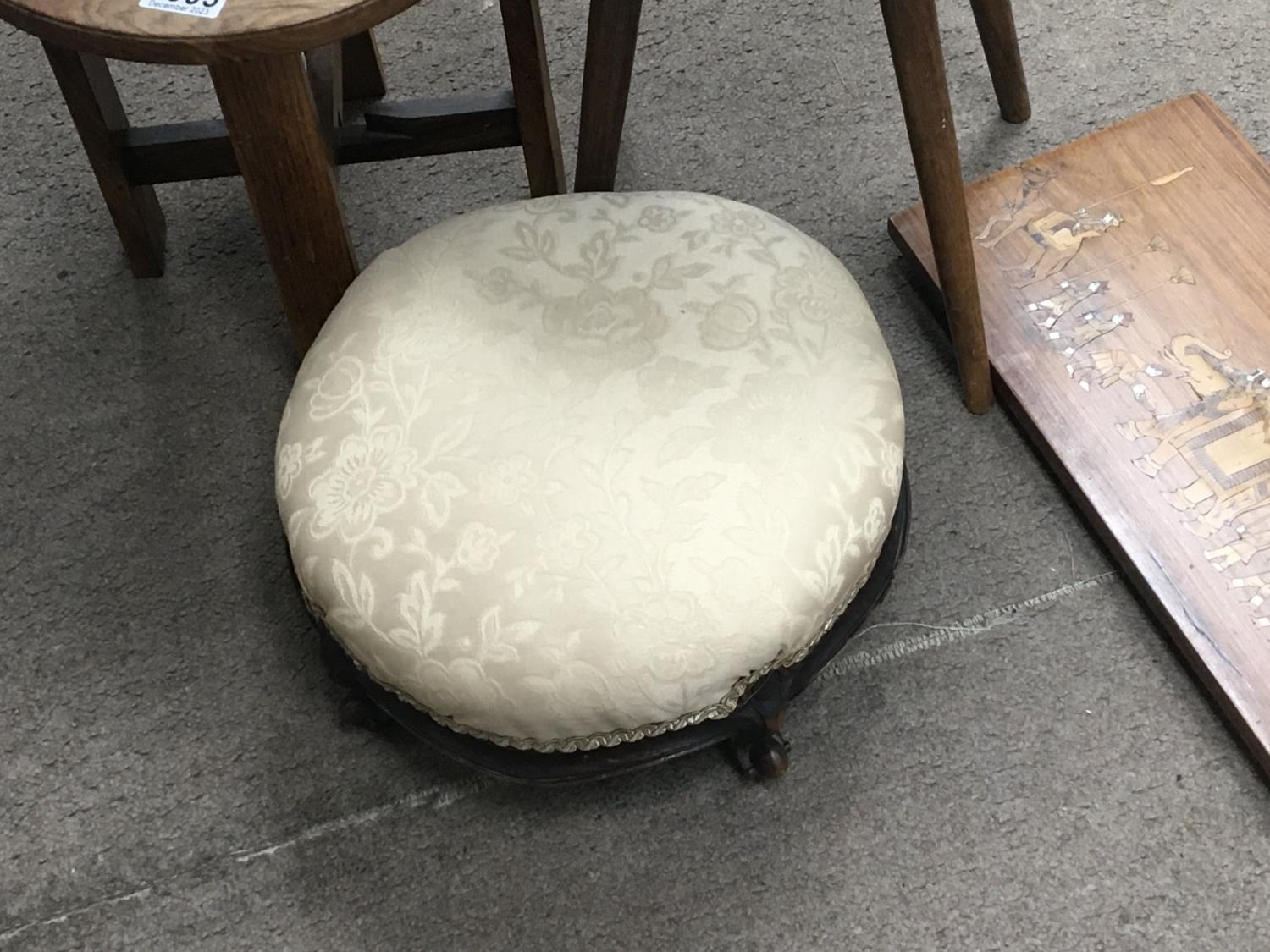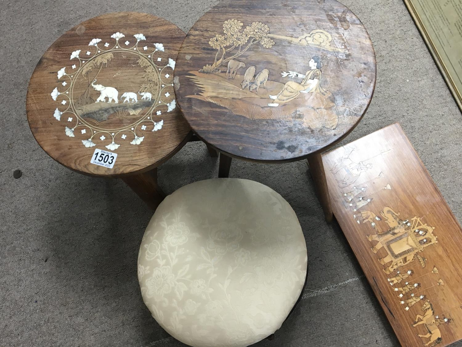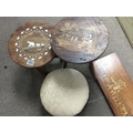 A small late Victorian foot stool two Indian hardwood tables and a conforming wall plaque (4)- NO RESERVE