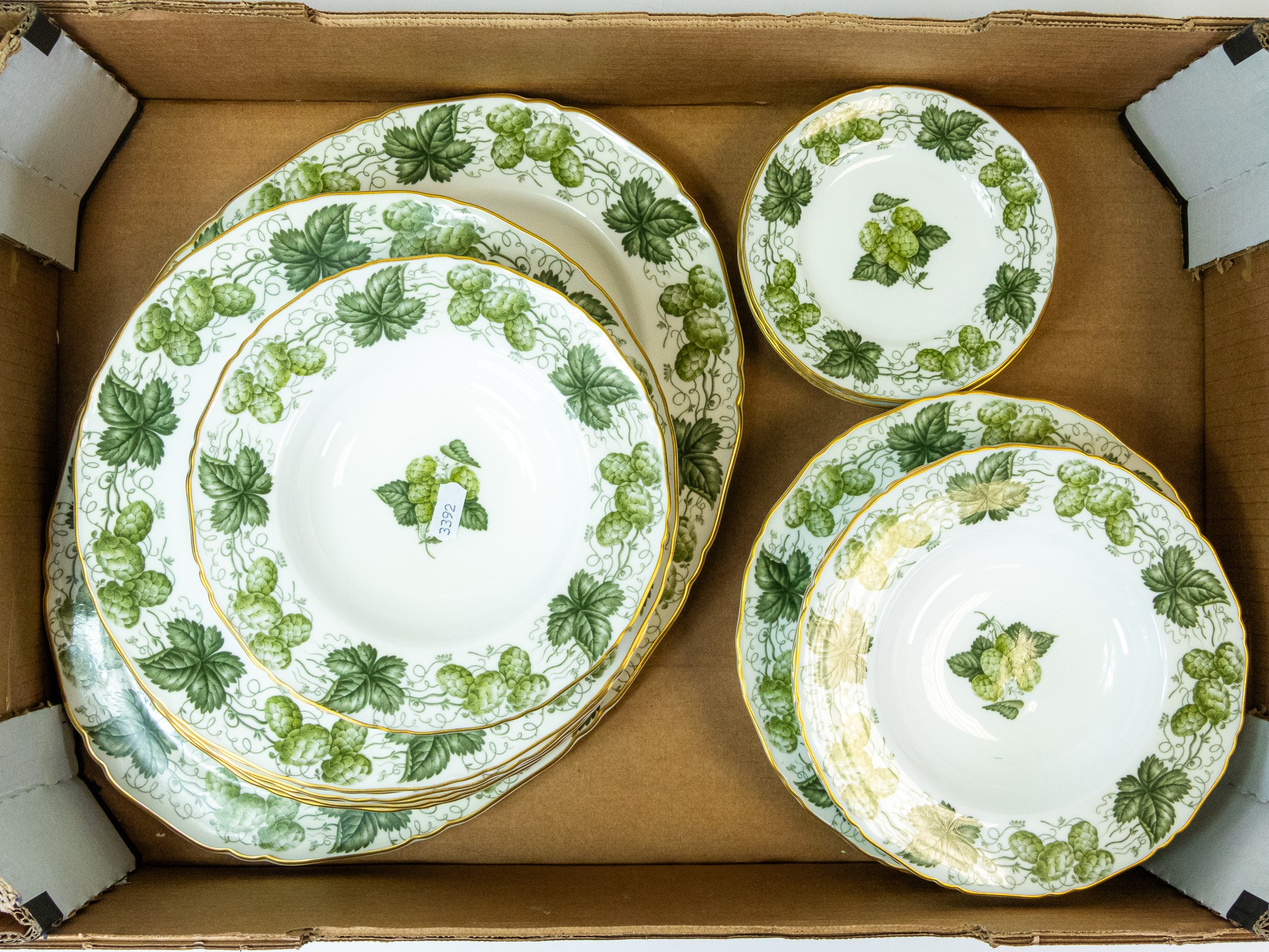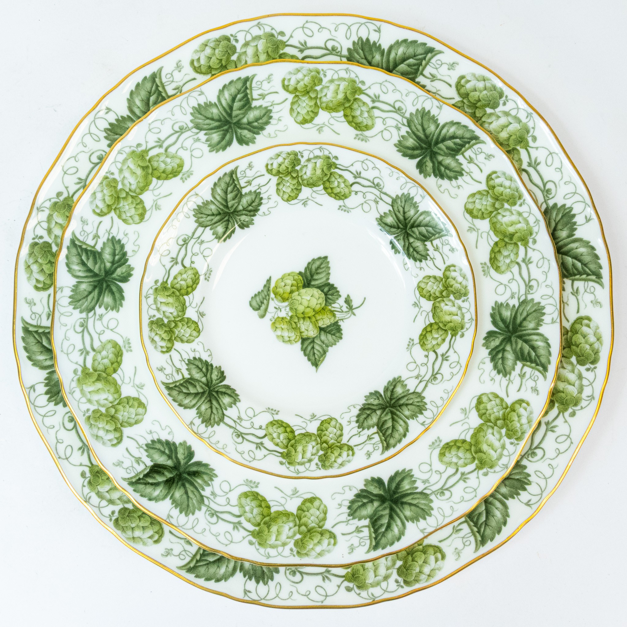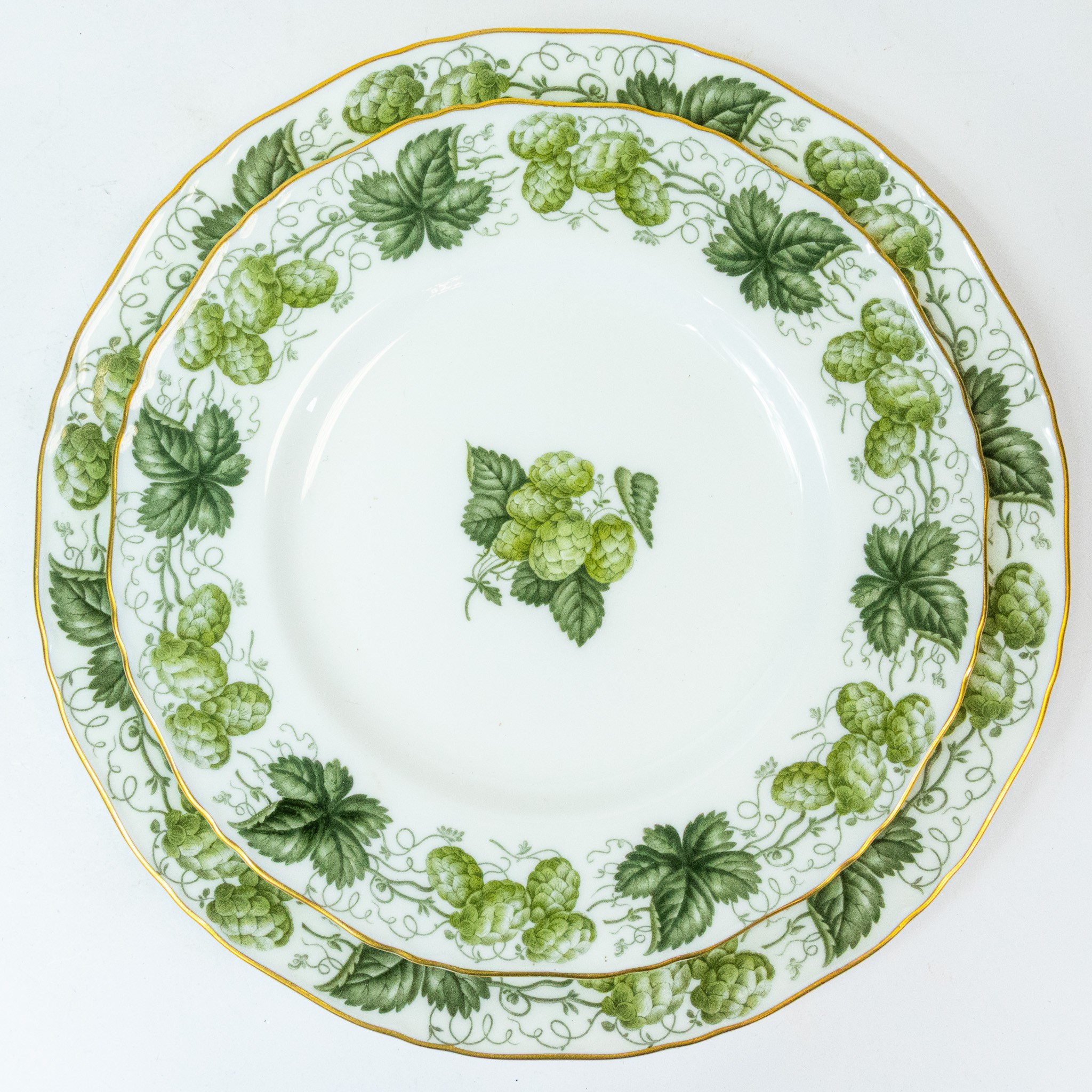 Royal Worcester ' Hop' green on white design to include:- large serving platter, eight dinner plates, eight salad plates, nine side plates, eight soup bowls (34 pieces) (1 tray)