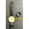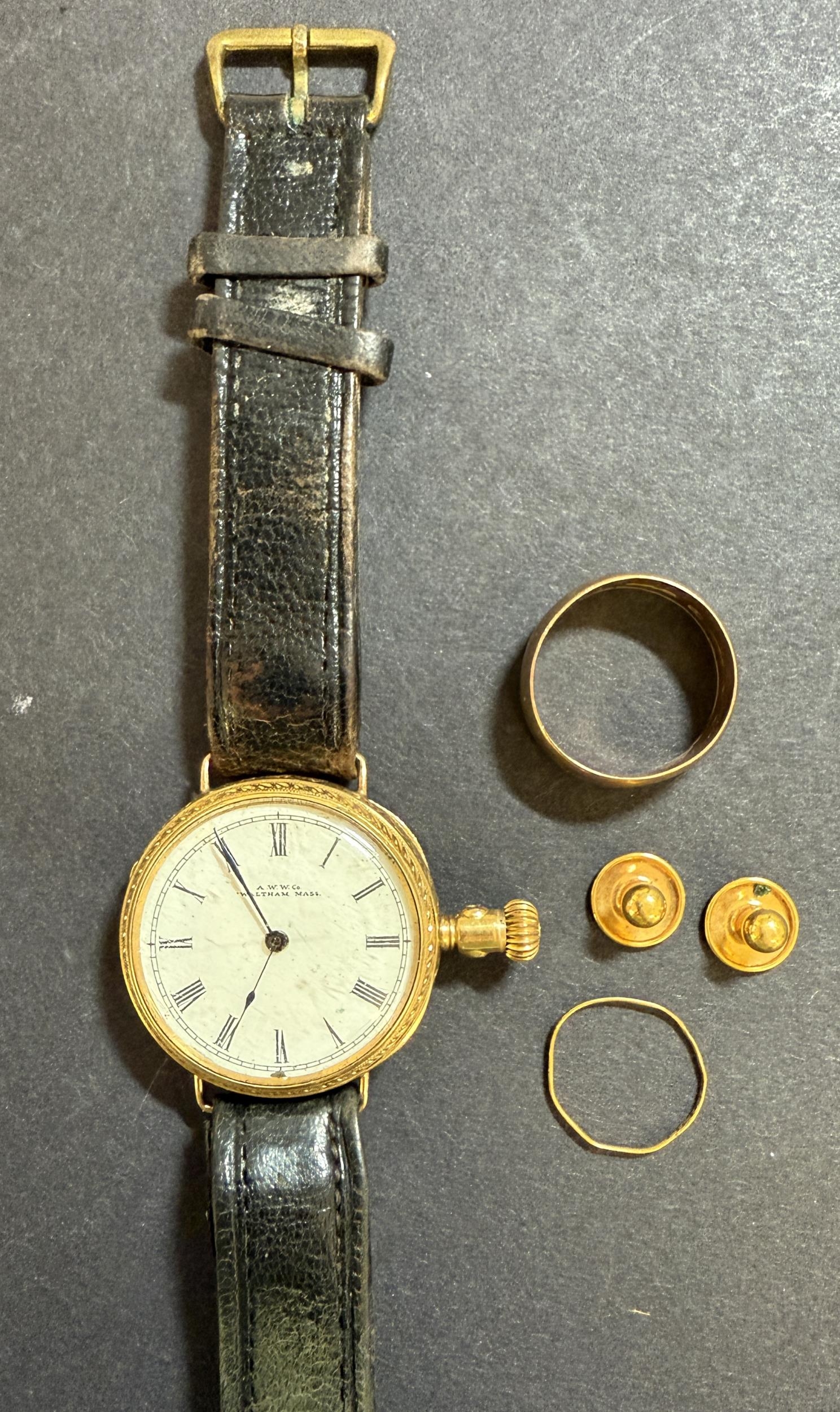 A group of 9ct jewellery 7g, plus Waltham wristwatch (19345) safety barrel, stamped 18c in case.